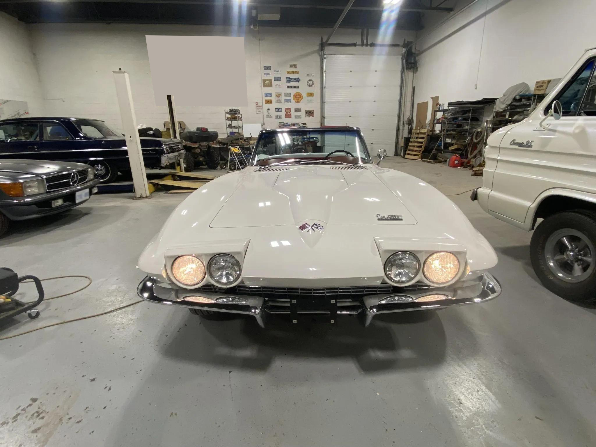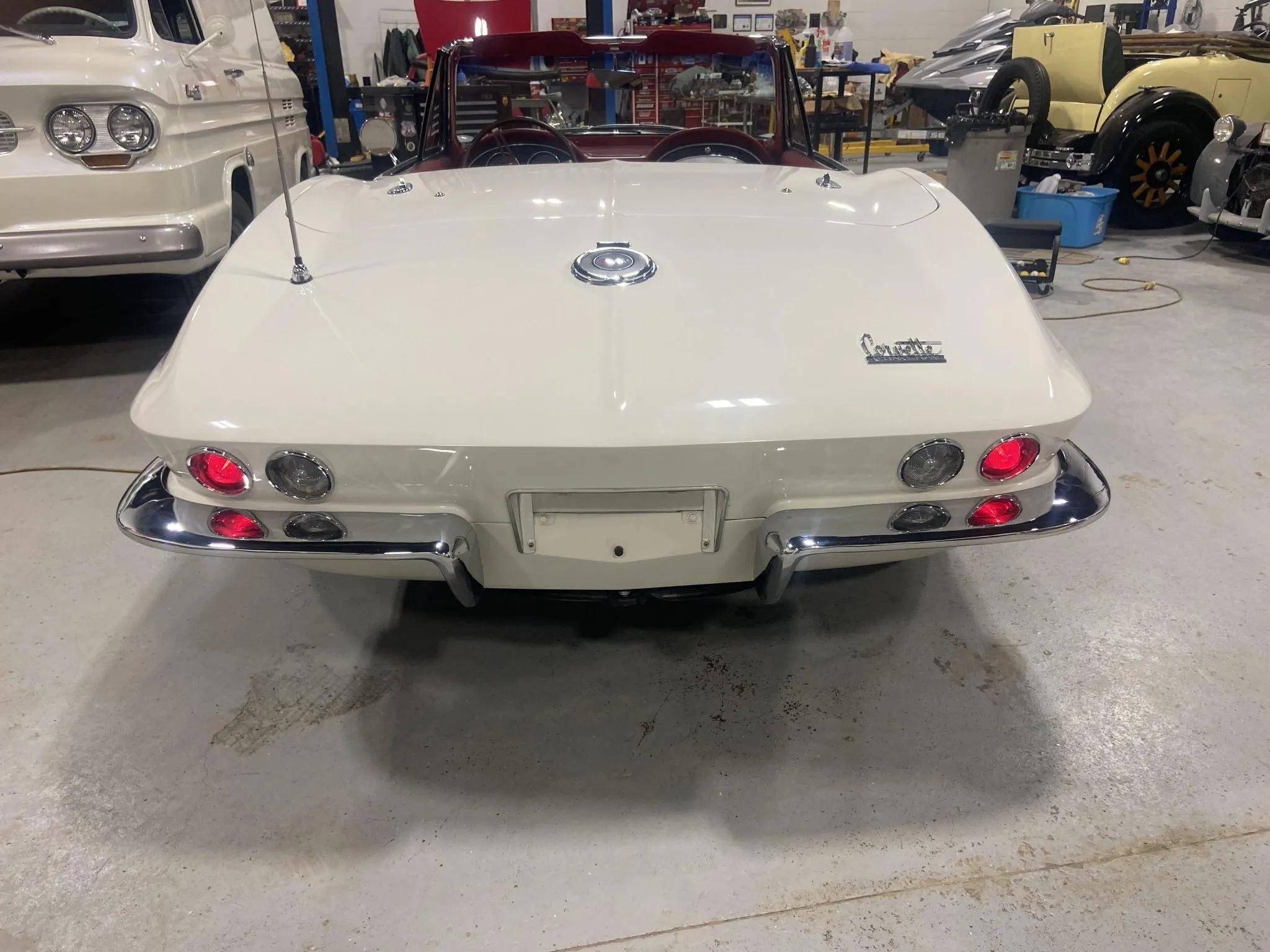 This 1966 Chevrolet Corvette is a white-on-red convertible that was produced in January 1966. Power is provided by a 427ci L72 V8 that is backed by a four-speed manual transmission and a Positraction differential. Equipment includes a white soft top, 15" Turbine-style aluminum wheels, and a side-exit exhaust system in addition to four-wheel disc brakes, power steering, power windows, and an AM/FM radio. The fiberglass body was finished from the factory in Ermine White (972), and features include a white soft top, a domed hood, flip-up headlights, chrome bumpers, and a side-exit exhaust system. Turbine-style 15" aluminum wheels feature knock-off spinners and are mounted with redline tires. The car is equipped with power steering, and braking is handled by four-wheel discs. The bucket seats are upholstered in red vinyl and joined by color-coordinated door panels and carpets. Appointments include a heater, an AM/FM radio, an analog clock, power windows, and lap belts. The woodgrain-rimmed three-spoke steering wheel frames a 160-mph speedometer, a tachometer, and auxiliary gauges. The five-digit odometer shows 38k miles, approximately 9k of which were added under current ownership. The 427ci L72 V8 sends power the rear wheels through a four-speed manual transmission and an optional Positraction differential.