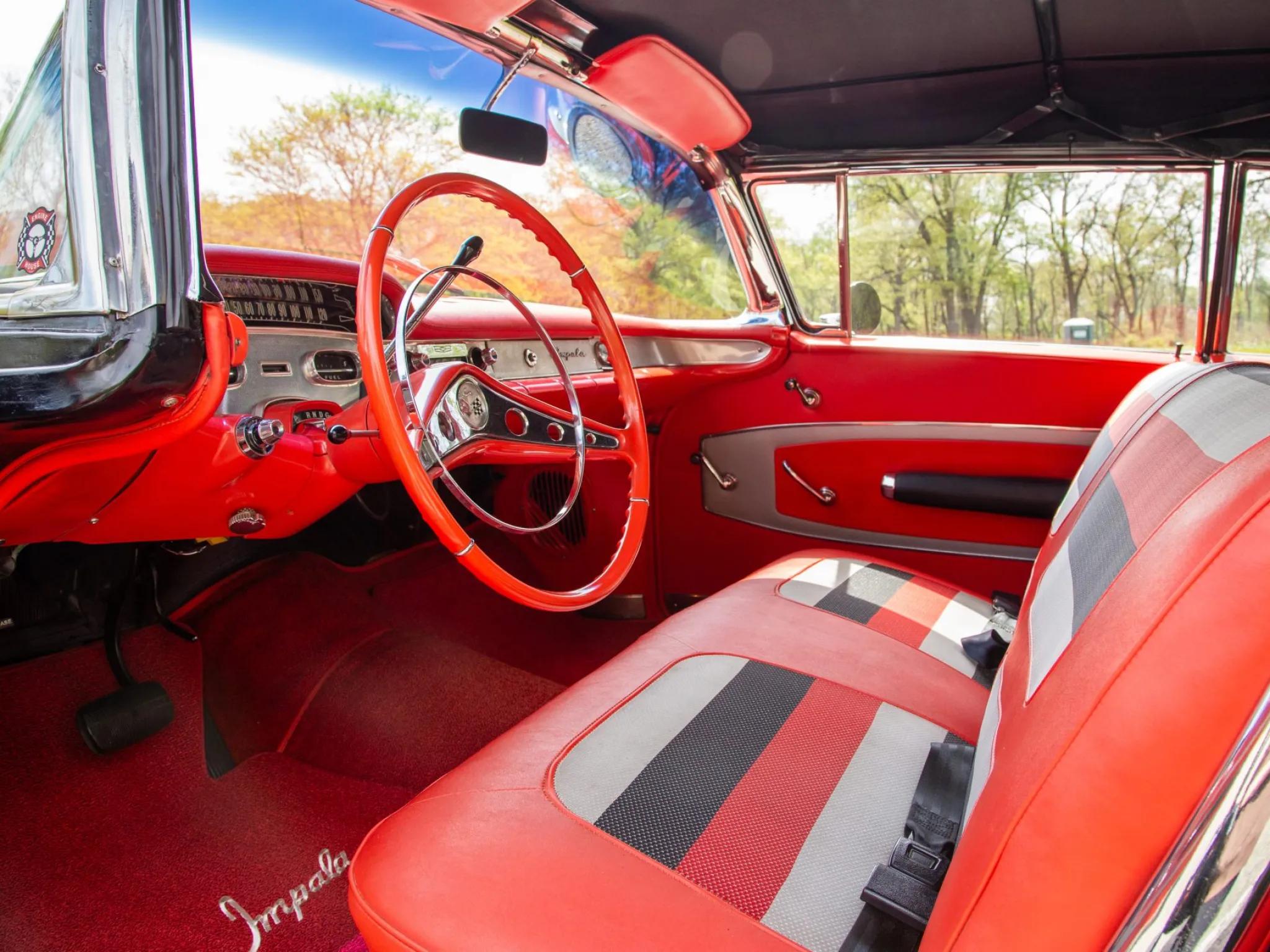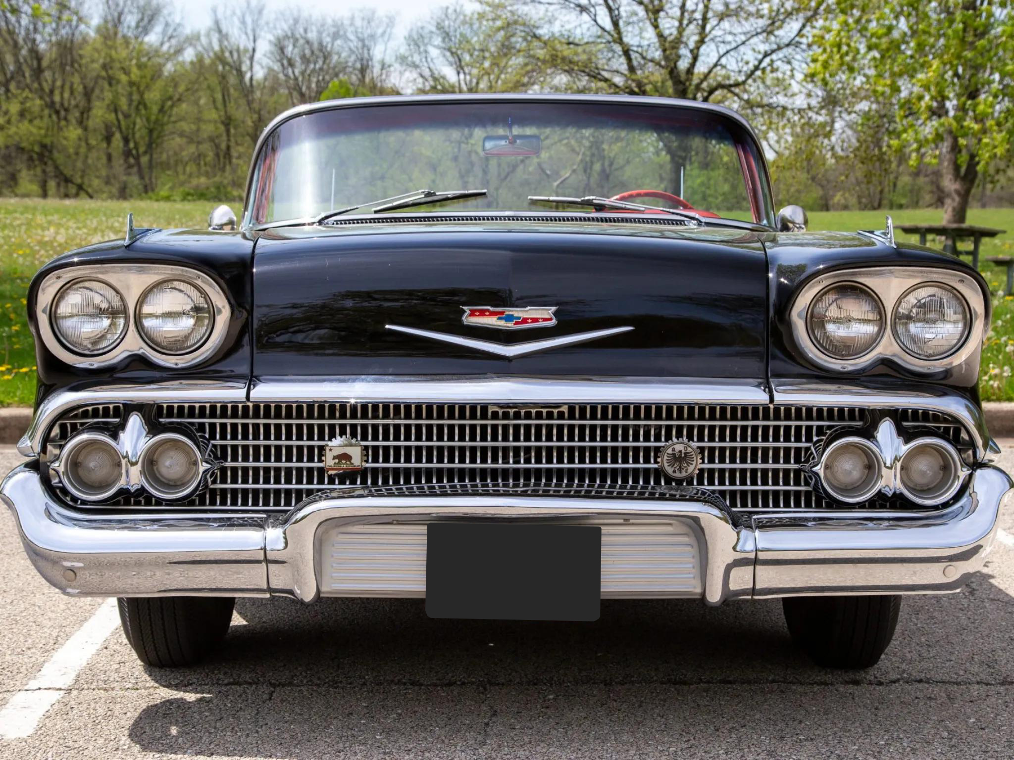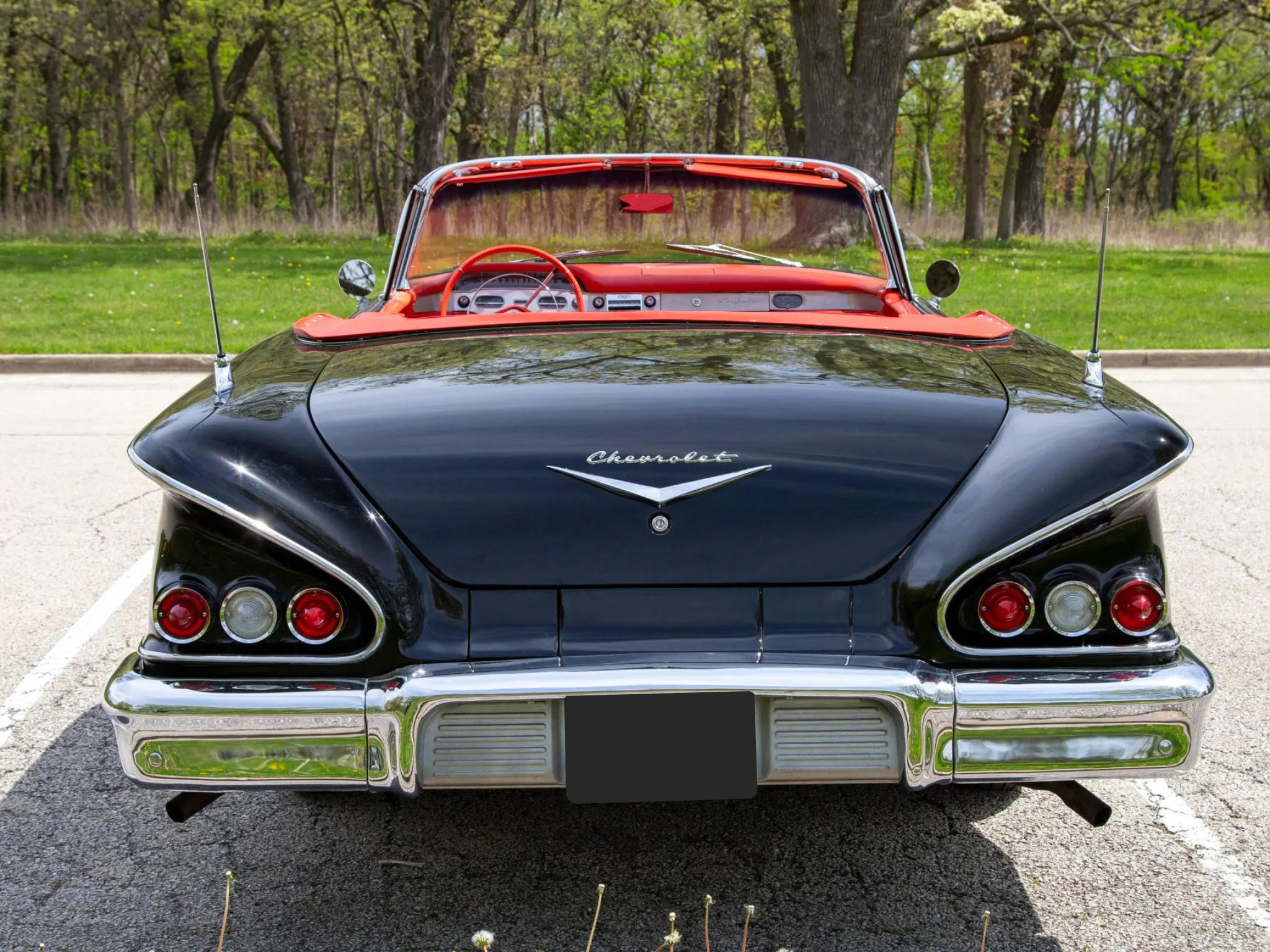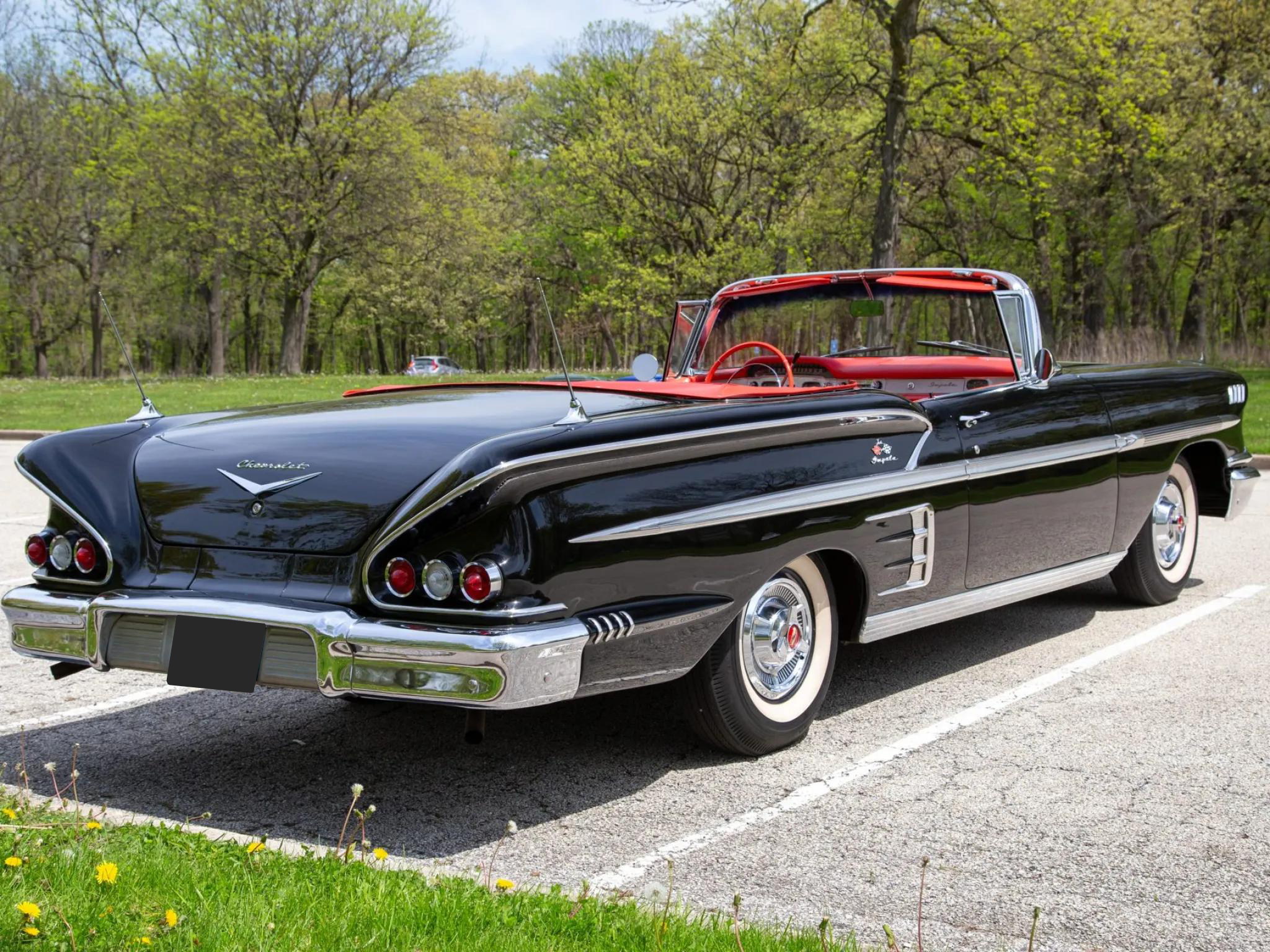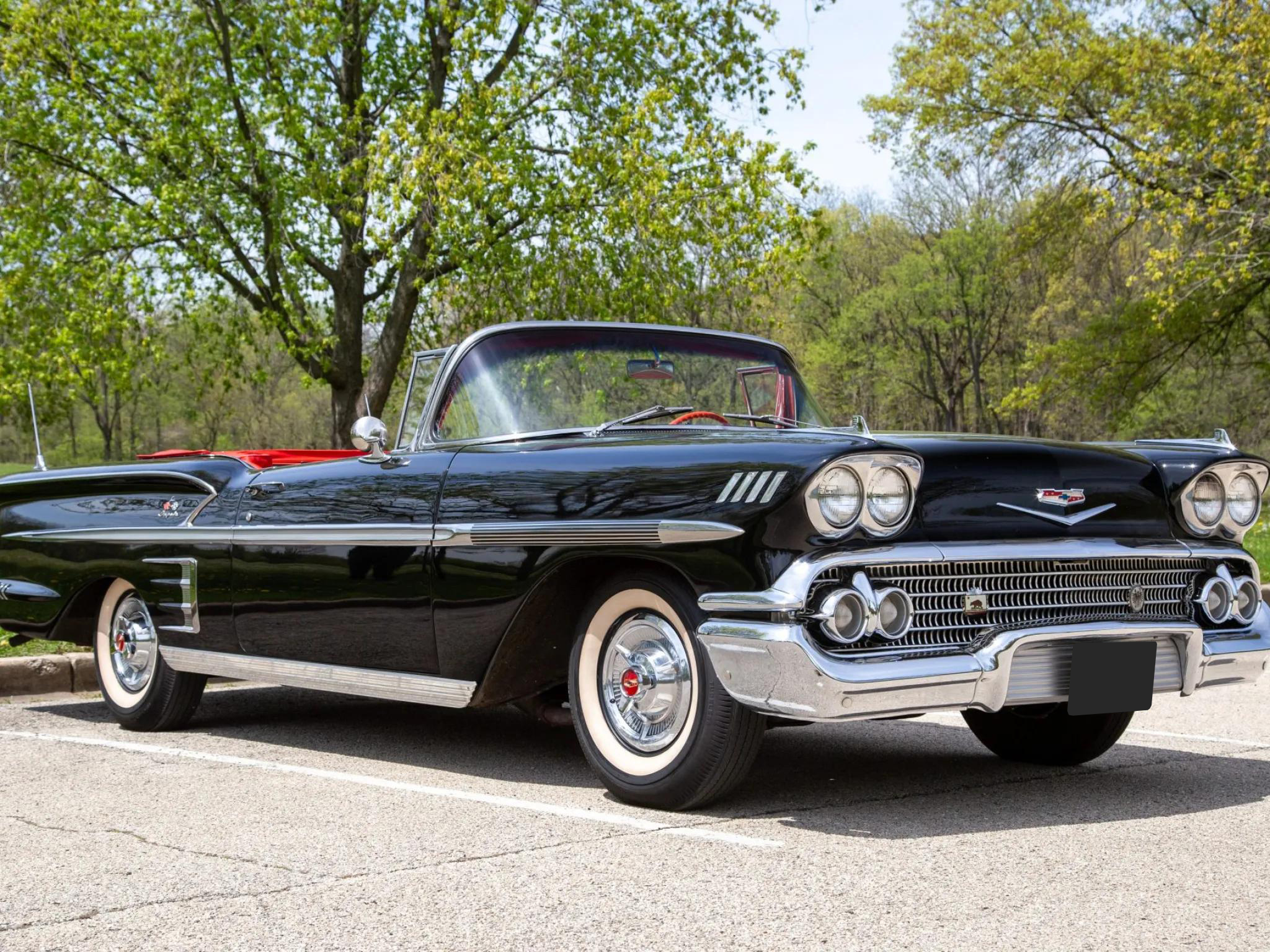 This 1958 Chevrolet Impala convertible is powered by a 348ci V8 with Tri-Power induction paired with a three-speed Turboglide automatic transmission. The exterior is finished in black with a matching power-operated soft top and a red boot cover. Features include twin antennas, chrome trim, hooded headlights, a wrap-around windshield, dual chrome mirrors, and 14" steel wheels with tri-ribbed covers and whitewall tires.