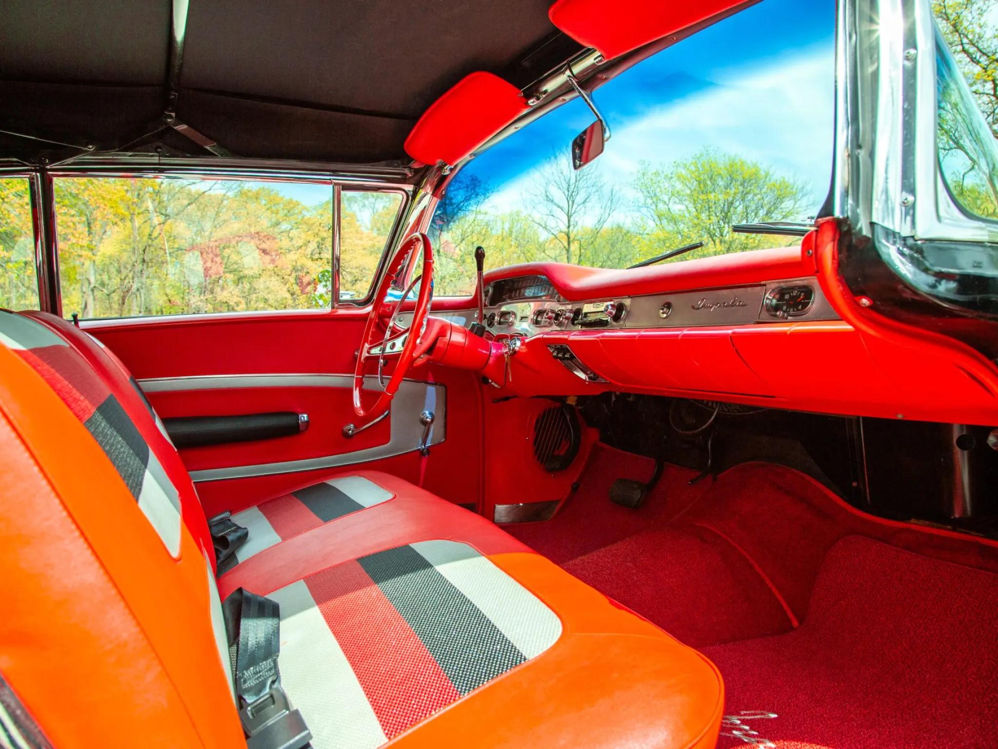 The interior features red vinyl and multi-color cloth bench seats, a padded dashboard, a cabin heater, and wind-up windows. The two-spoke steering wheel has a chrome horn ring and frames a 120-mph speedometer with supplementary gauges.