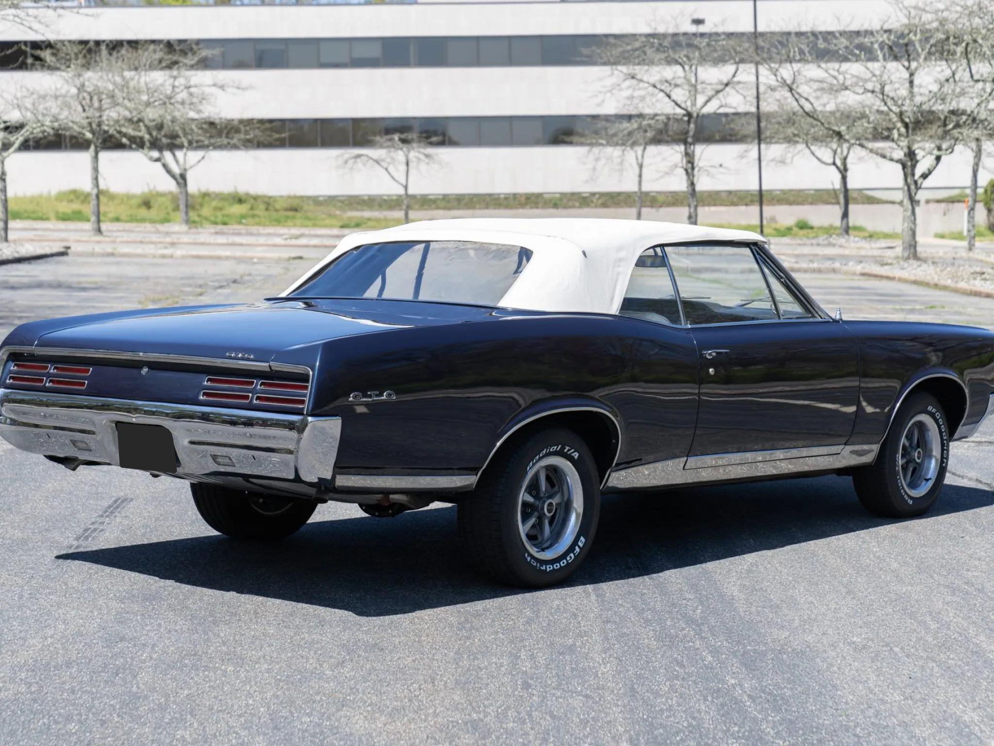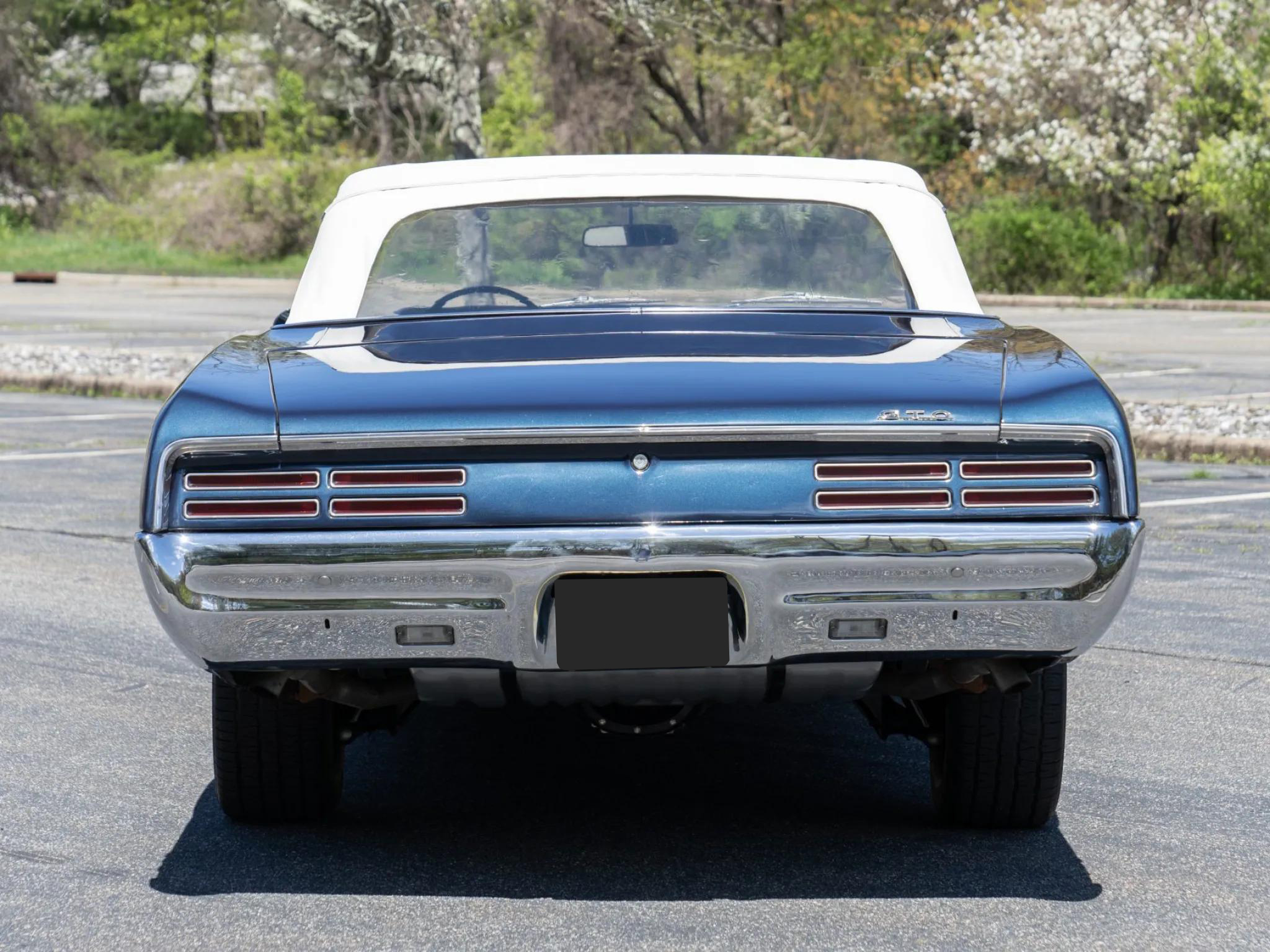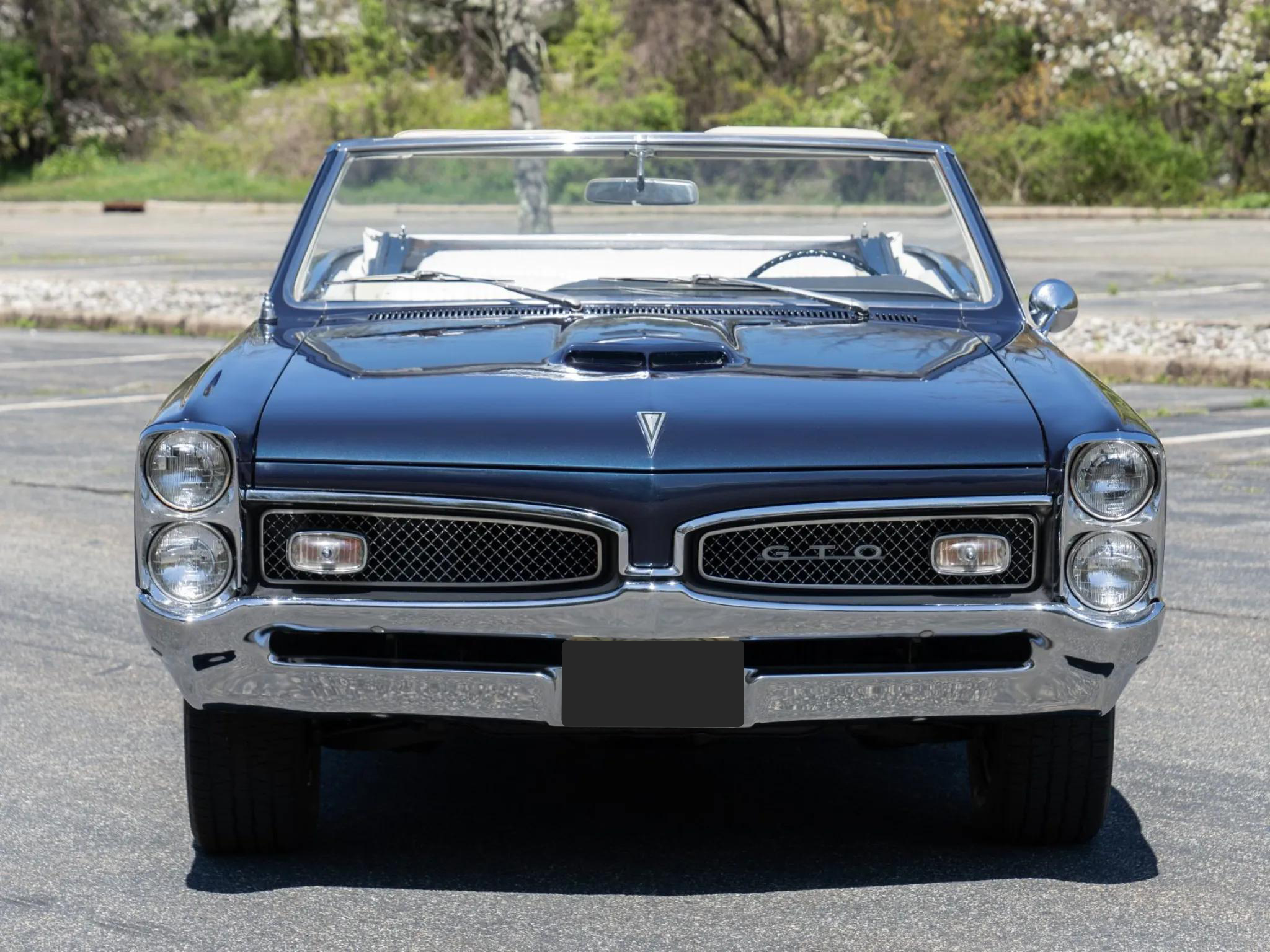 This 1967 Pontiac GTO convertible is powered by a 400ci V8 paired with a four-speed manual transmission. The engine features three two-barrel carburetors and a Safe-T-Track differential. The car is finished in blue with a white power-operated convertible top and features stacked headlights, a hood scoop, GTO badging, and chrome trim on the grille, bumpers, window surrounds, and rocker panels.