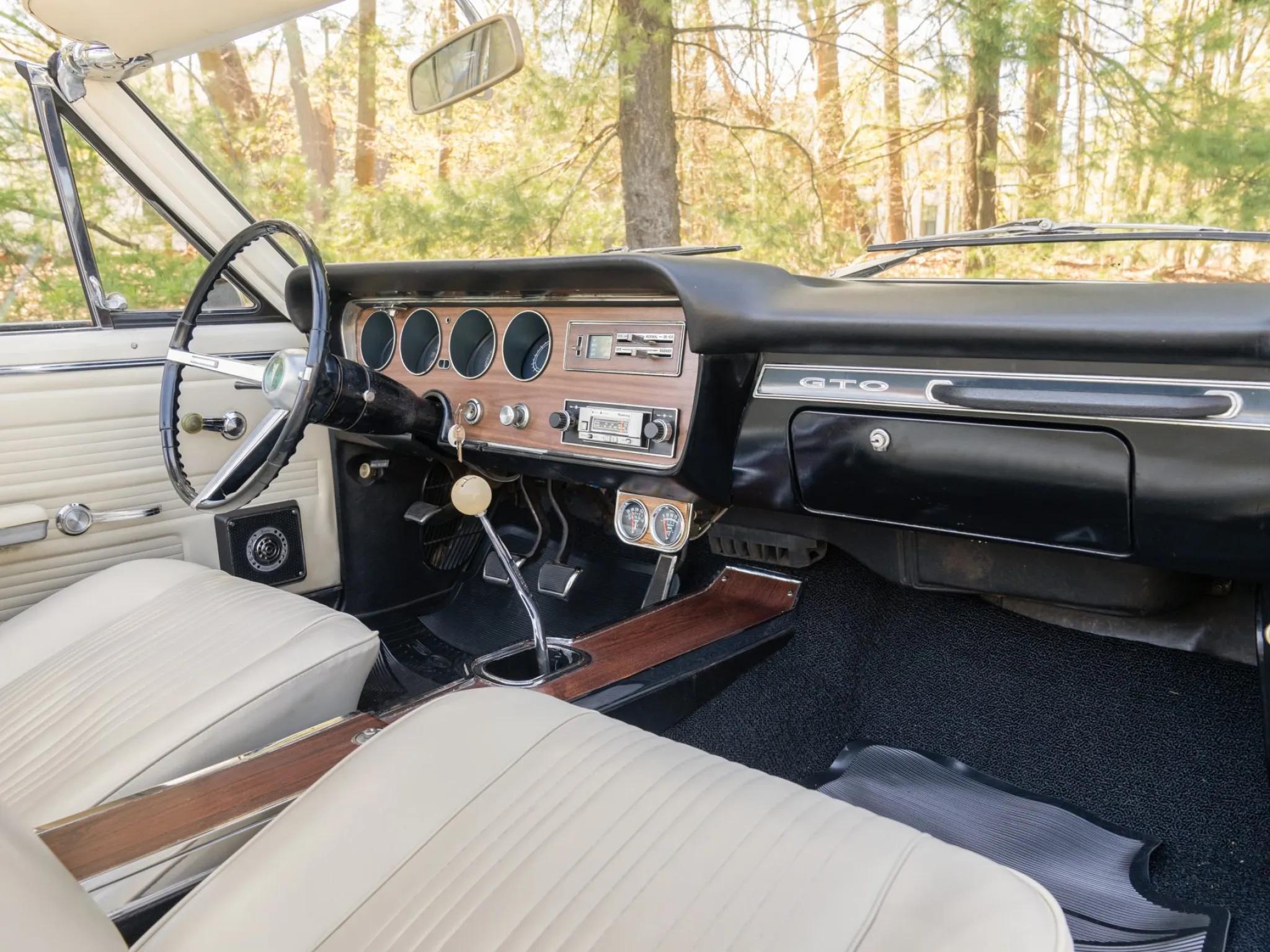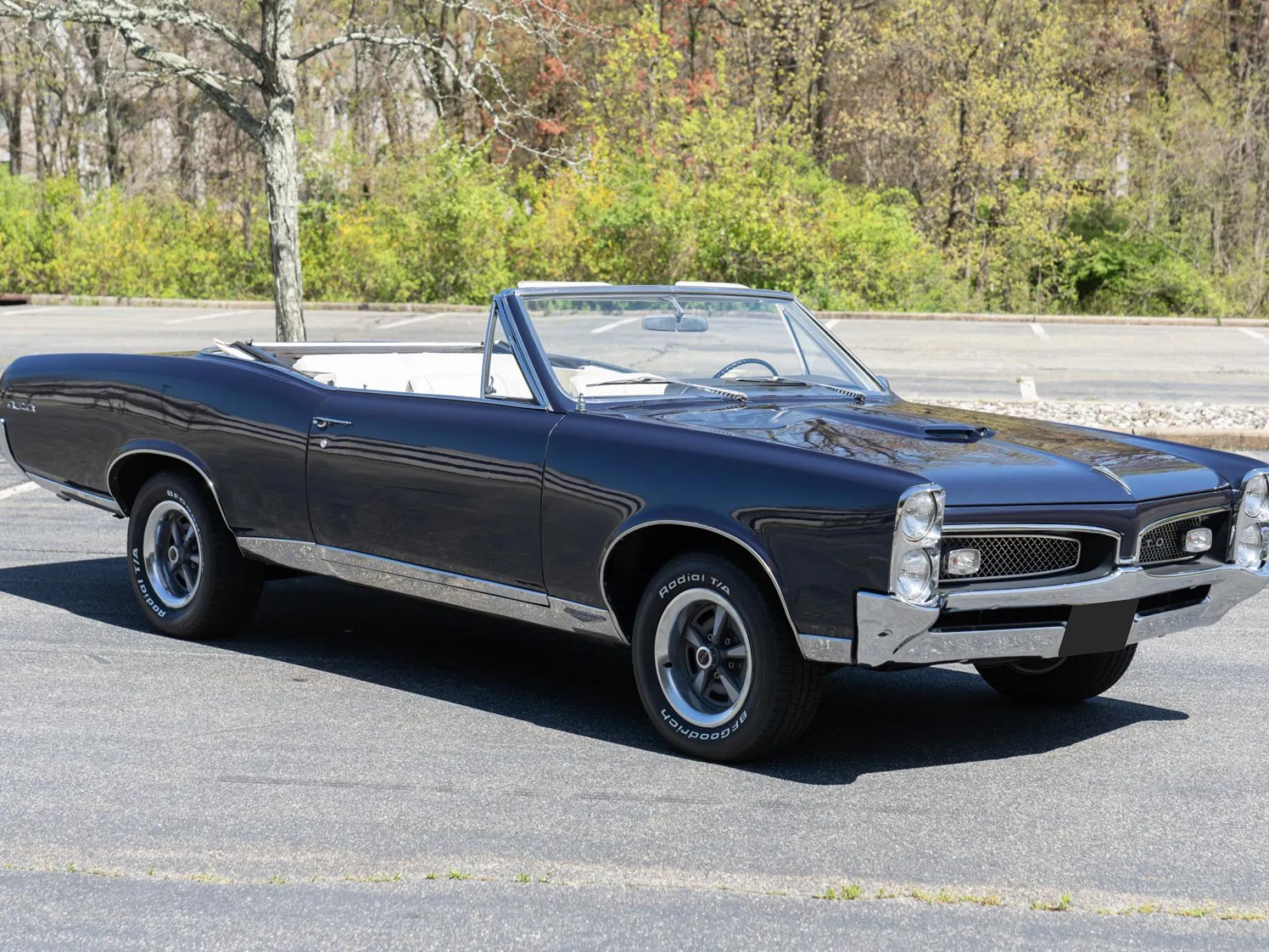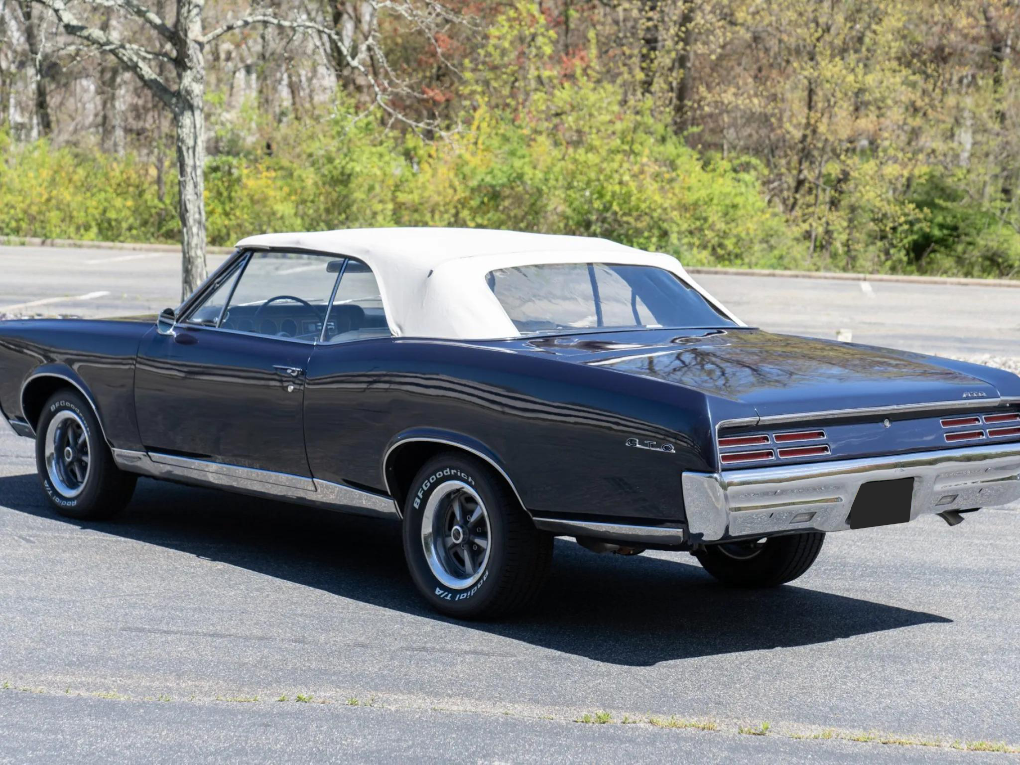 This 1967 Pontiac GTO convertible is powered by a 400ci V8 paired with a four-speed manual transmission. The engine features three two-barrel carburetors and a Safe-T-Track differential. The car is finished in blue with a white power-operated convertible top and features stacked headlights, a hood scoop, GTO badging, and chrome trim on the grille, bumpers, window surrounds, and rocker panels.