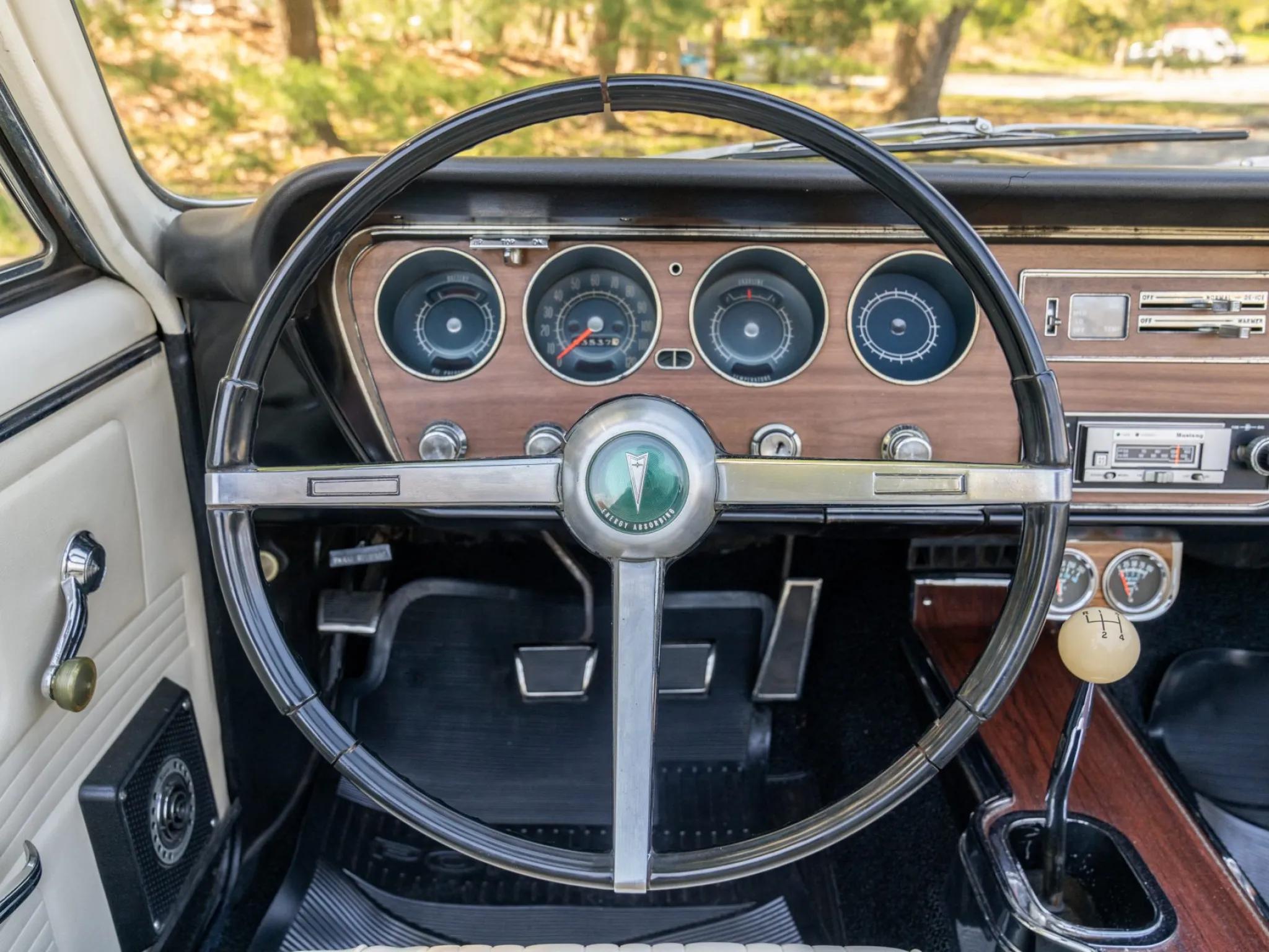 The interior includes front bucket seats and a rear bench upholstered in Parchment vinyl. Equipment consists of a full-length center console, a Hurst shifter, a Mustang cassette stereo, a heater, and a locking glovebox. The carpeting, seat belts, and door sill plates were replaced in 2023. The three-spoke steering wheel fronts a 120-mph speedometer, a fuel-level gauge, and auxiliary gauges mounted below the dash.