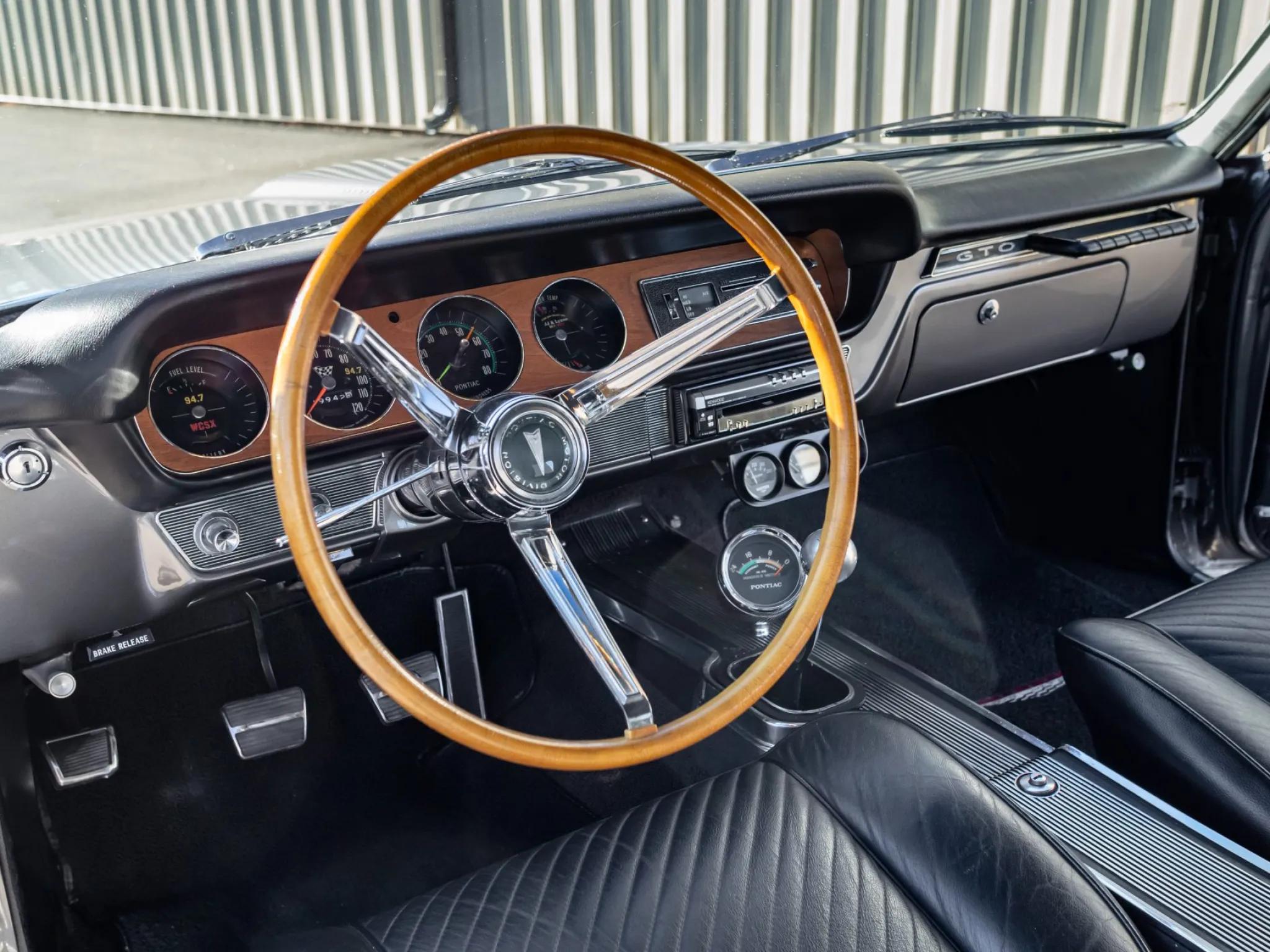 This 1965 Pontiac LeMans convertible was modified in the style of a GTO during a comprehensive 2005 refurbishment. The body was removed from the frame, placed on a rotisserie, and refinished in silver. A black canvas soft top with a glass rear window was installed along with GTO-style hood, emblems, and interior trim.