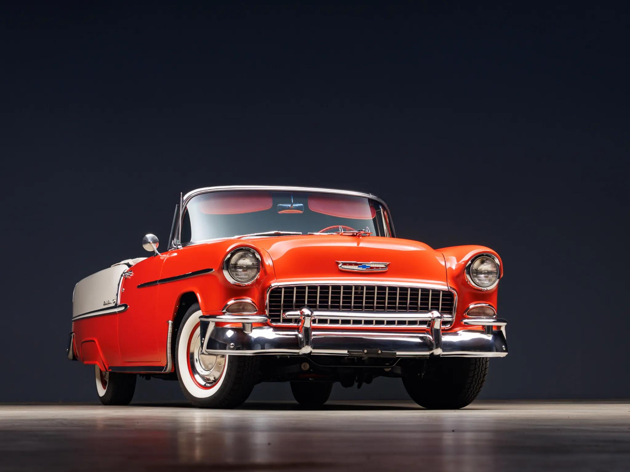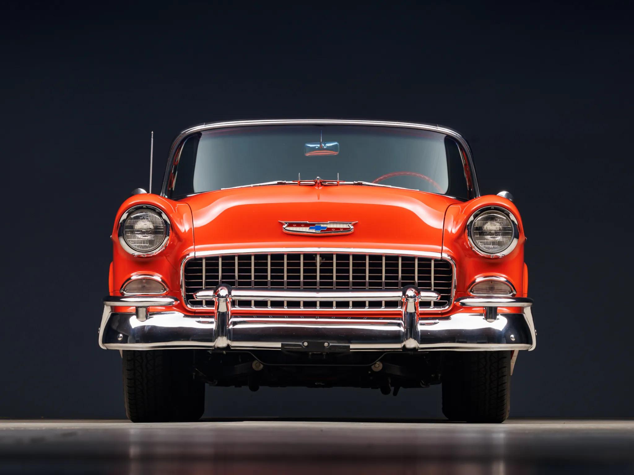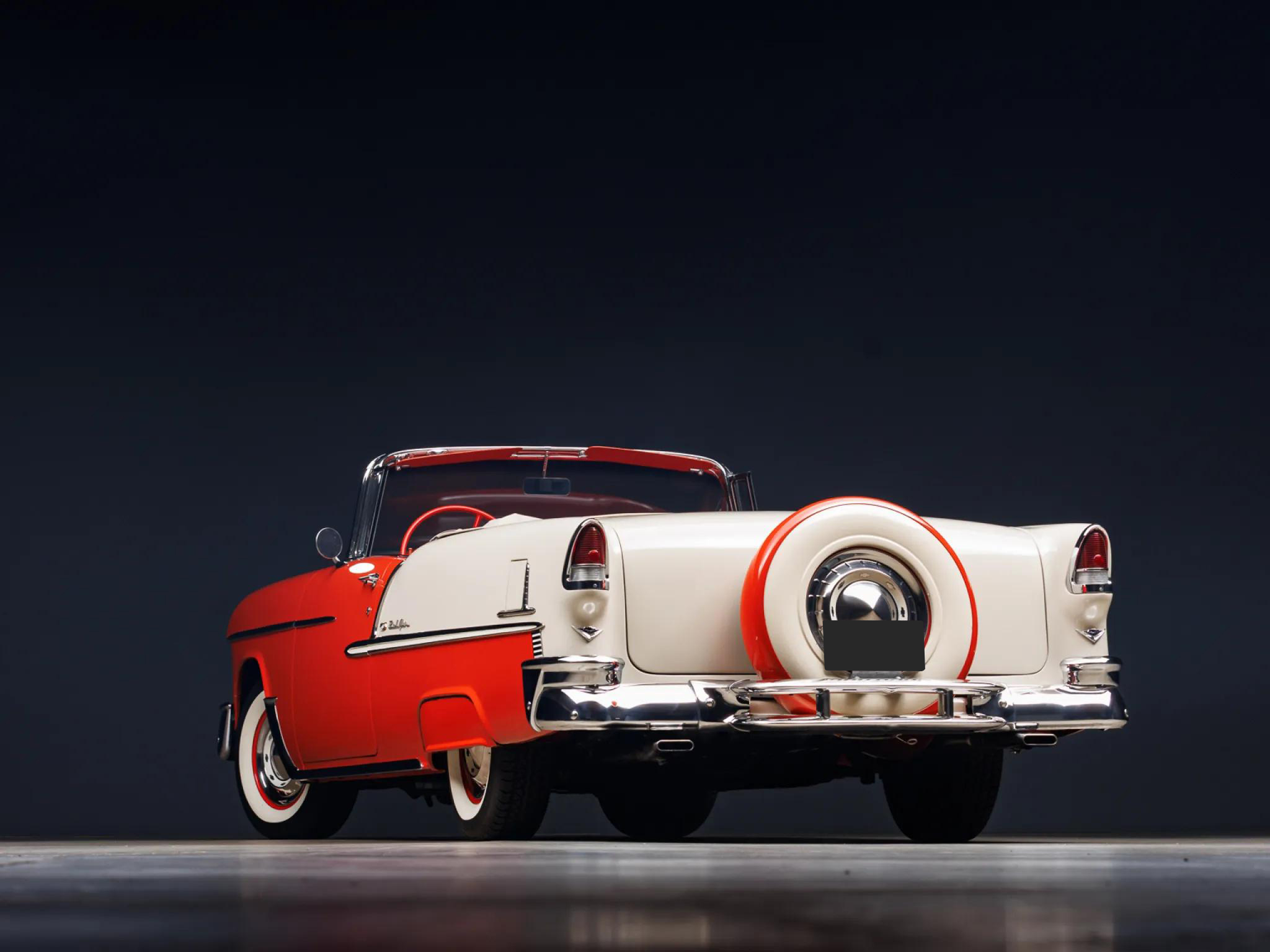 This 1955 Chevrolet Bel Air convertible underwent a cosmetic and mechanical refurbishment in the 1990s. It is finished in red and white and features a white soft top, a Continental kit, an egg-crate grille, rear wheel skirts, and 15" body color wheels with chrome bowtie covers and BFGoodrich whitewall radials. Power is provided by a 265ci V8 paired with a two-speed automatic transmission, and work in preparation for the sale included repacking the wheel bearings and replacing the spark plugs, power steering hoses, front shocks, and steering stabilizer mount. The cabin is outfitted with a push-button radio, power windows, a heater, and red and white vinyl over the bench seats.