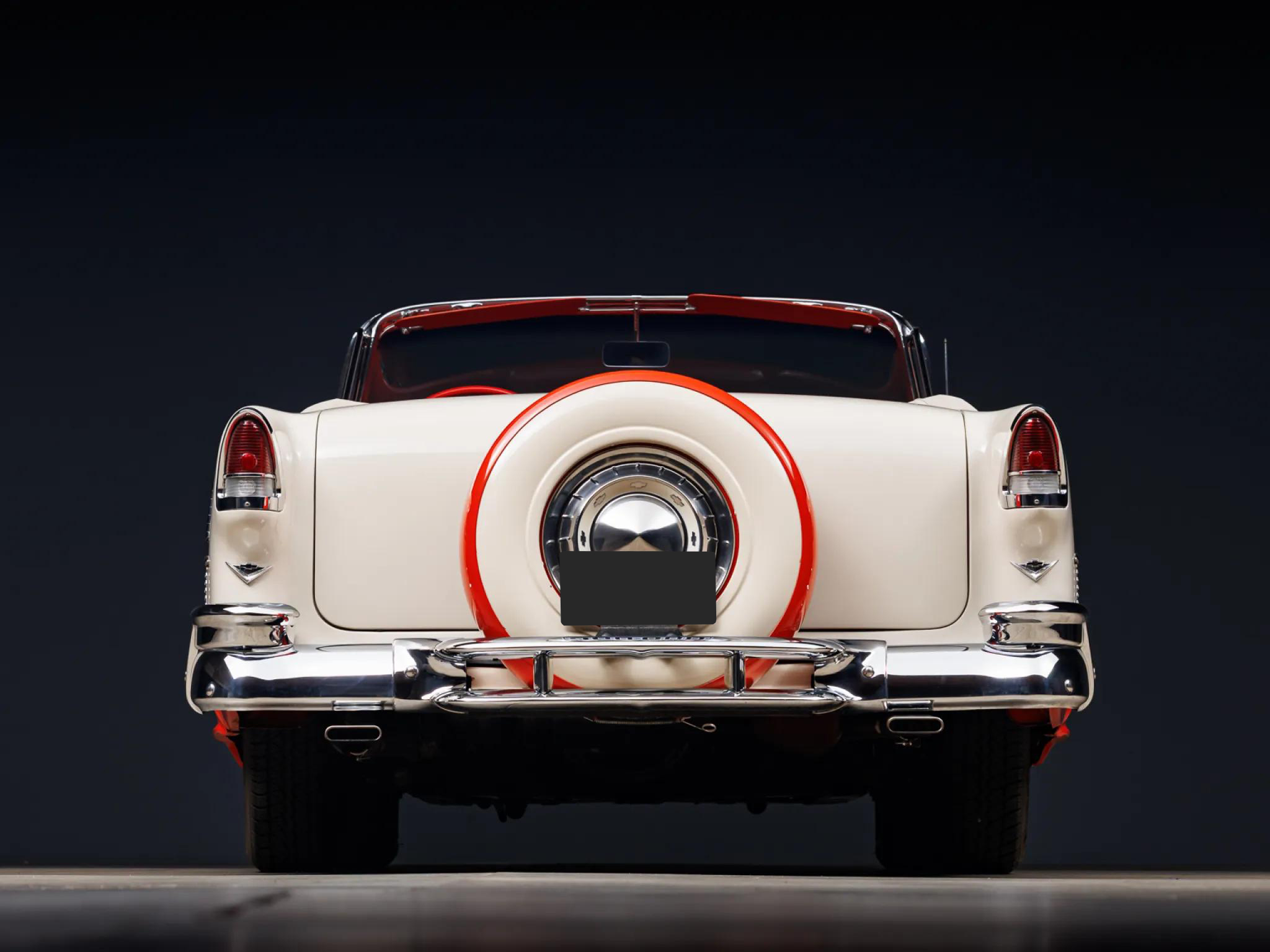 The car was refinished in the current red and white scheme during the refurbishment in the 1990s, reportedly by Harold Louisiana. Equipment includes a white convertible top, a hood ornament, an egg-crate grille, rear wheel skirts, a Continental kit, hooded headlights, dual chrome mirrors, and chrome bumpers and trim. Paint chips are noted on the front bodywork, and the reverse lights were repaired in May 2025.