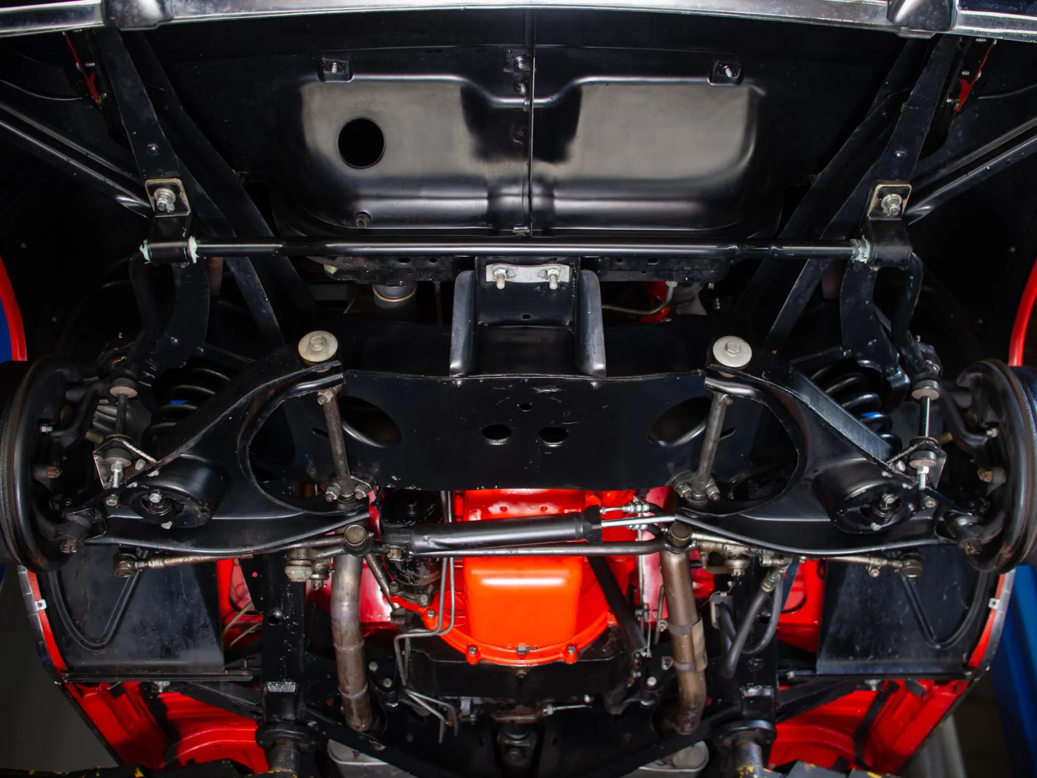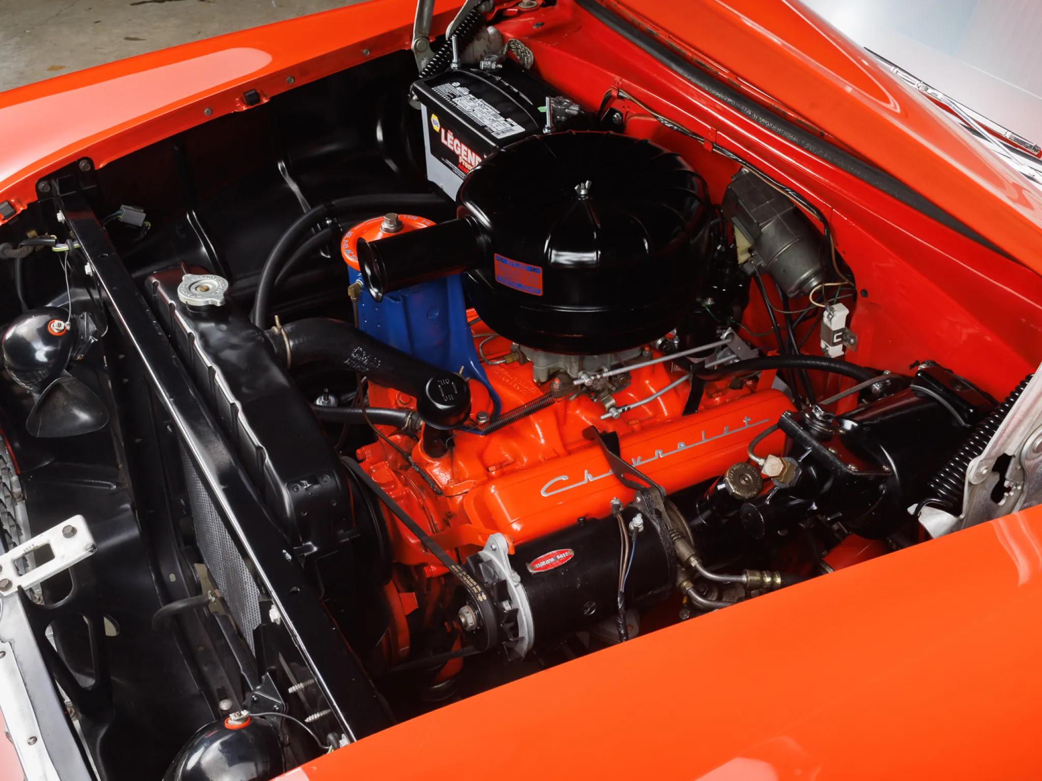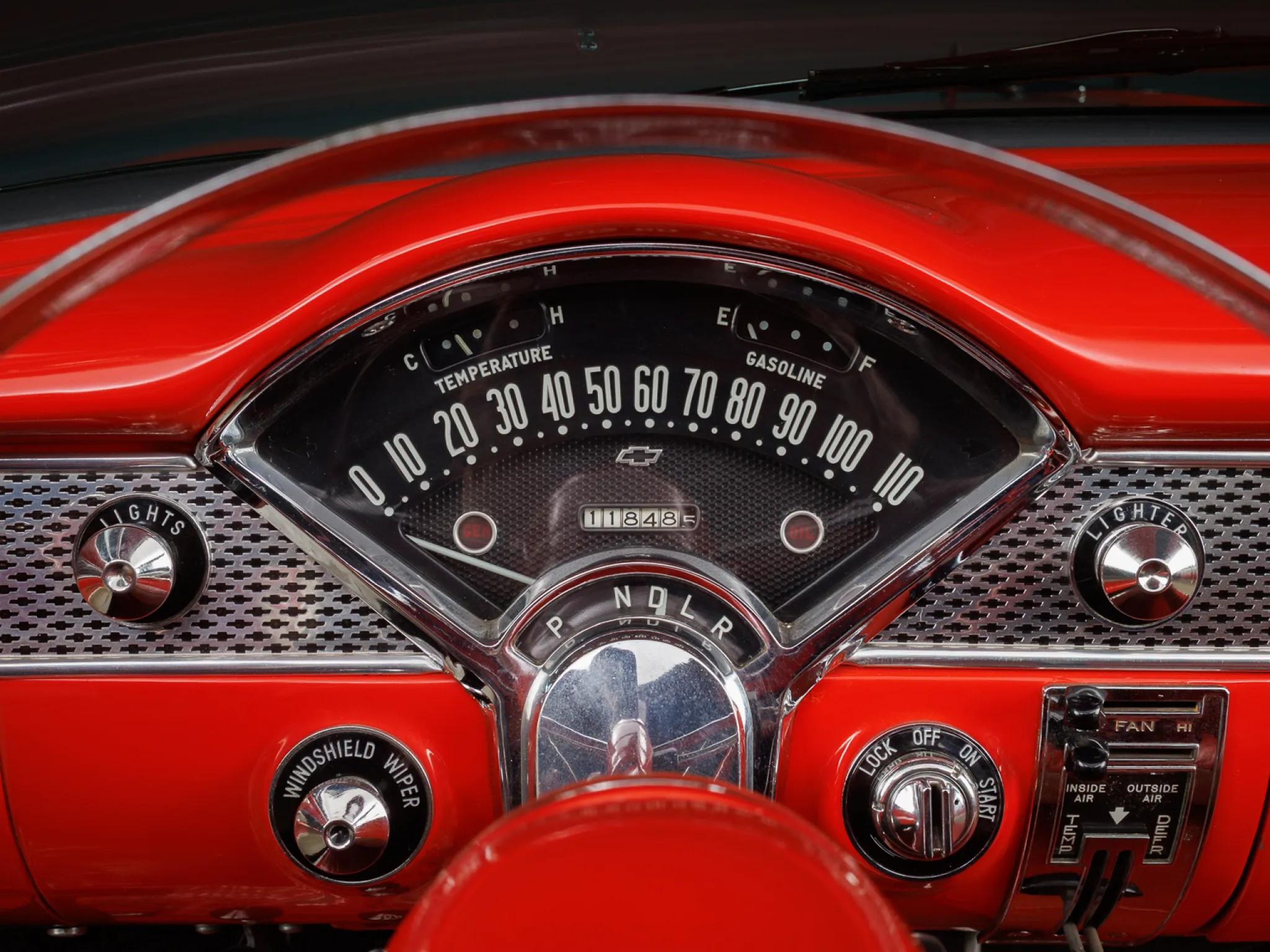 The 15" body-color steel wheels wear bowtie covers and are mounted with BFGoodrich Silvertown Radial whitewall tires. A matching spare is mounted on the Continental kit. The bench seats are upholstered in red and white vinyl, and the front seat features a split-folding backrest. Appointments include an analog clock, a cabin heater, power windows, a push-button radio, Chevrolet-logo floor mats, and vent windows.