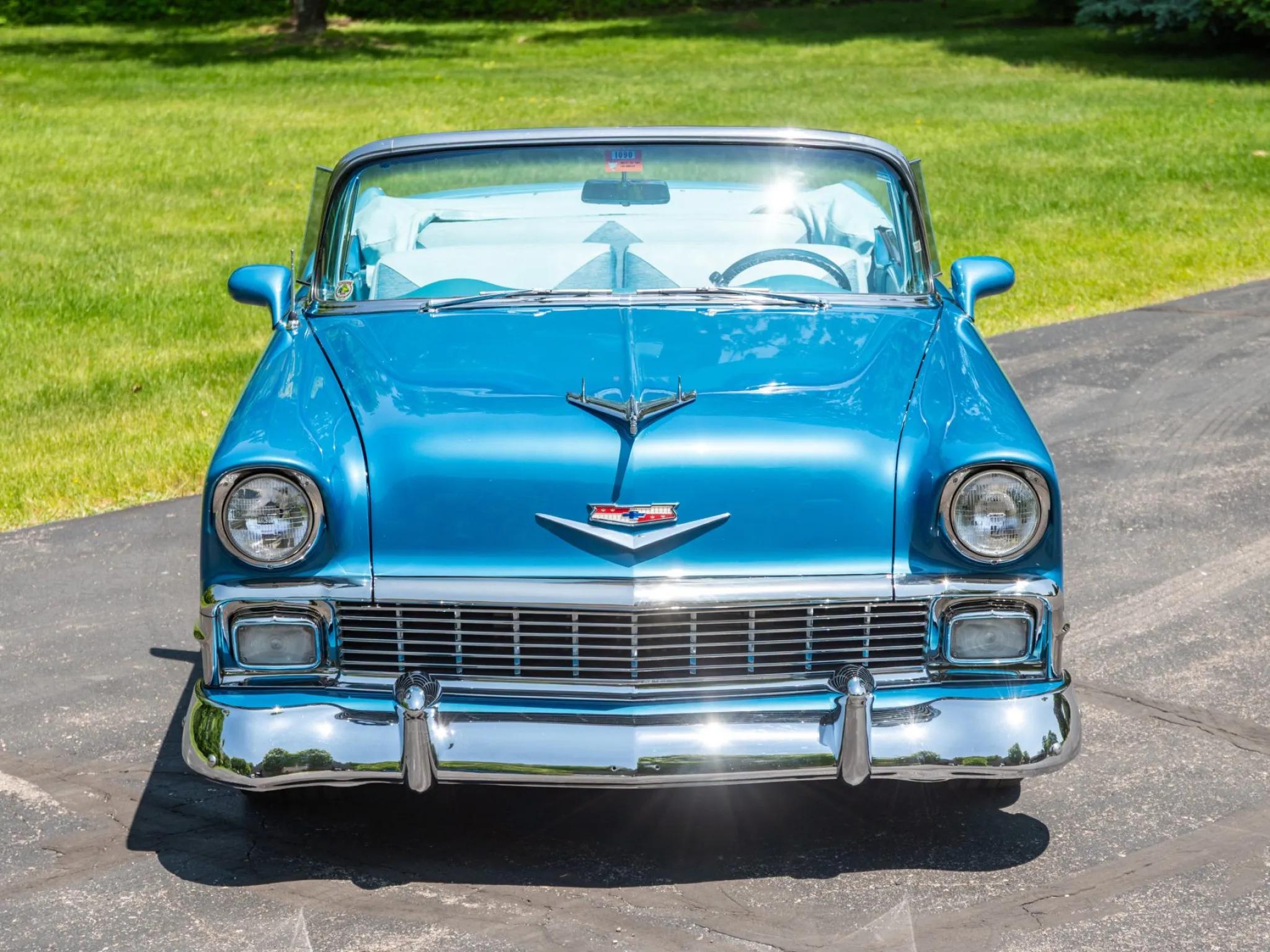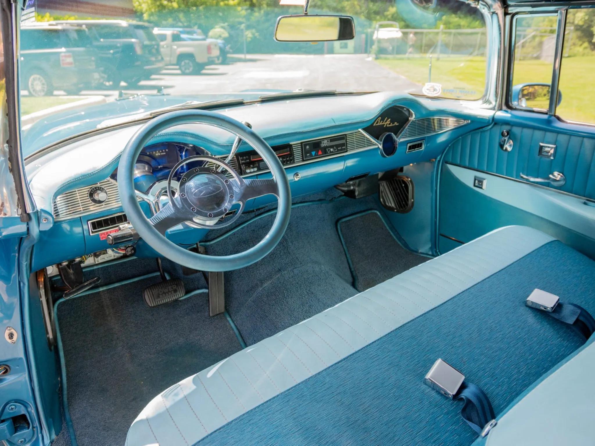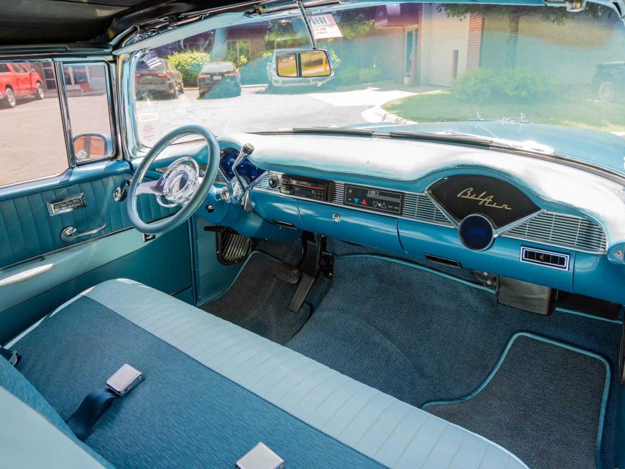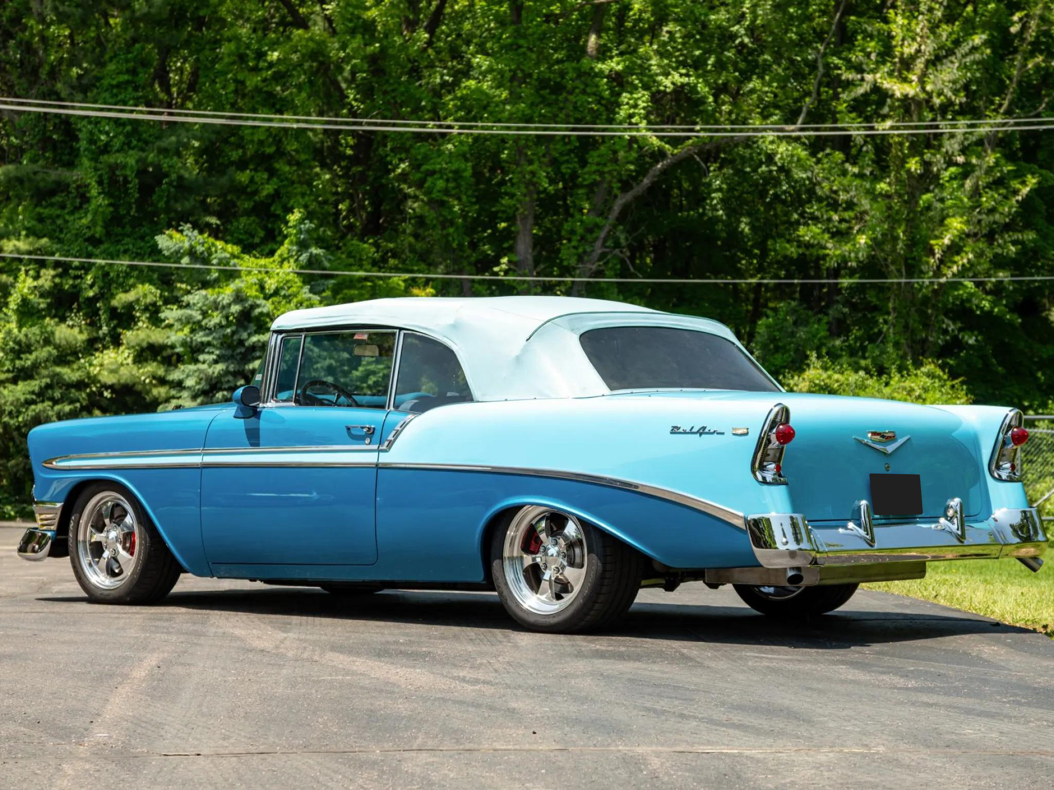 This 1956 Chevrolet Bel Air. A tube-frame modified 1955 chassis was fitted with C4 Corvette suspension, and a 350ci LT1 V8 paired with a four-speed 700R4 automatic transmission was installed. Additional equipment includes a limited-slip differential, a power-operated blue convertible top, adjustable shocks, 17" Colorado Custom billet wheels, power-assisted four-wheel disc brakes, power-assisted rack-and-pinion steering, Dynomax mufflers, an aluminum fuel cell, a CD stereo, Vintage Air climate control, power windows and locks, and a split-folding front bench seat. The car is refinished in two-tone blue and features a power-operated blue convertible top, hooded headlights, back-up lights, tinted glass, dual exhaust outlets, a fuel filler concealed above the left taillight, and chrome bumpers and trim. Colorado Custom 17" billet five-spoke wheels were mounted with 255/45 front and 285/40 Continental ExtremeContact tires. Braking is provided by power-assisted discs at each corner, and the car is equipped with power-assisted rack-and-pinion steering. The cabin features a split-folding front bench seat reupholstered in two-tone blue vinyl, and interior appointments include cruise control, power door locks, power windows, an Alpine alarm system, Vintage Air climate control, an analog clock, lap belts, and an Alpine in-dash CD stereo linked to aftermarket speakers. A removable transmission tunnel was installed to accommodate the replacement engine and transmission along with sound and heat insulation. The Budnik steering wheel is mounted to a tilt column and sits ahead of Dakota Digital gauges. The five-digit odometer shows 12k miles, and total mileage is unknown. The 350ci LT1 V8 is said to have been sourced from a 1994 Corvette and installed in the mid-1990s. Power is sent to the rear wheels through a 700R4 four-speed automatic transmission, an aluminum driveshaft, and a limited-slip differential. A remote transmission cooler, a custom exhaust system with Dynomax mufflers, and an aluminum fuel cell with an in-tank pump are also fitted.