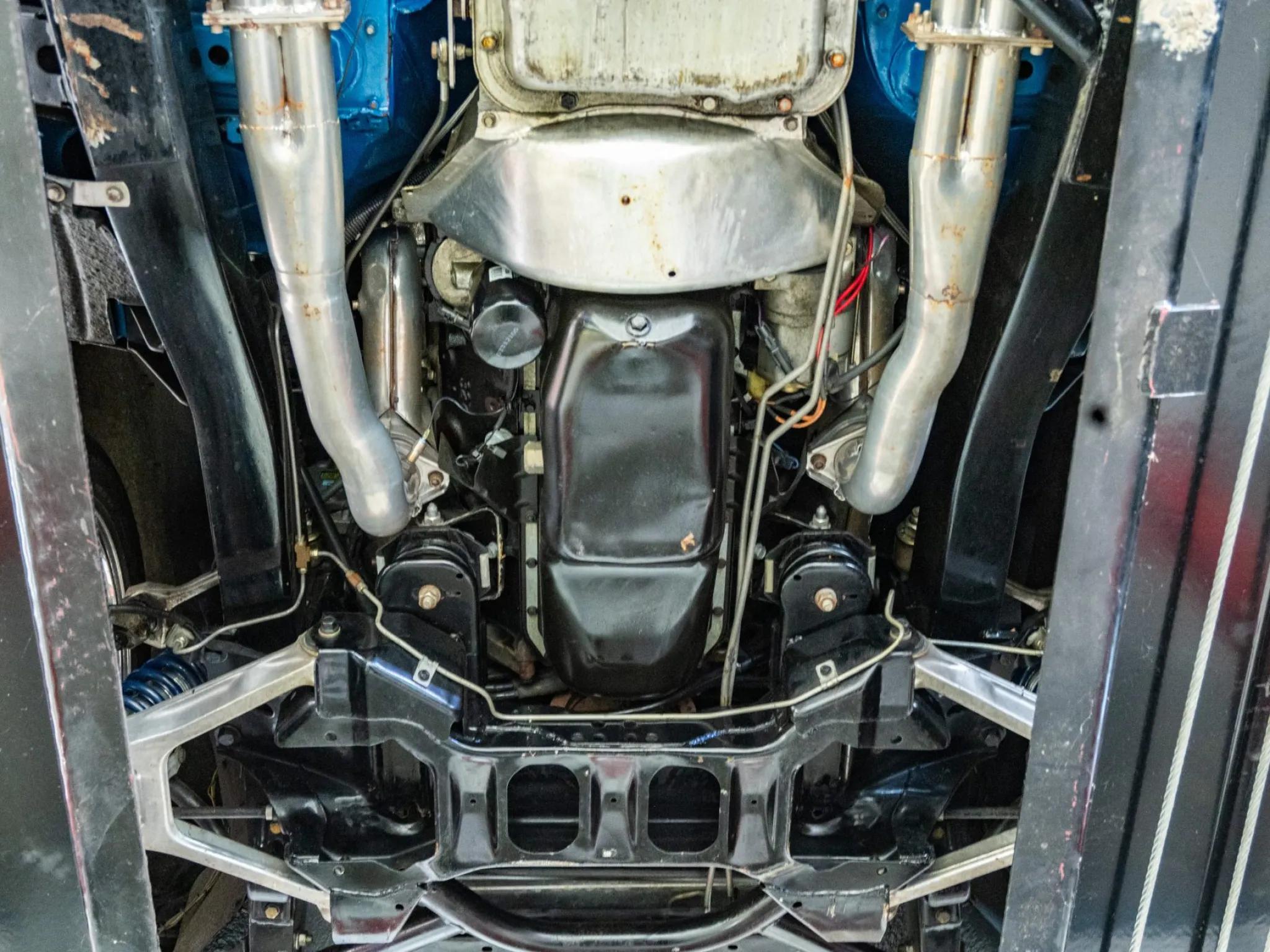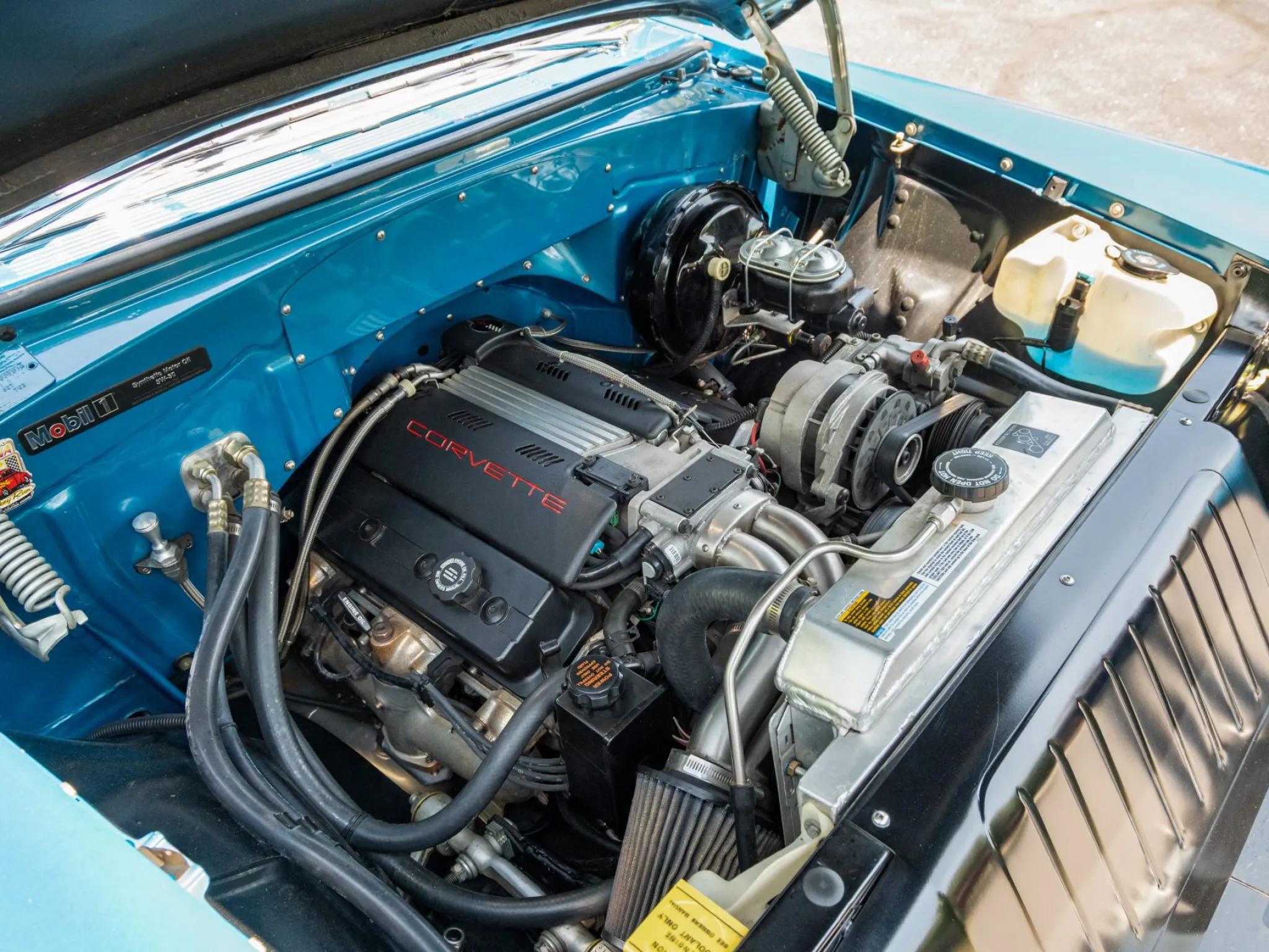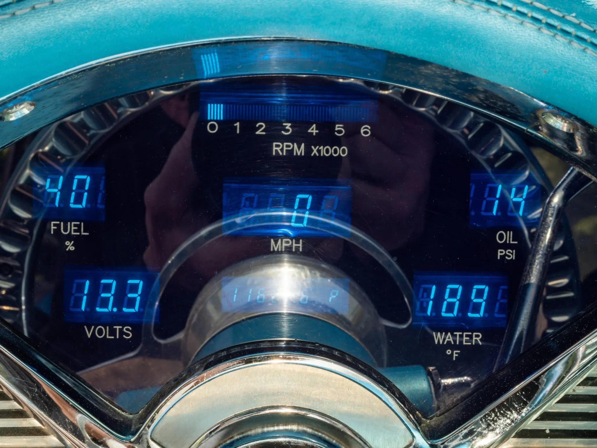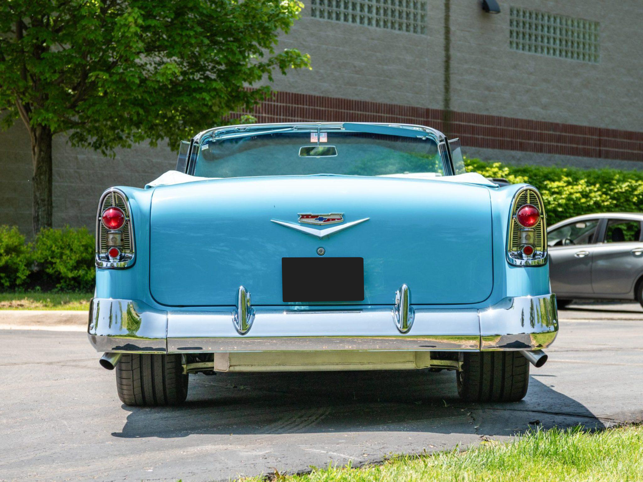 This 1956 Chevrolet Bel Air. A tube-frame modified 1955 chassis was fitted with C4 Corvette suspension, and a 350ci LT1 V8 paired with a four-speed 700R4 automatic transmission was installed. Additional equipment includes a limited-slip differential, a power-operated blue convertible top, adjustable shocks, 17" Colorado Custom billet wheels, power-assisted four-wheel disc brakes, power-assisted rack-and-pinion steering, Dynomax mufflers, an aluminum fuel cell, a CD stereo, Vintage Air climate control, power windows and locks, and a split-folding front bench seat. The car is refinished in two-tone blue and features a power-operated blue convertible top, hooded headlights, back-up lights, tinted glass, dual exhaust outlets, a fuel filler concealed above the left taillight, and chrome bumpers and trim. Colorado Custom 17" billet five-spoke wheels were mounted with 255/45 front and 285/40 Continental ExtremeContact tires. Braking is provided by power-assisted discs at each corner, and the car is equipped with power-assisted rack-and-pinion steering. The cabin features a split-folding front bench seat reupholstered in two-tone blue vinyl, and interior appointments include cruise control, power door locks, power windows, an Alpine alarm system, Vintage Air climate control, an analog clock, lap belts, and an Alpine in-dash CD stereo linked to aftermarket speakers. A removable transmission tunnel was installed to accommodate the replacement engine and transmission along with sound and heat insulation. The Budnik steering wheel is mounted to a tilt column and sits ahead of Dakota Digital gauges. The five-digit odometer shows 12k miles, and total mileage is unknown. The 350ci LT1 V8 is said to have been sourced from a 1994 Corvette and installed in the mid-1990s. Power is sent to the rear wheels through a 700R4 four-speed automatic transmission, an aluminum driveshaft, and a limited-slip differential. A remote transmission cooler, a custom exhaust system with Dynomax mufflers, and an aluminum fuel cell with an in-tank pump are also fitted.