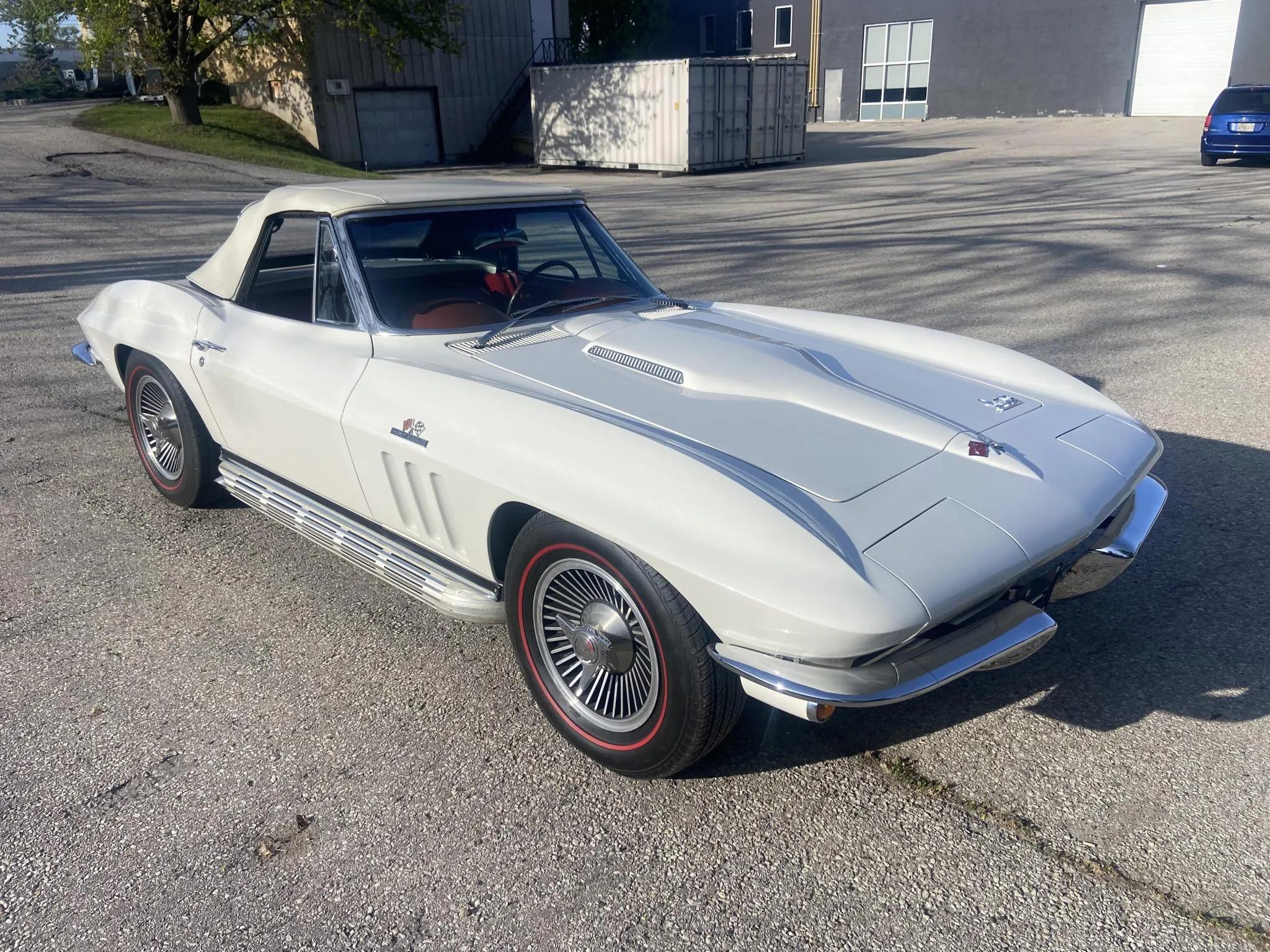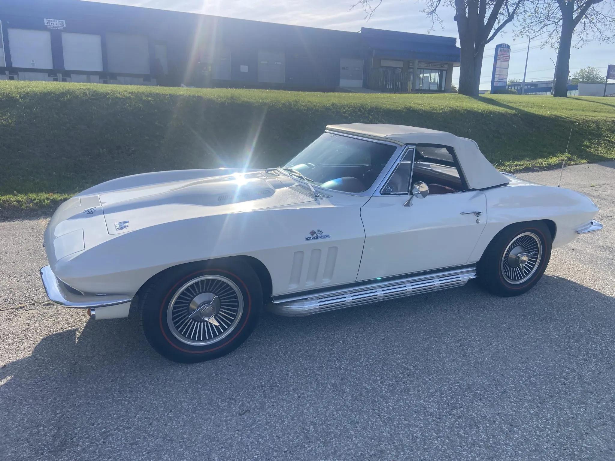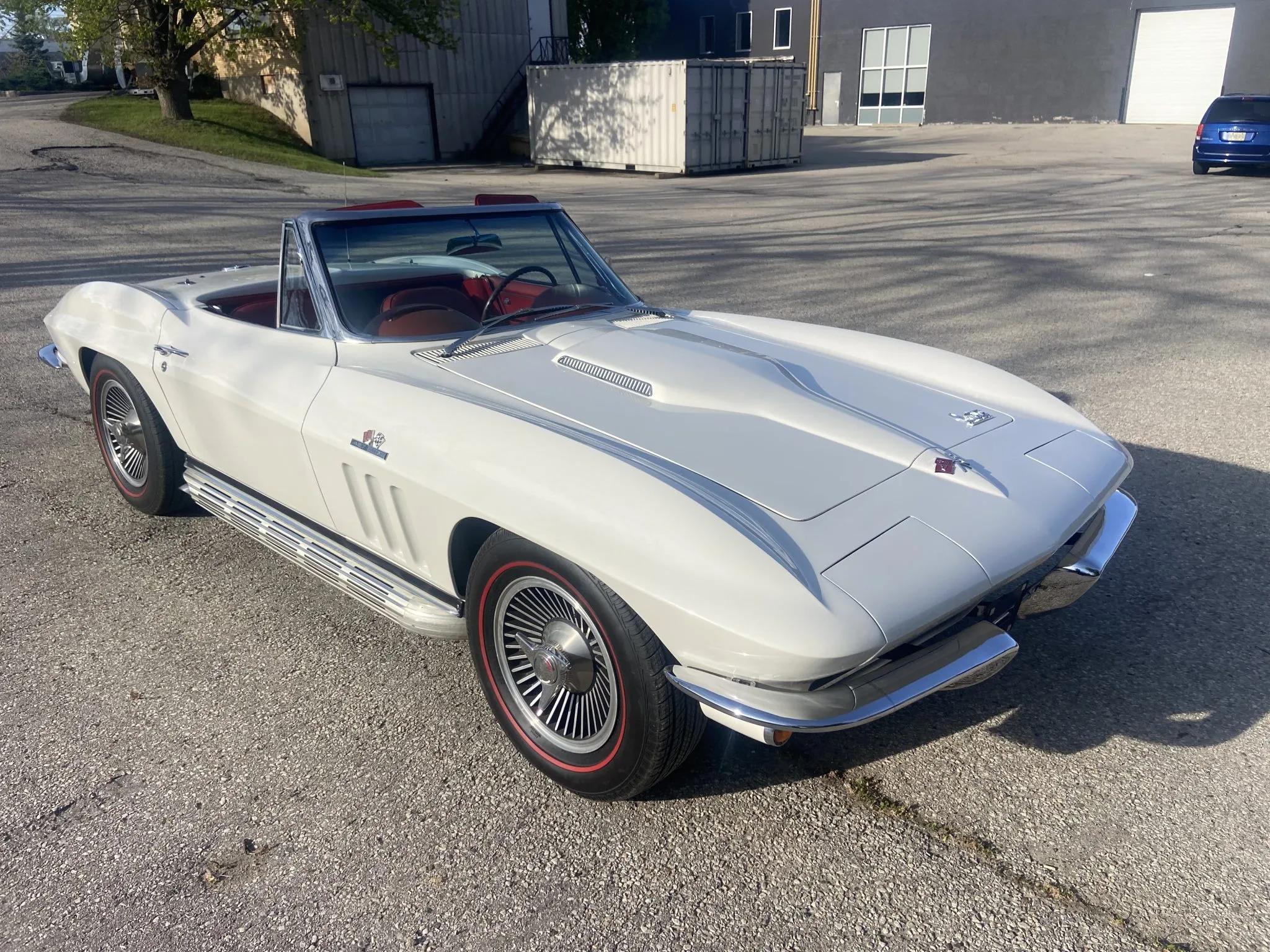 This 1966 Chevrolet Corvette is a white-on-red convertible that was produced in January 1966. Power is provided by a 427ci L72 V8 that is backed by a four-speed manual transmission and a Positraction differential. Equipment includes a white soft top, 15" Turbine-style aluminum wheels, and a side-exit exhaust system in addition to four-wheel disc brakes, power steering, power windows, and an AM/FM radio. The fiberglass body was finished from the factory in Ermine White (972), and features include a white soft top, a domed hood, flip-up headlights, chrome bumpers, and a side-exit exhaust system. Turbine-style 15" aluminum wheels feature knock-off spinners and are mounted with redline tires. The car is equipped with power steering, and braking is handled by four-wheel discs. The bucket seats are upholstered in red vinyl and joined by color-coordinated door panels and carpets. Appointments include a heater, an AM/FM radio, an analog clock, power windows, and lap belts. The woodgrain-rimmed three-spoke steering wheel frames a 160-mph speedometer, a tachometer, and auxiliary gauges. The five-digit odometer shows 38k miles, approximately 9k of which were added under current ownership. The 427ci L72 V8 sends power the rear wheels through a four-speed manual transmission and an optional Positraction differential.