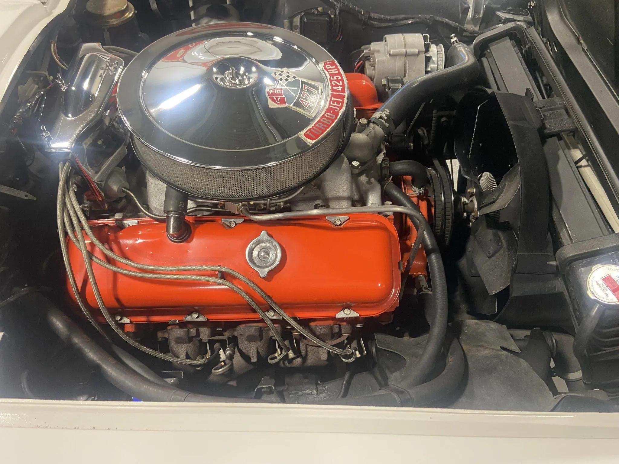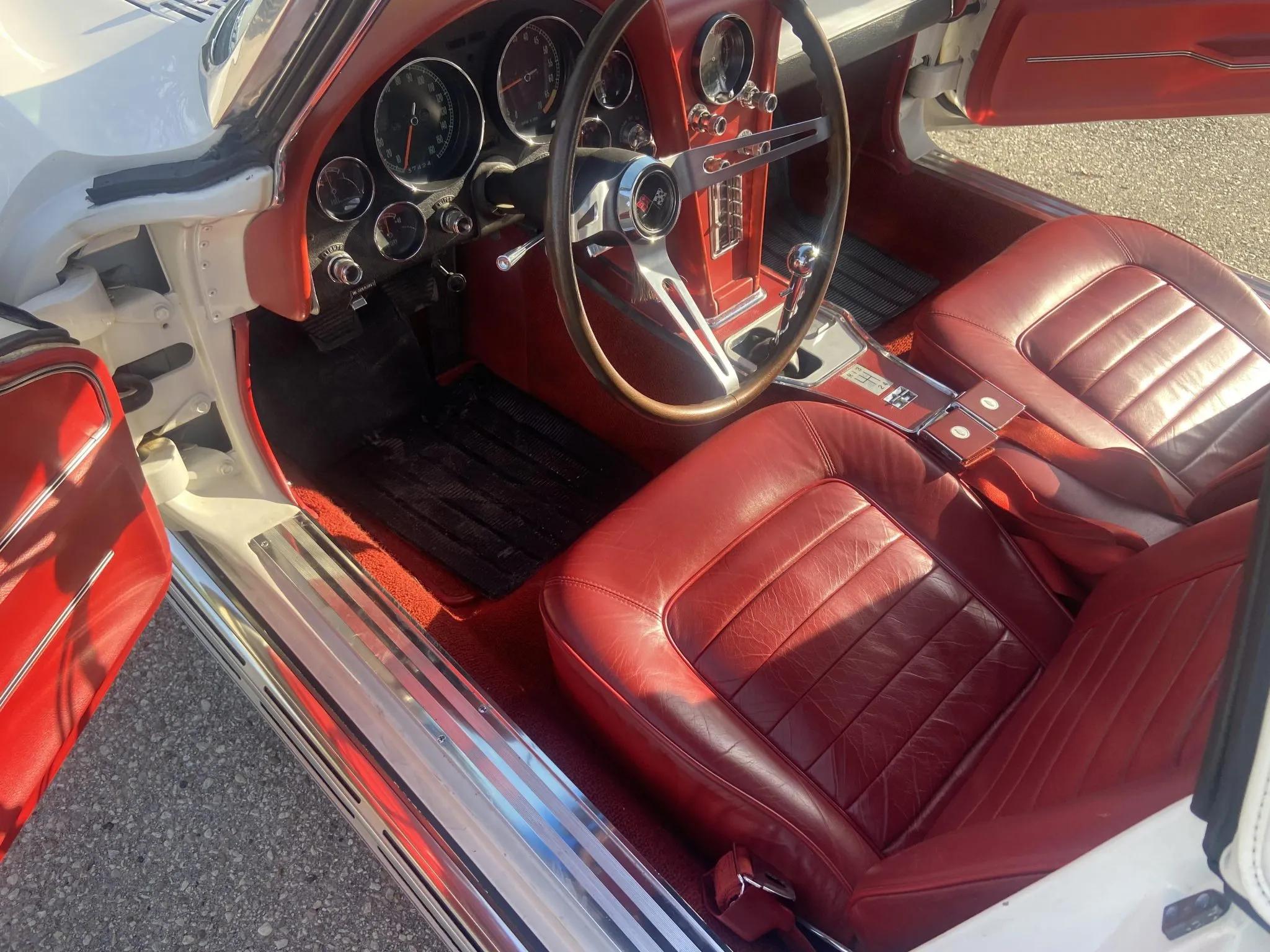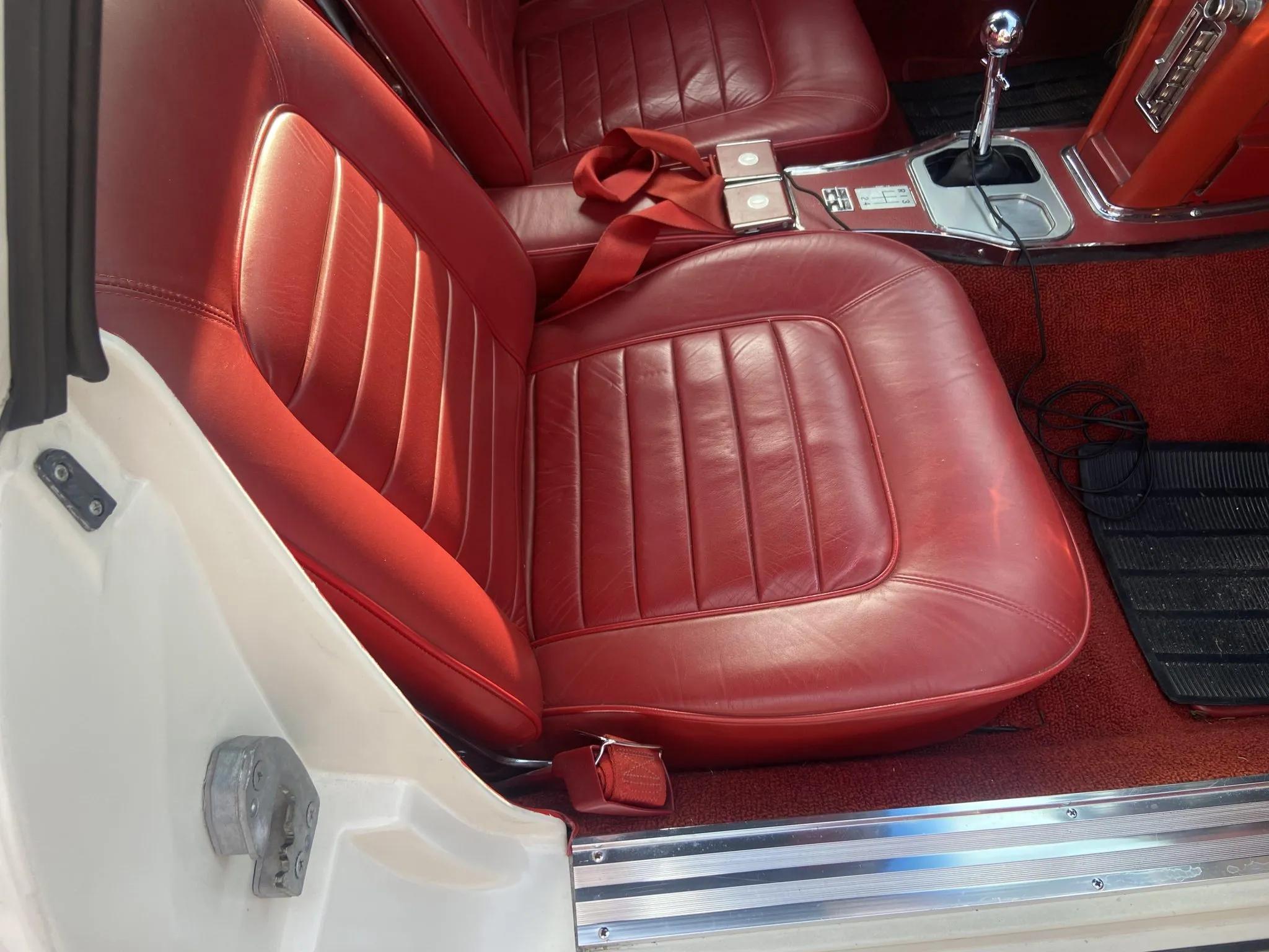 This 1966 Chevrolet Corvette is a white-on-red convertible that was produced in January 1966. Power is provided by a 427ci L72 V8 that is backed by a four-speed manual transmission and a Positraction differential. Equipment includes a white soft top, 15" Turbine-style aluminum wheels, and a side-exit exhaust system in addition to four-wheel disc brakes, power steering, power windows, and an AM/FM radio. The fiberglass body was finished from the factory in Ermine White (972), and features include a white soft top, a domed hood, flip-up headlights, chrome bumpers, and a side-exit exhaust system. Turbine-style 15" aluminum wheels feature knock-off spinners and are mounted with redline tires. The car is equipped with power steering, and braking is handled by four-wheel discs. The bucket seats are upholstered in red vinyl and joined by color-coordinated door panels and carpets. Appointments include a heater, an AM/FM radio, an analog clock, power windows, and lap belts. The woodgrain-rimmed three-spoke steering wheel frames a 160-mph speedometer, a tachometer, and auxiliary gauges. The five-digit odometer shows 38k miles, approximately 9k of which were added under current ownership. The 427ci L72 V8 sends power the rear wheels through a four-speed manual transmission and an optional Positraction differential.
