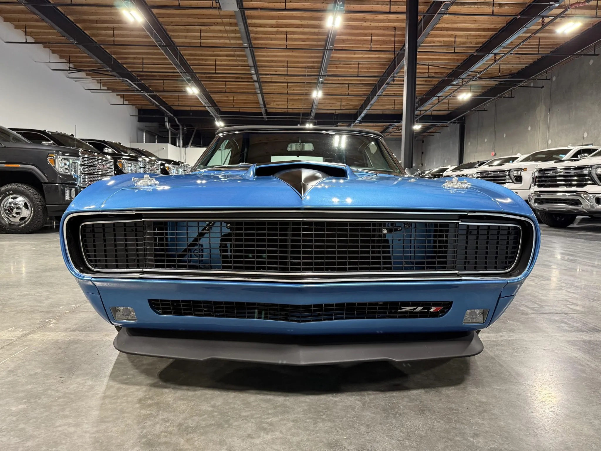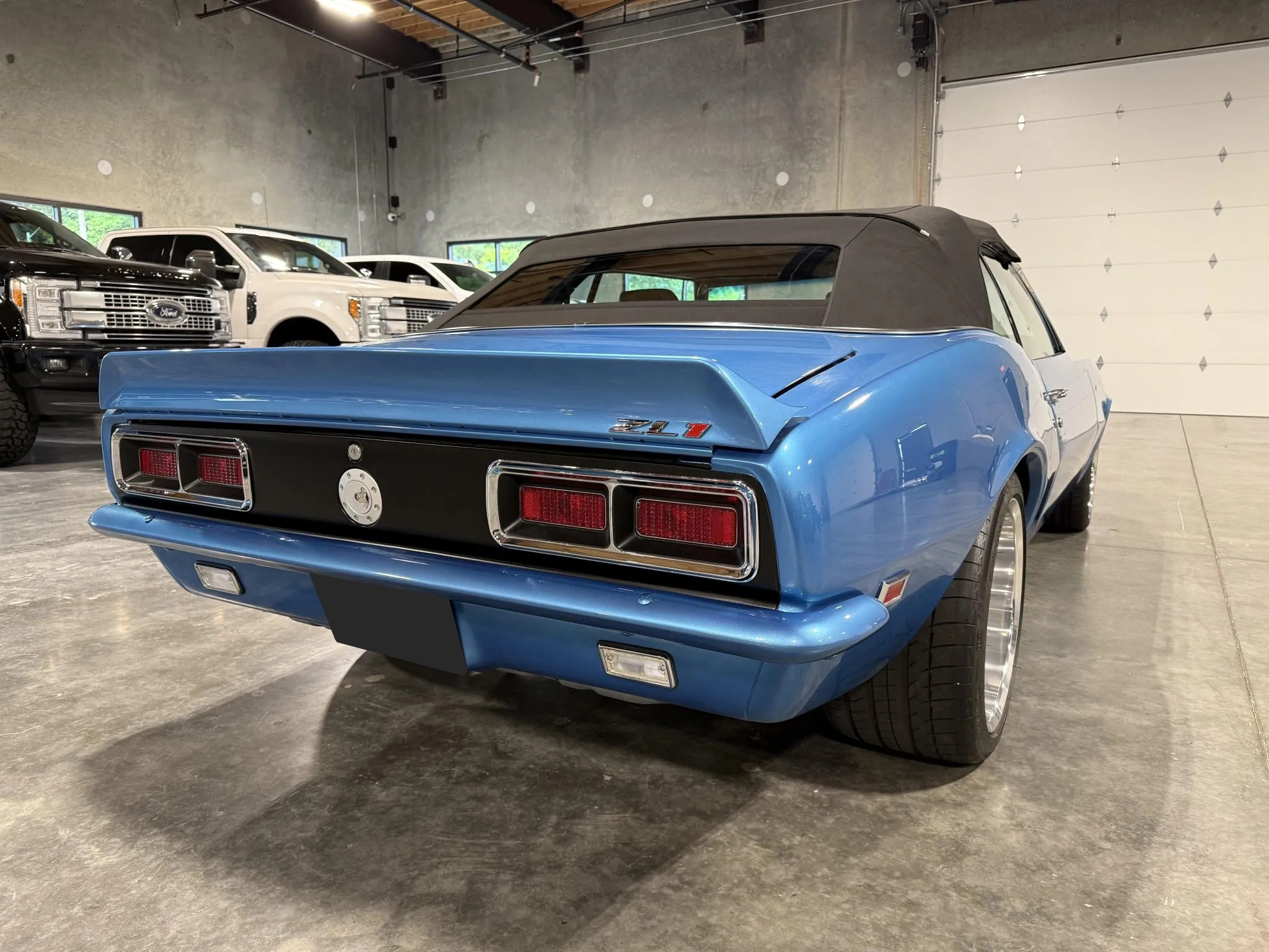 The car is finished in LeMans Blue with a black soft top and features a stinger-style hood, RS-style hideaway headlights, front and rear spoilers, ZL1 badging, and a body-color rear bumper.
