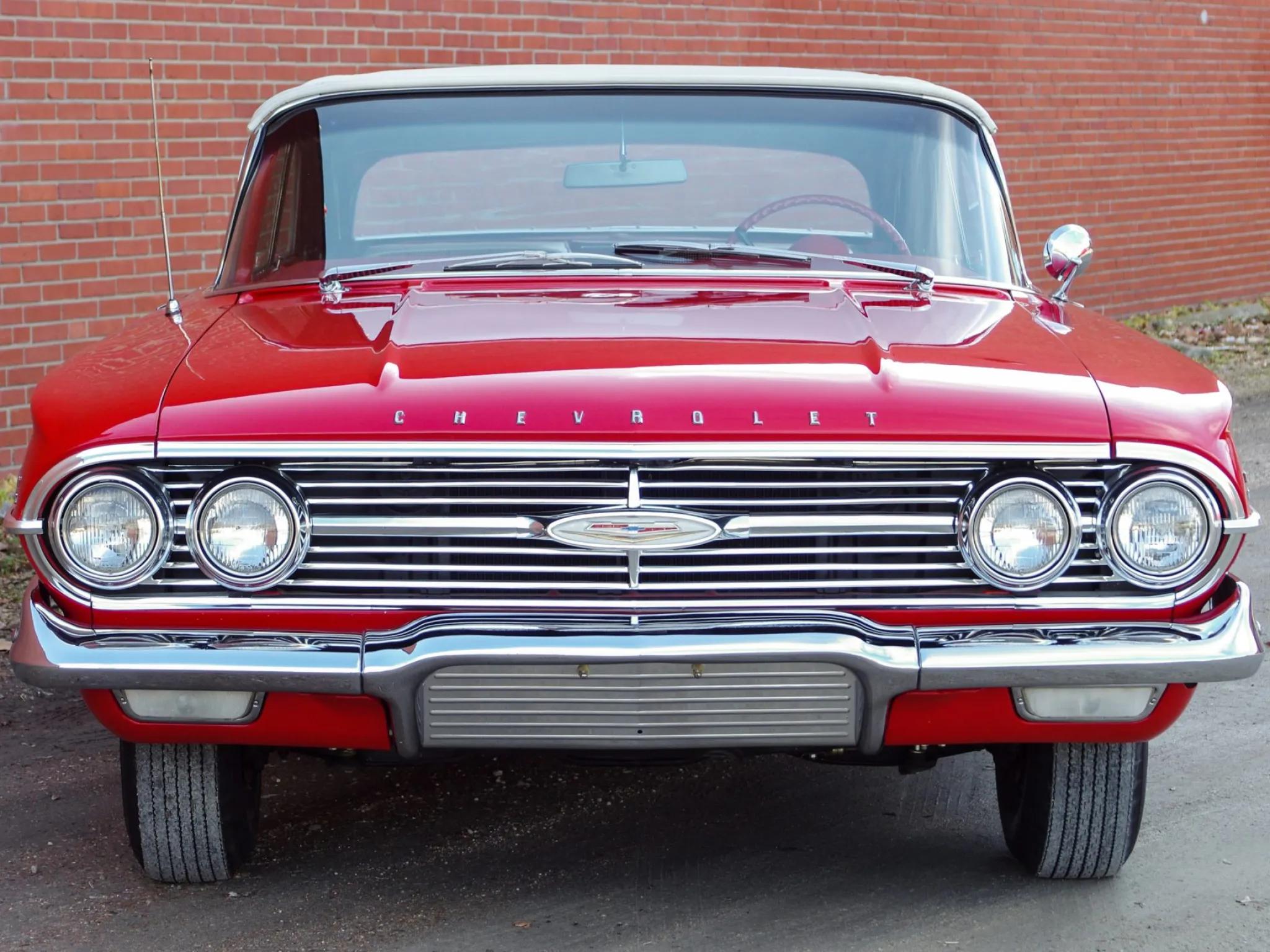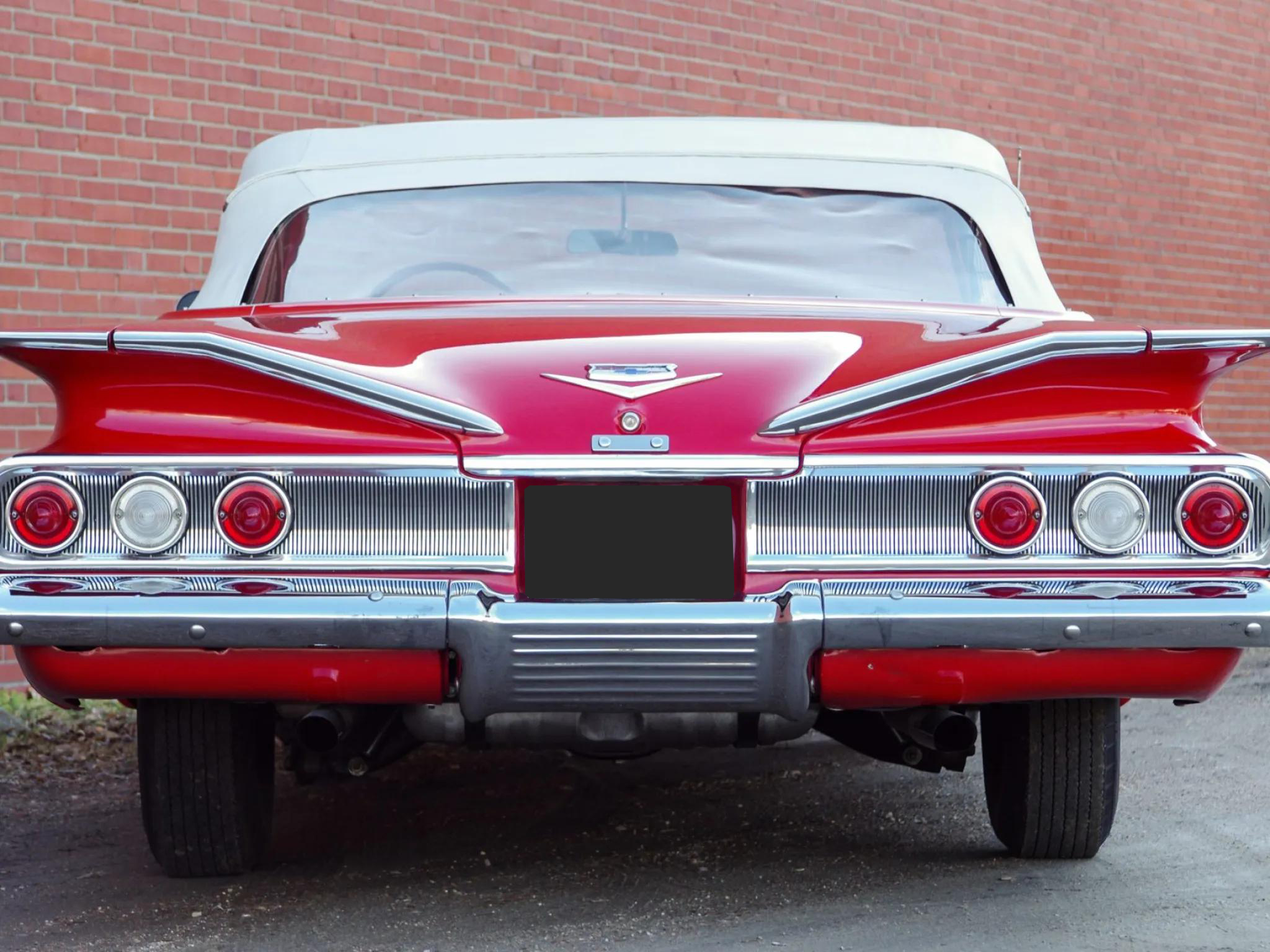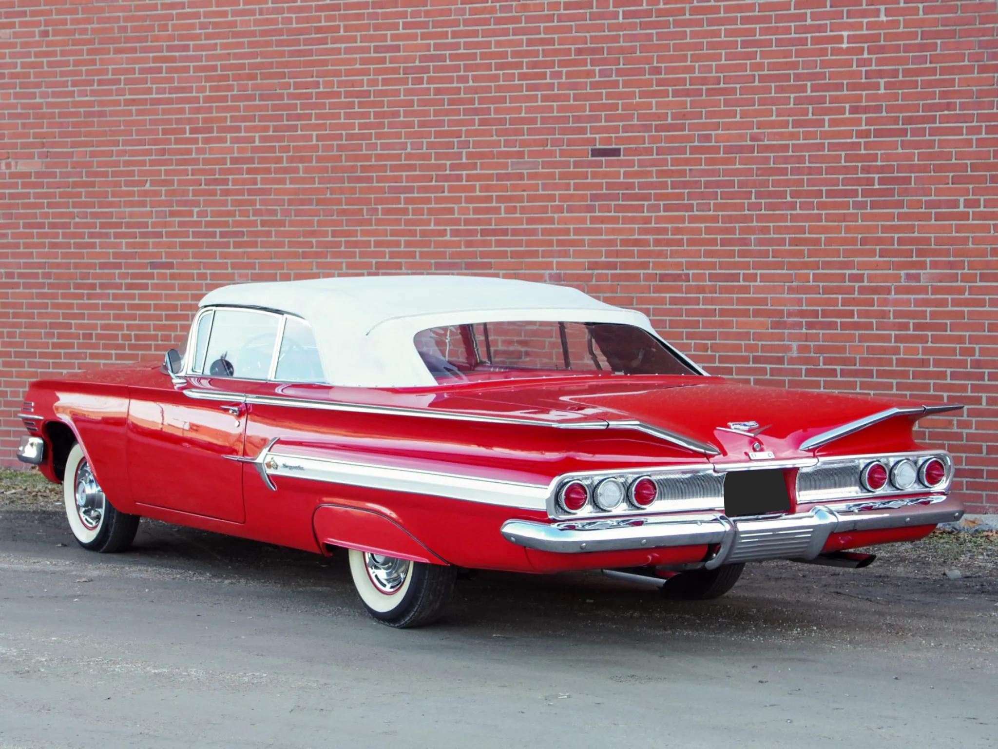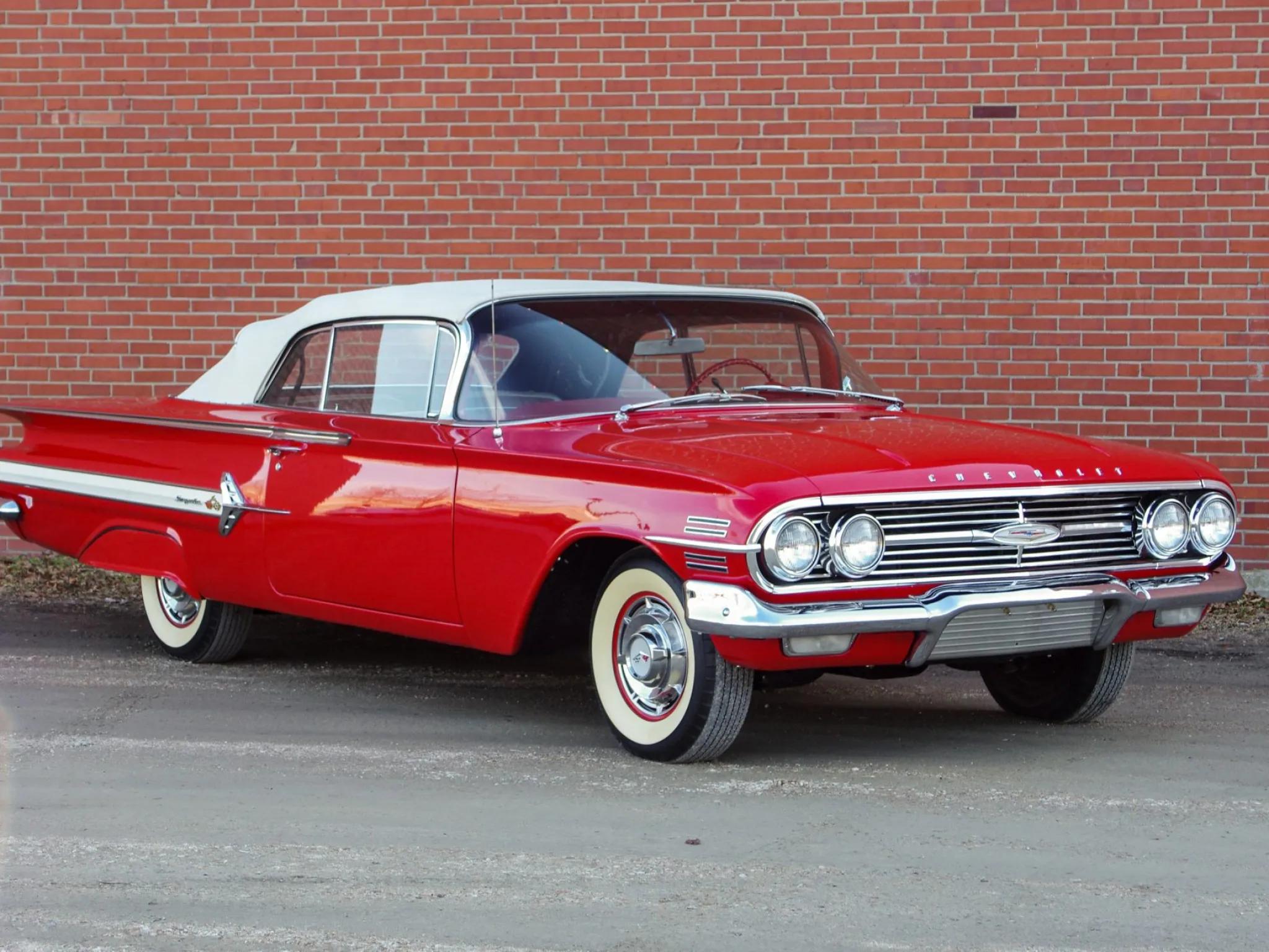 This 1960 Chevrolet Impala convertible is powered by a 283ci V8 paired with a two-speed Powerglide automatic transmission. The car is finished in red with a white power-operated convertible top and a matching boot cover. Exterior details include quad headlights, chrome bumpers, a driver-side mirror, rear fender skirts, horizontal tail fins, separate taillights, and bright trim. The 14" steel wheels wear faux-knockoff-style polished covers and Allstate Guardsman whitewall bias ply tires.