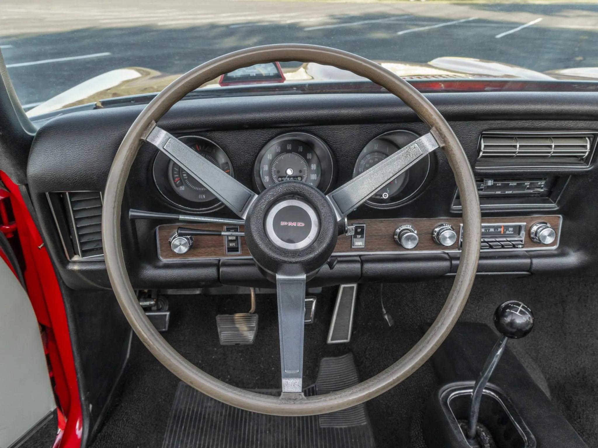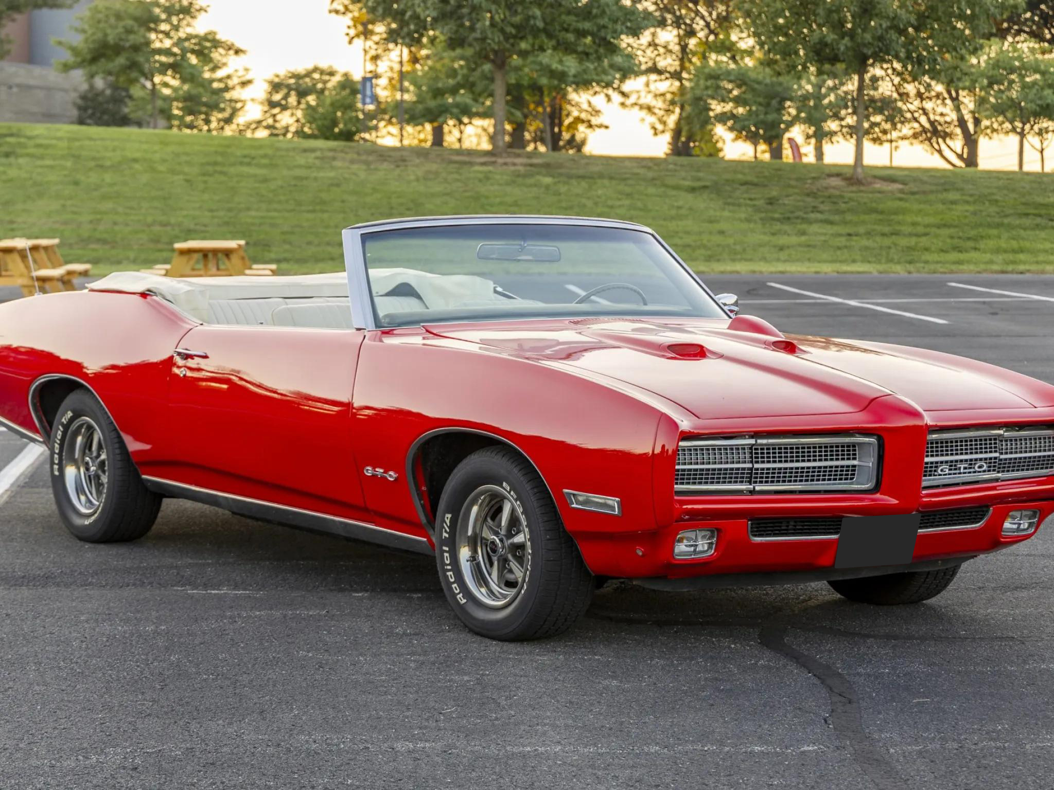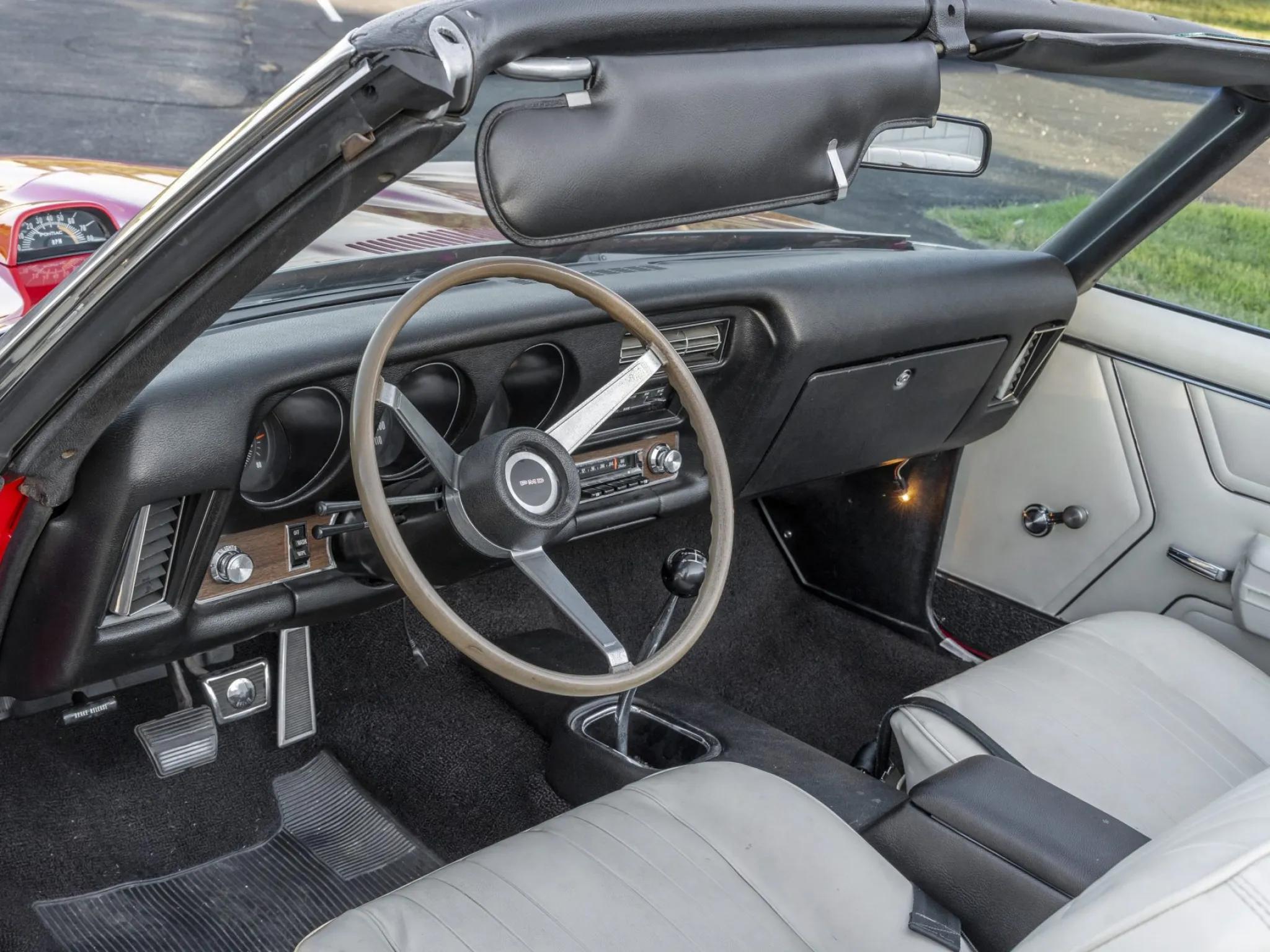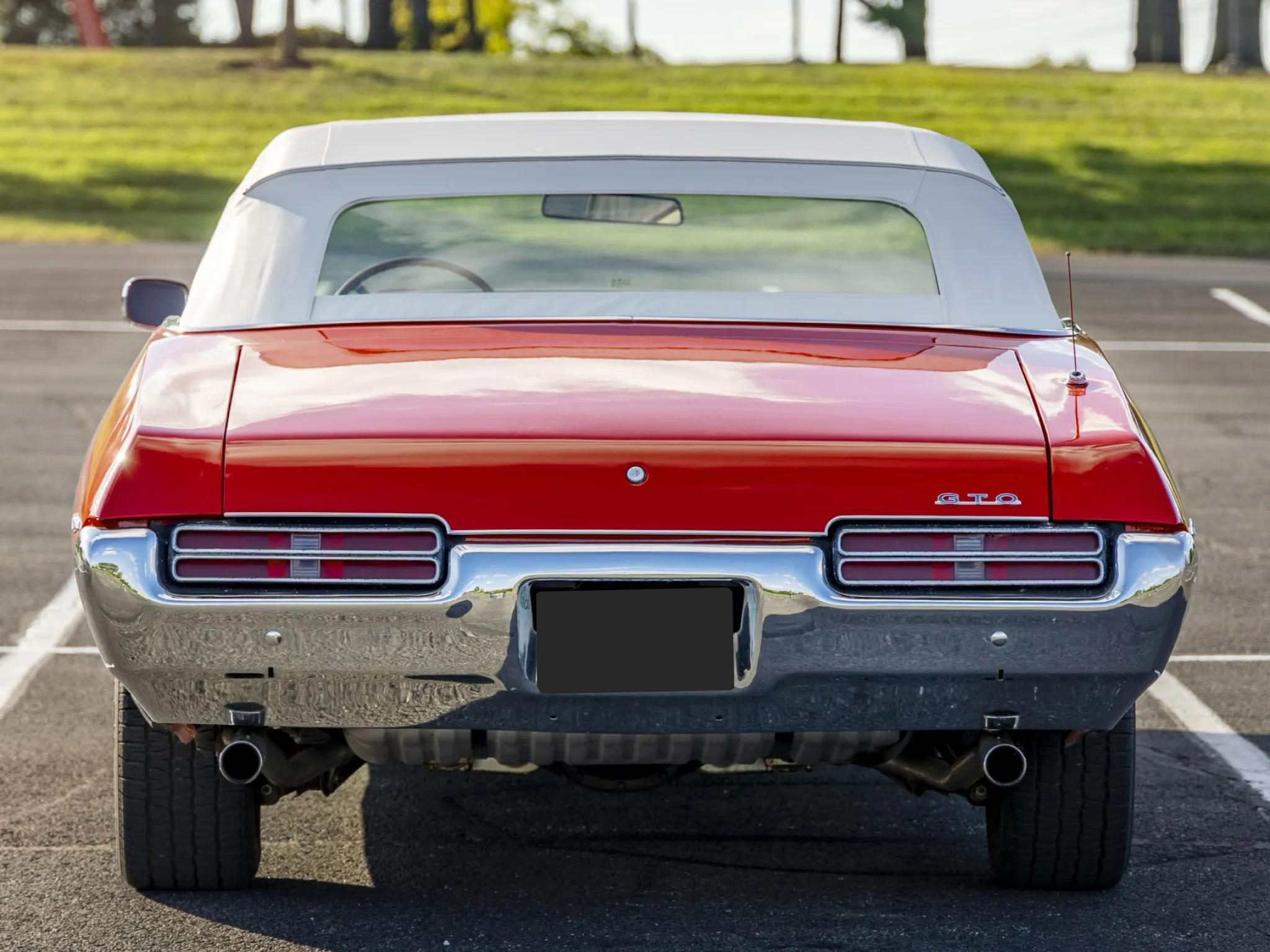This 1969 Pontiac GTO convertible is powered by a 400ci V8 paired with a four-speed manual transmission and a 3.90:1 rear differential. The car is finished in red with a white power-operated convertible top and features a body-color front bumper, chrome rear bumper, faux hood scoops, and bright wheel arch and rocker molding trim.