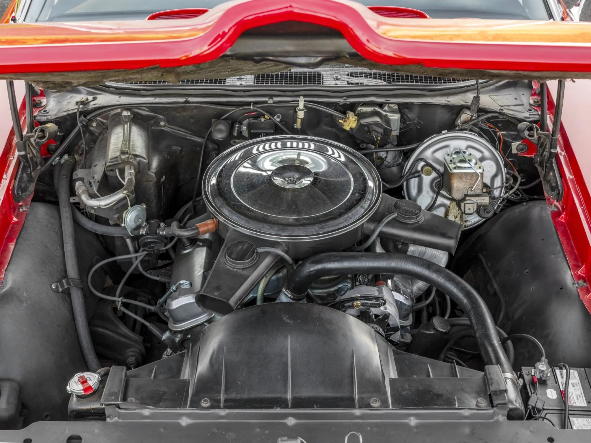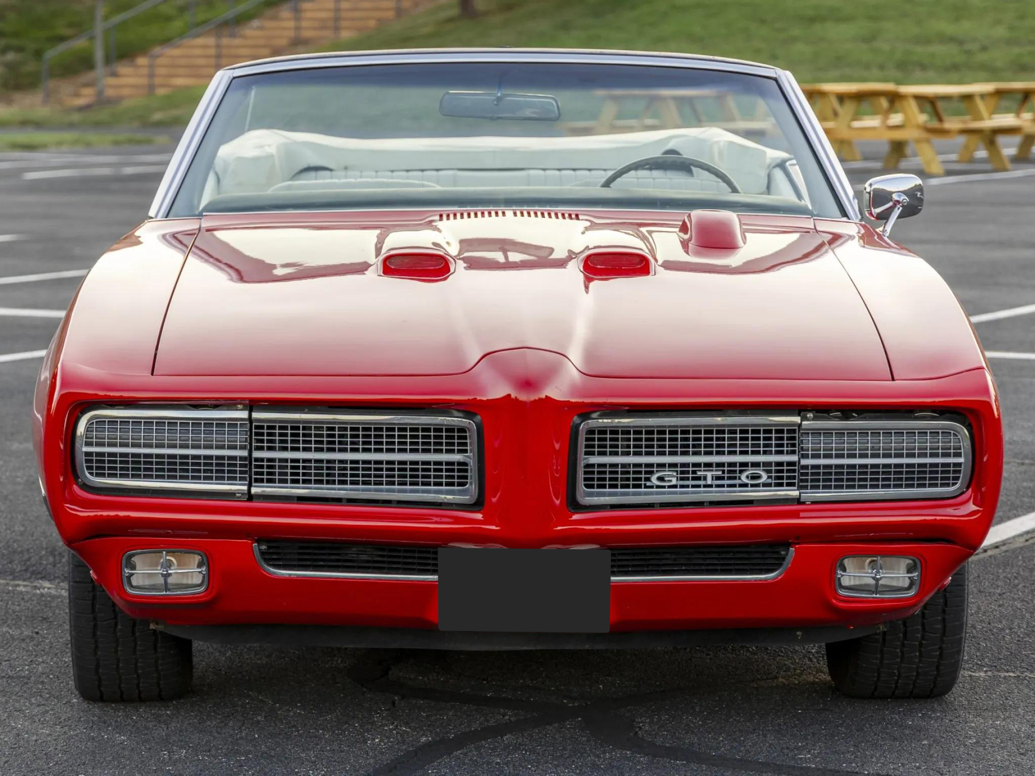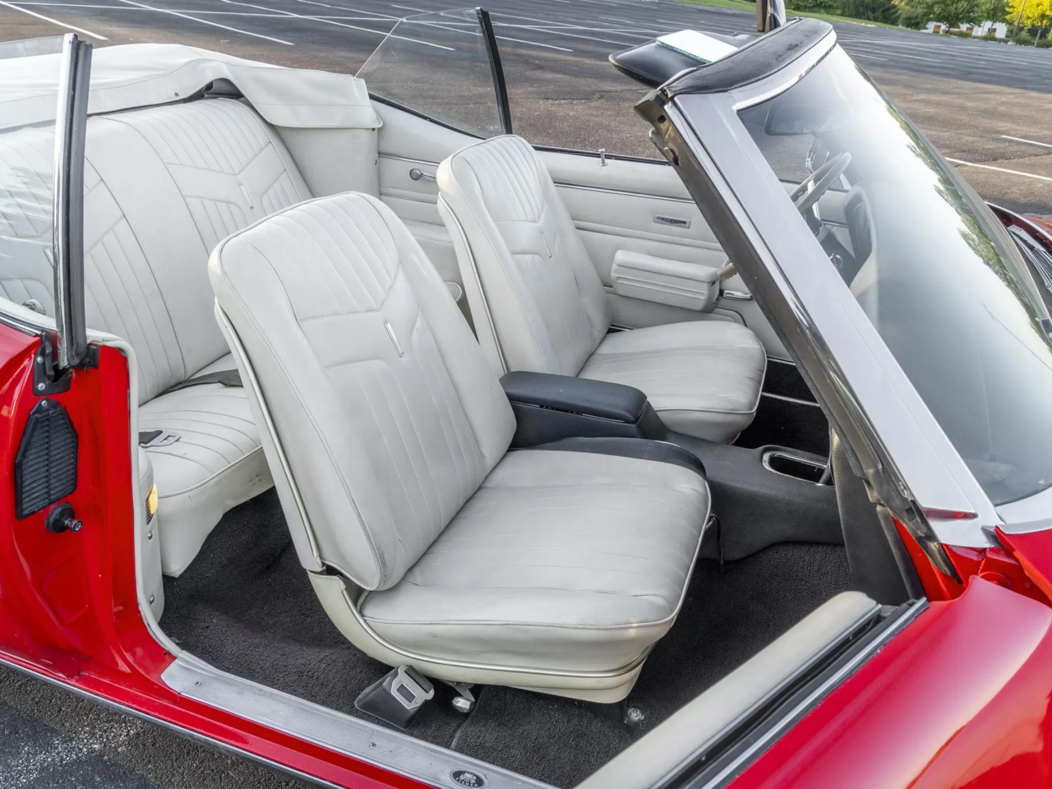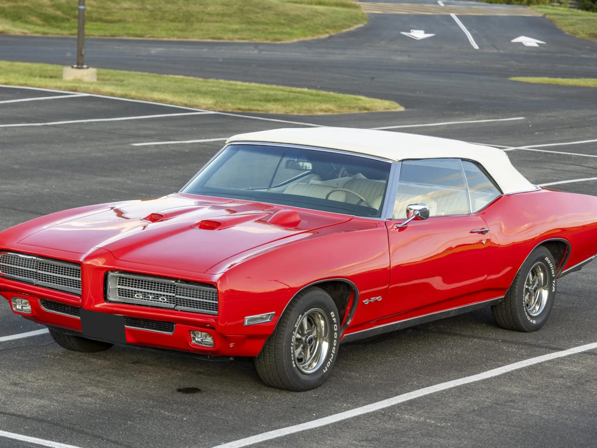 This 1969 Pontiac GTO convertible is powered by a 400ci V8 paired with a four-speed manual transmission and a 3.90:1 rear differential. The car is finished in red with a white power-operated convertible top and features a body-color front bumper, chrome rear bumper, faux hood scoops, and bright wheel arch and rocker molding trim.