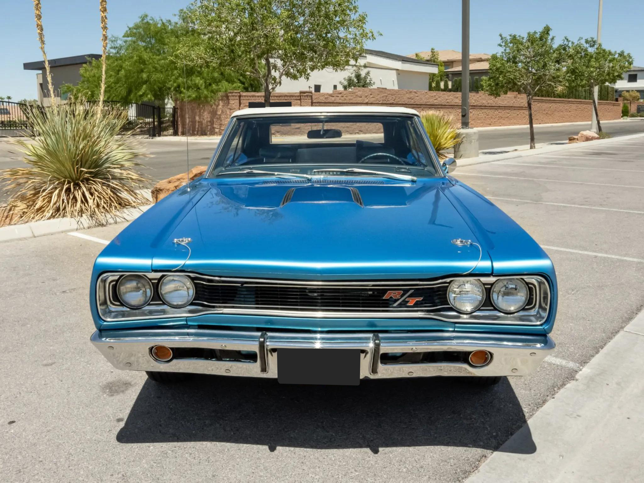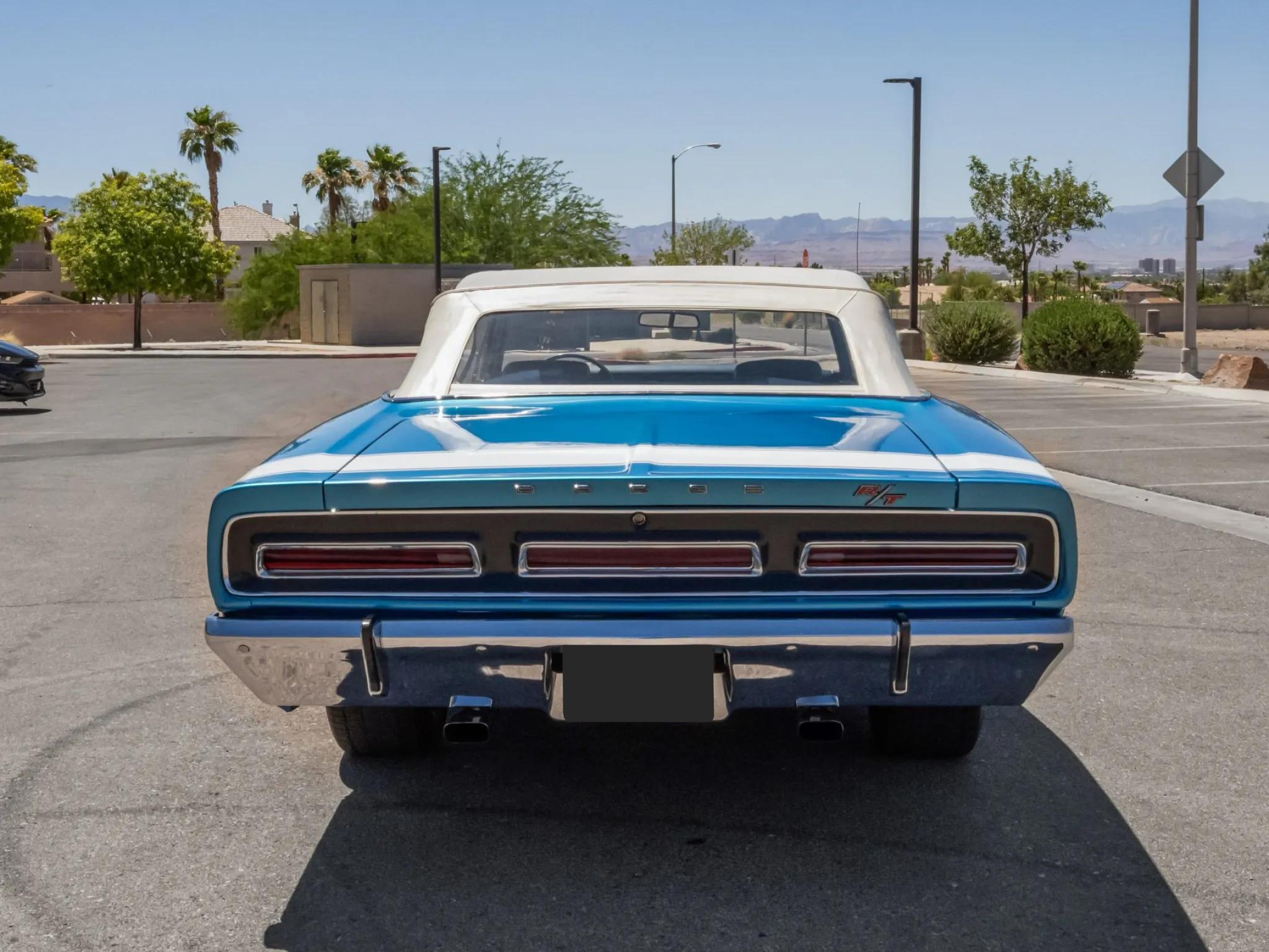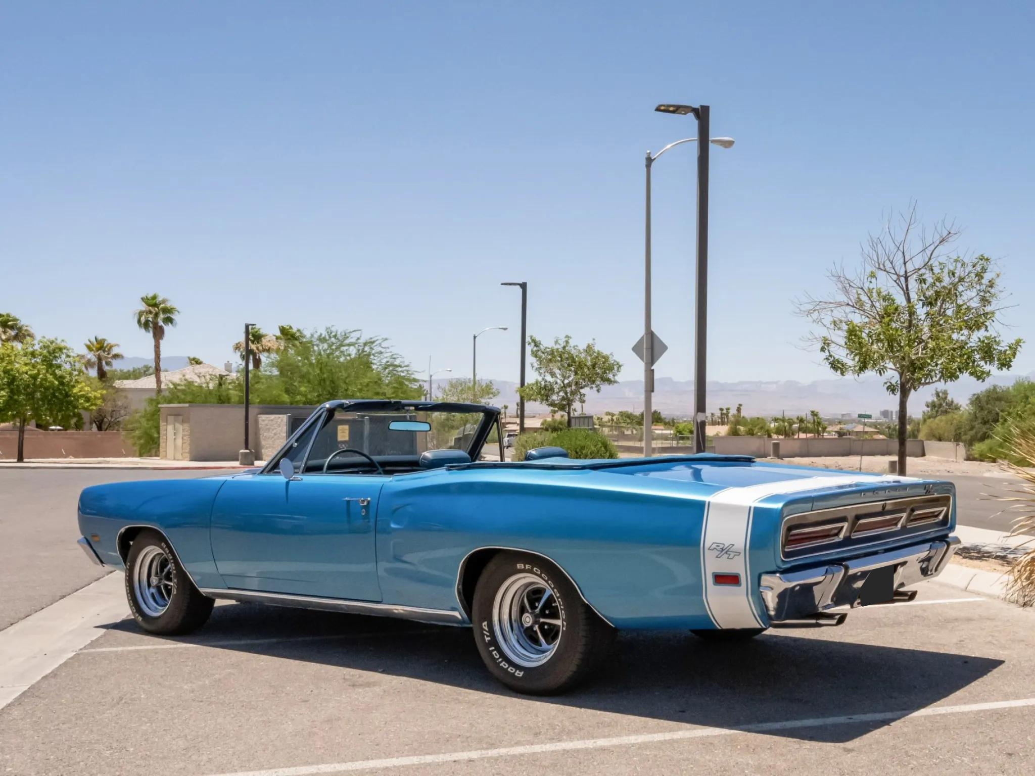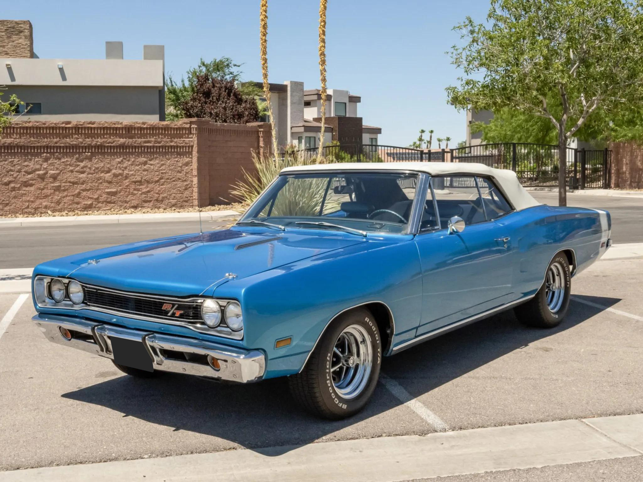 This 1969 Dodge Coronet R/T convertible is powered by a 440ci Magnum V8 equipped with a triple-carburetor induction setup paired with a TorqueFlite three-speed automatic transmission. The car is finished in Bright Blue with a power-retractable white soft top and features quad headlights, hood scoops, a rear bumblebee stripe, and chrome bumpers.
