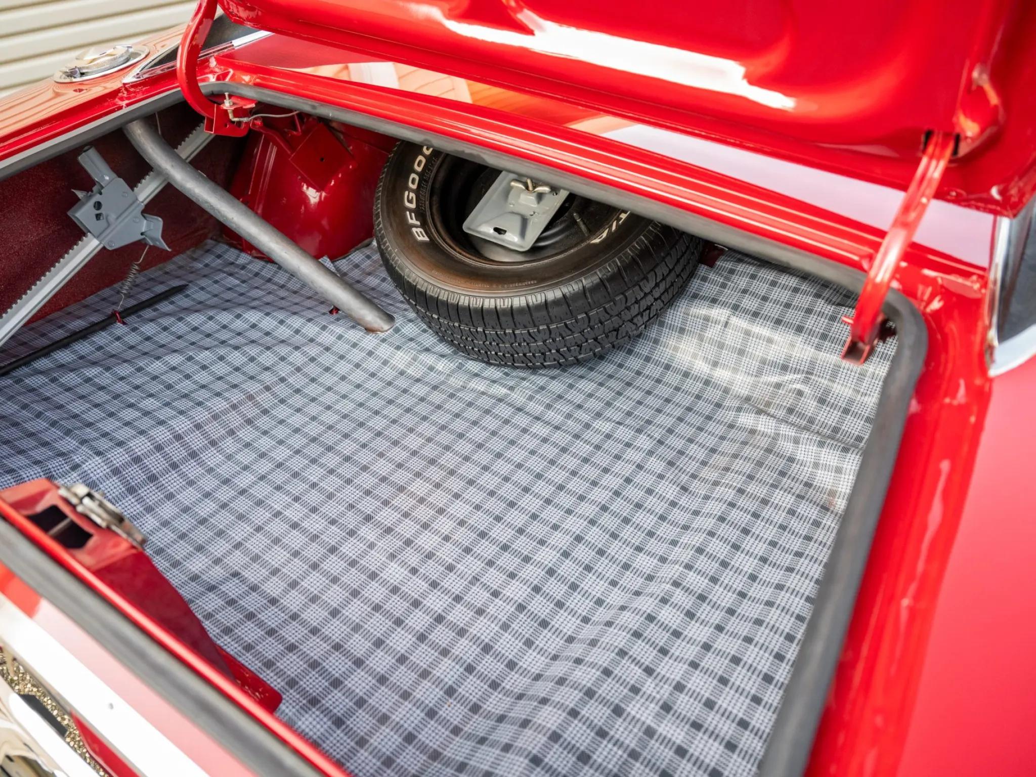 Body-color 15" steel wheels wear redline hubcaps and FR70 Firestone Super Sports-branded tires. The car is equipped with power steering, 11" front and 10" rear drum brakes, and a larger-diameter sway bar.