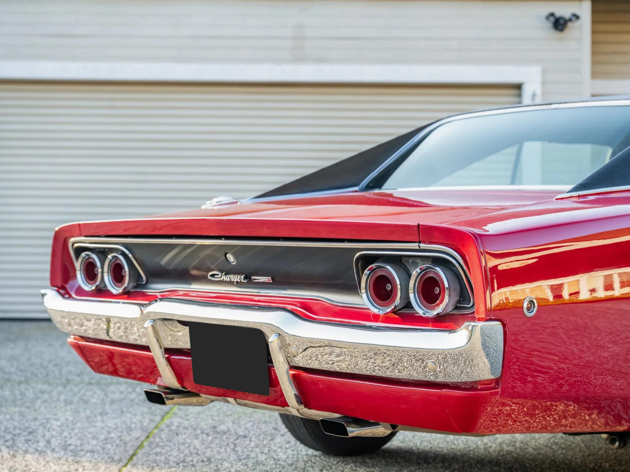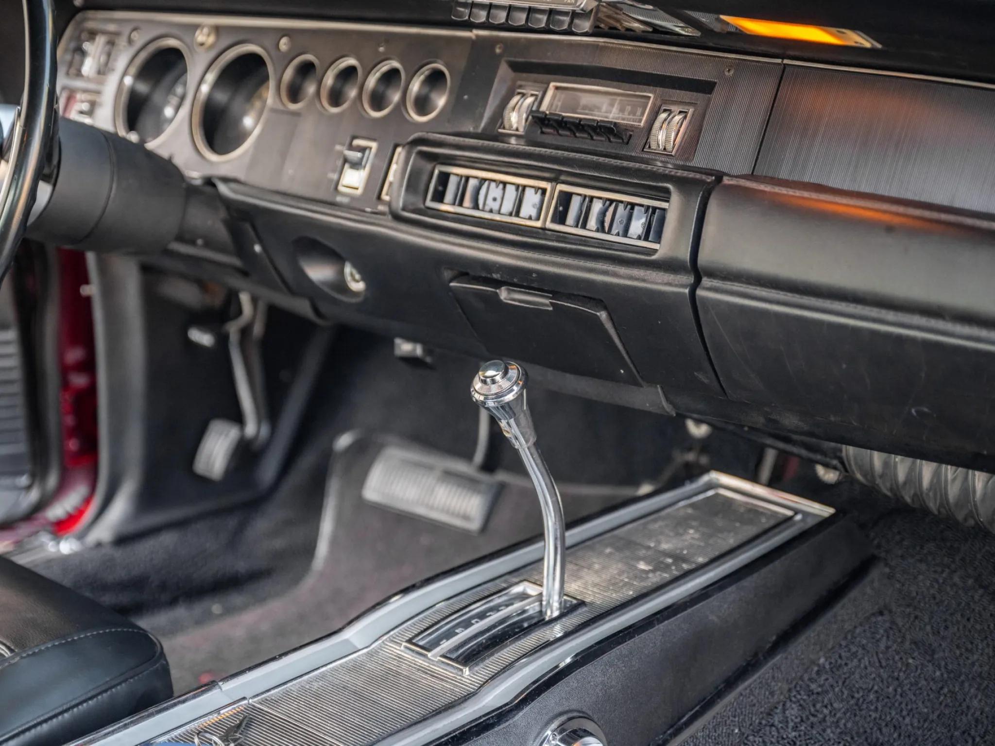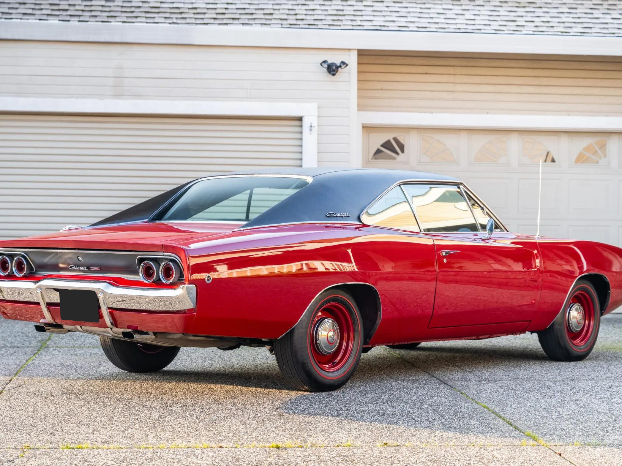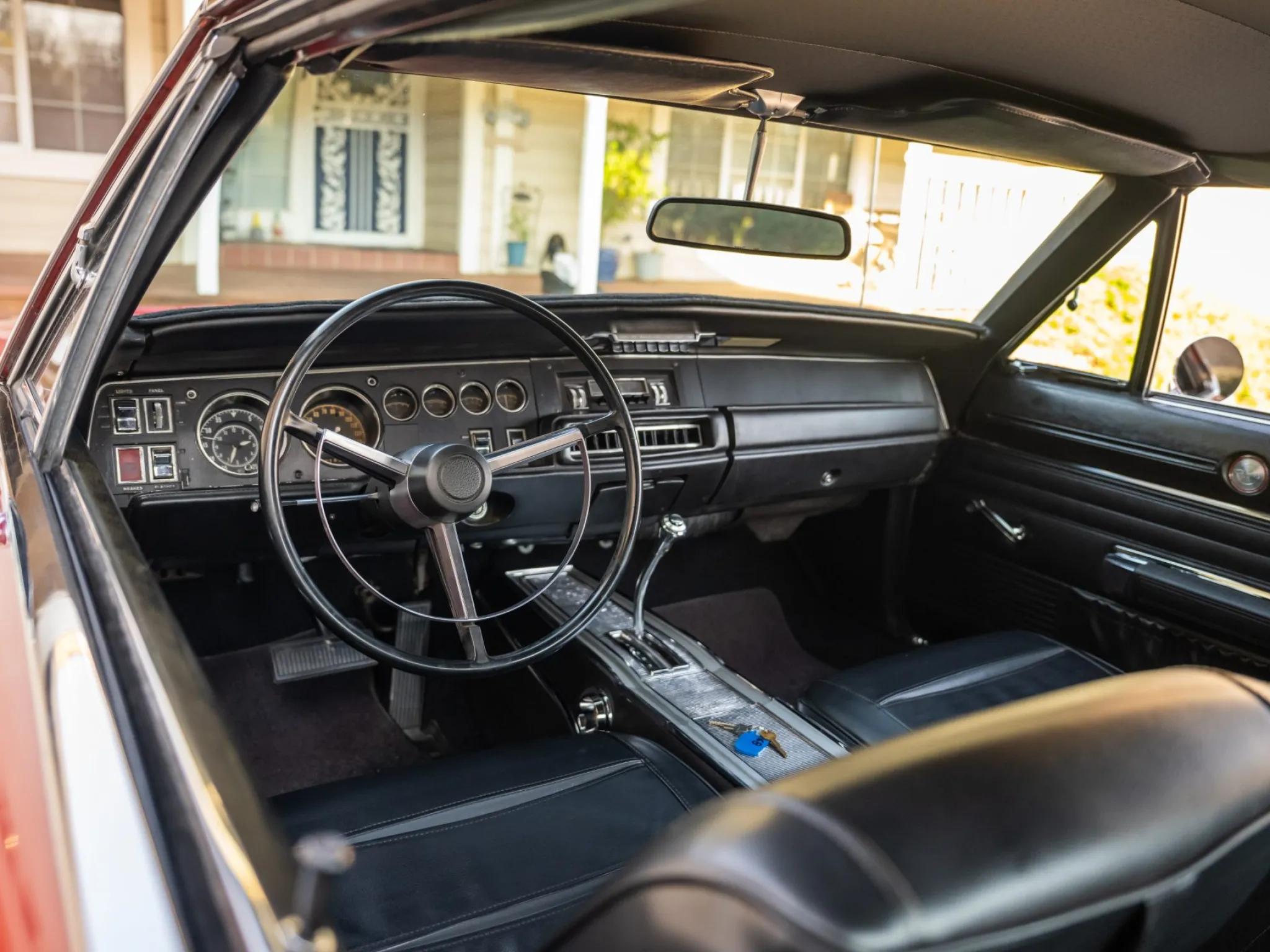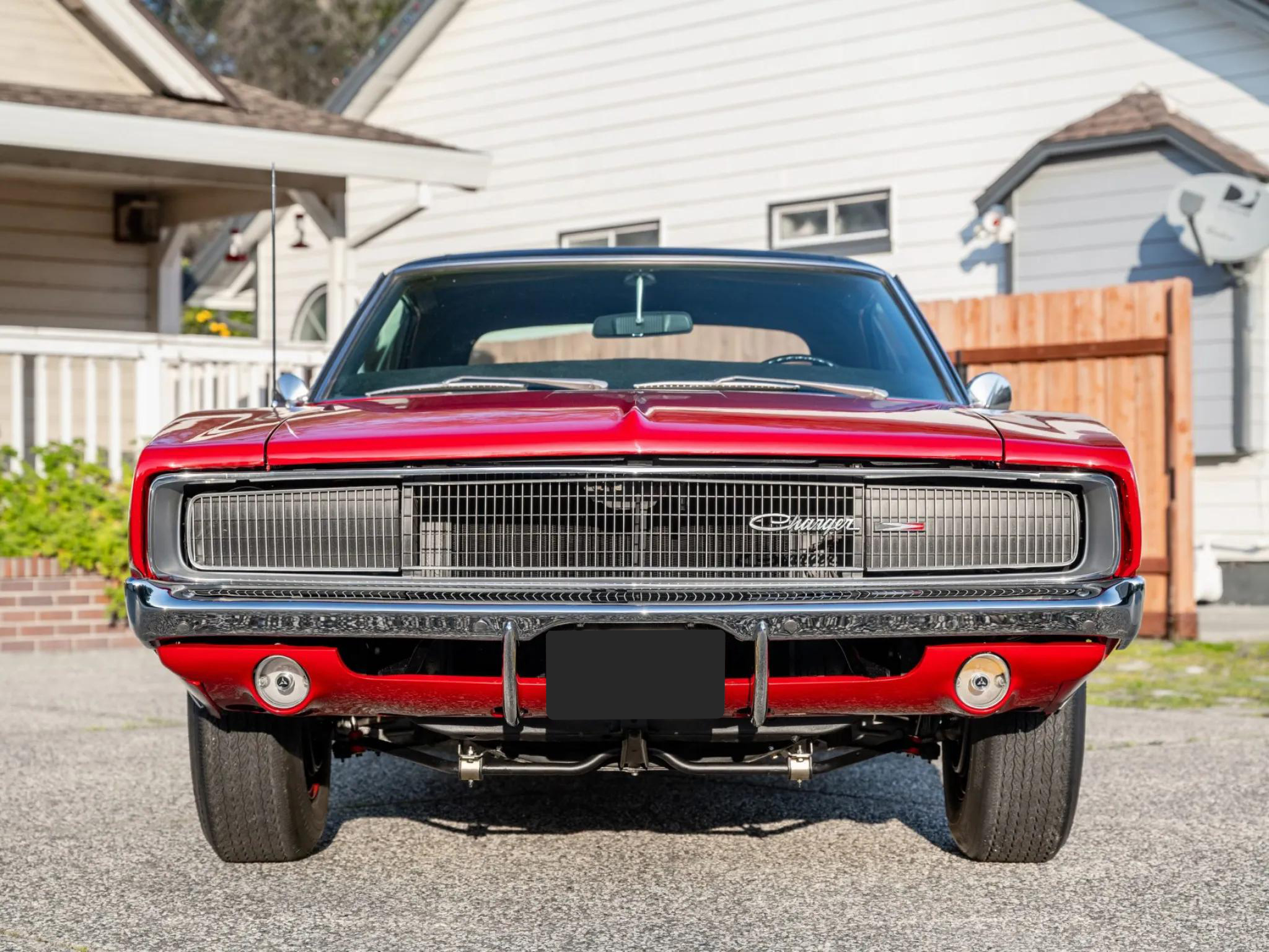 This 1968 Dodge Charger is powered by a 318ci V8 paired with a three-speed automatic transmission and a 2.76:1 rear differential. The car is finished in red with a black vinyl roof and features hideaway headlamps, round side-marker lights, dual mirrors, and re-chromed bumper guards.