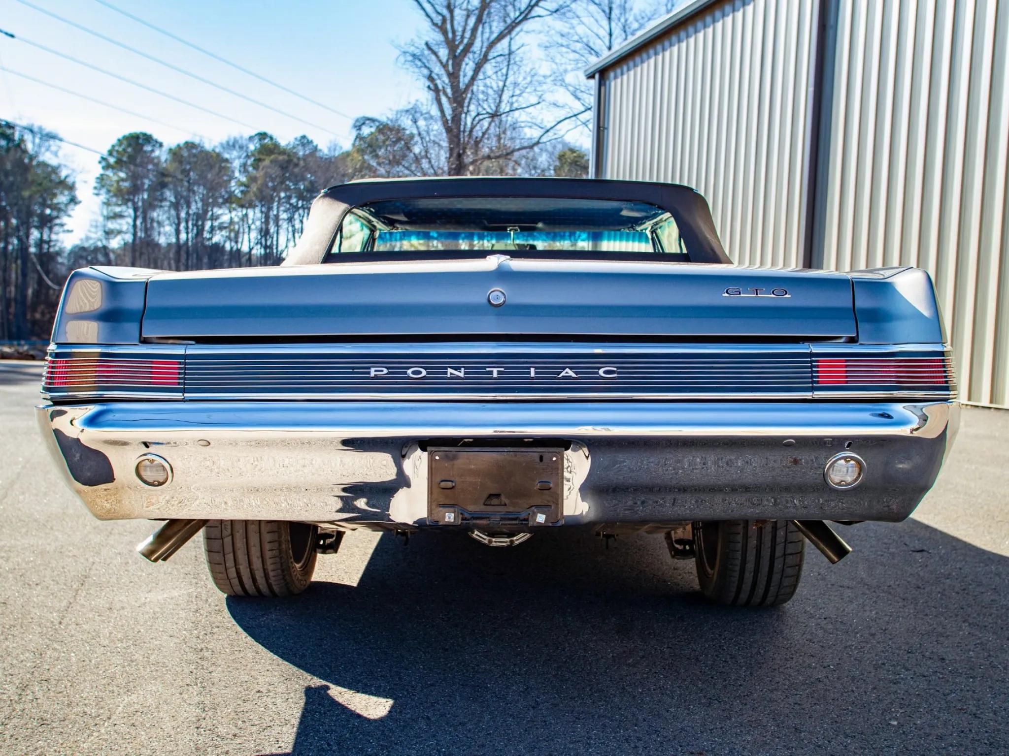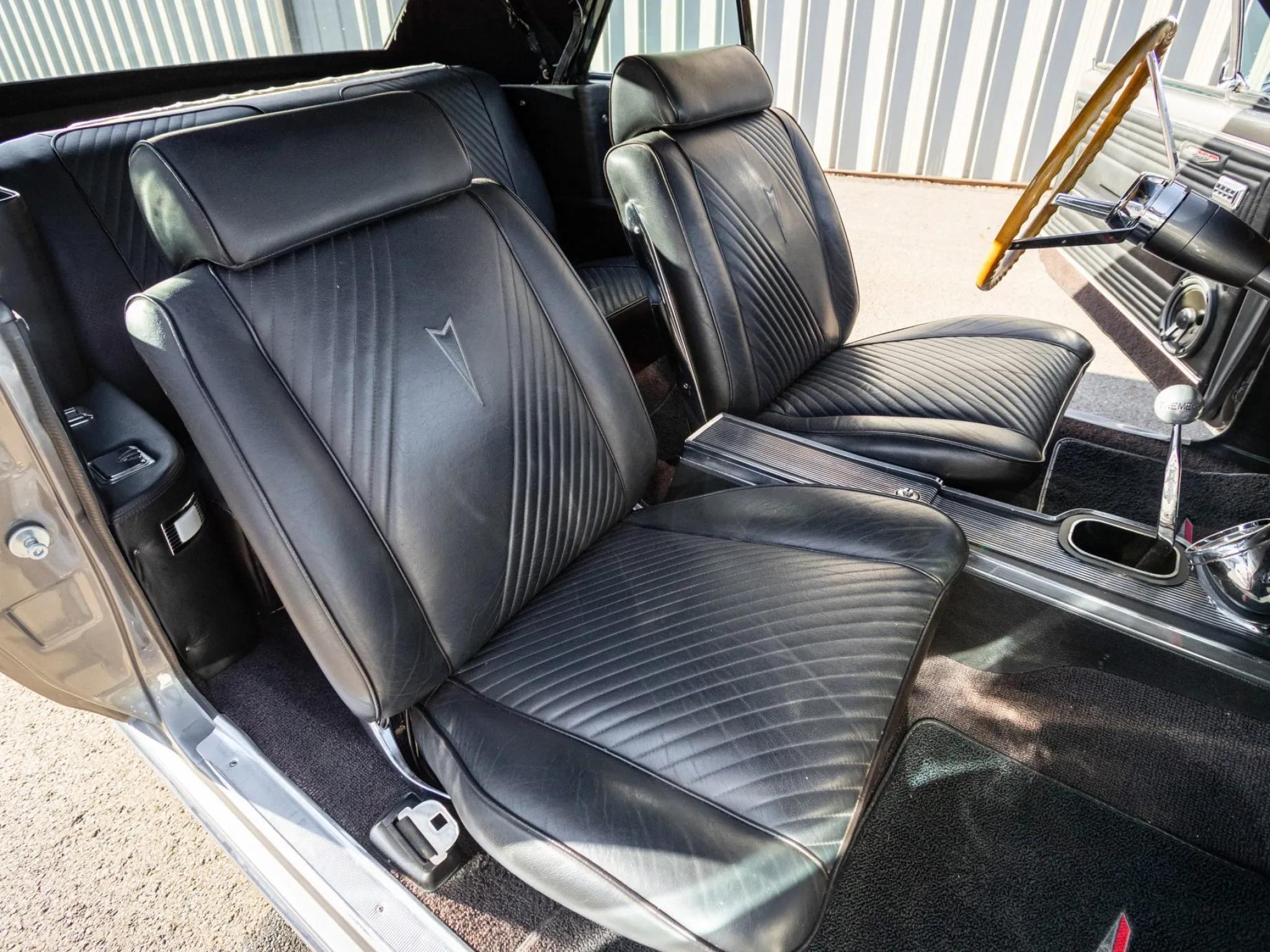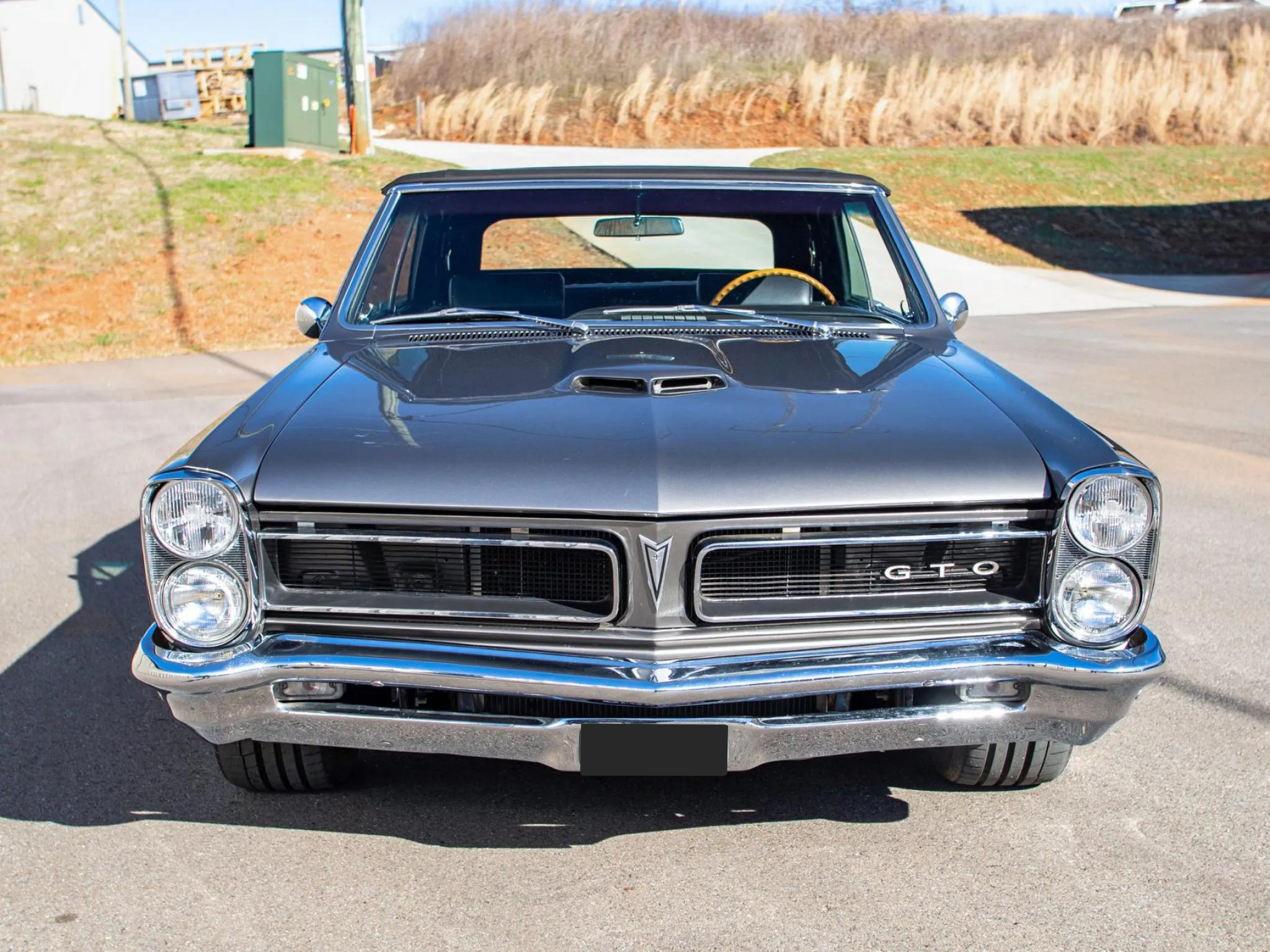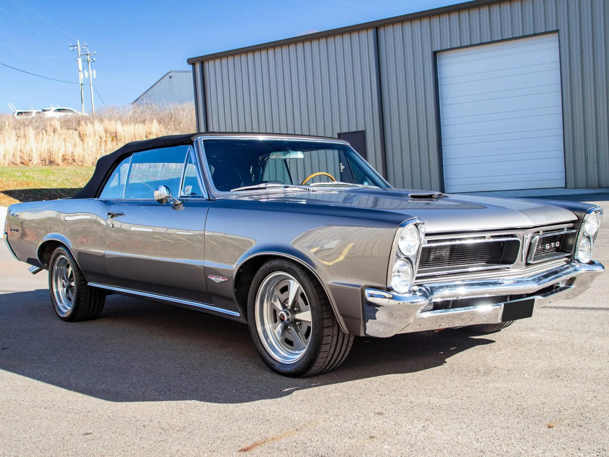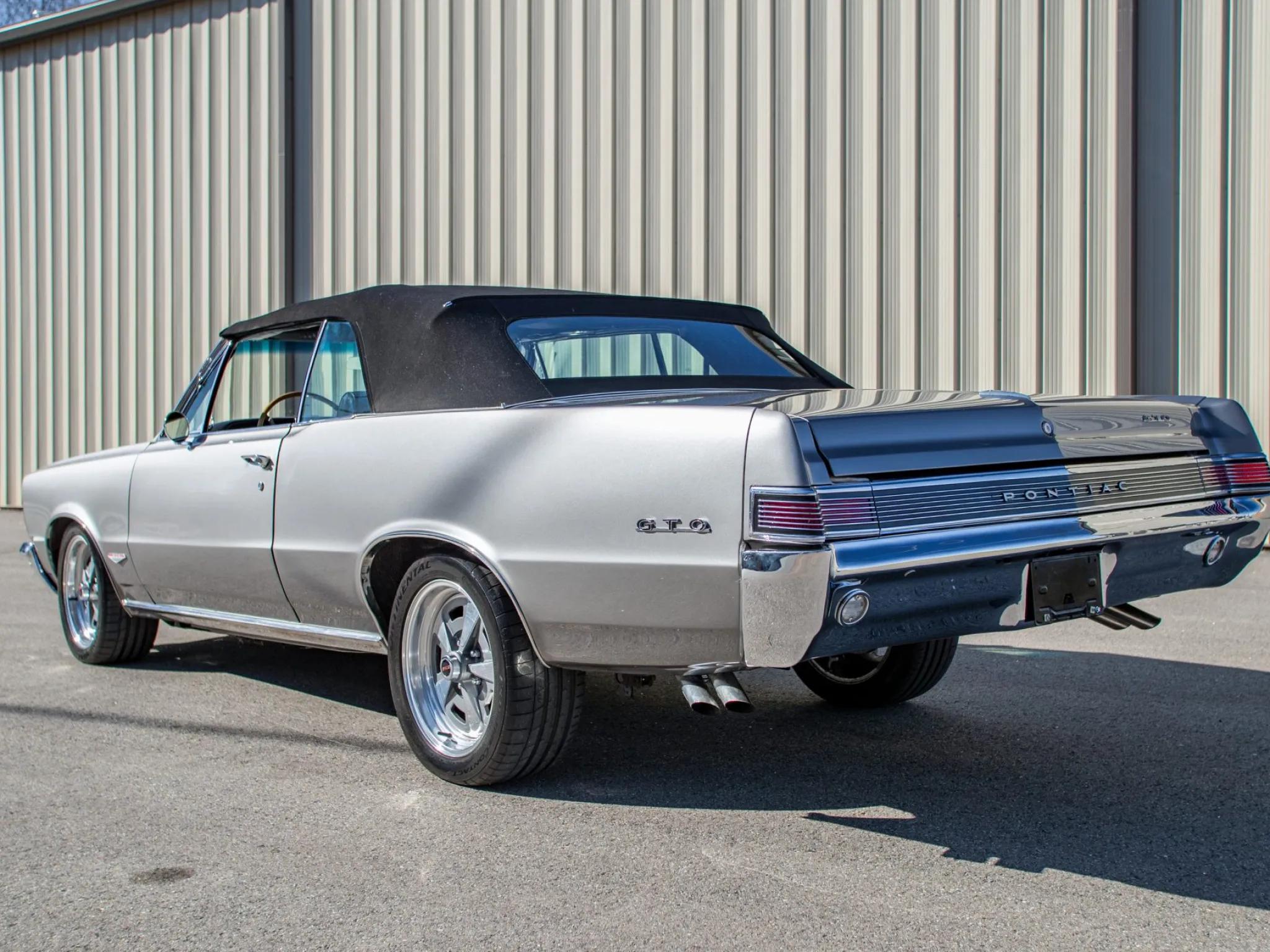 This 1965 Pontiac LeMans convertible was modified in the style of a GTO during a comprehensive 2005 refurbishment. The body was removed from the frame, placed on a rotisserie, and refinished in silver. A black canvas soft top with a glass rear window was installed along with GTO-style hood, emblems, and interior trim.