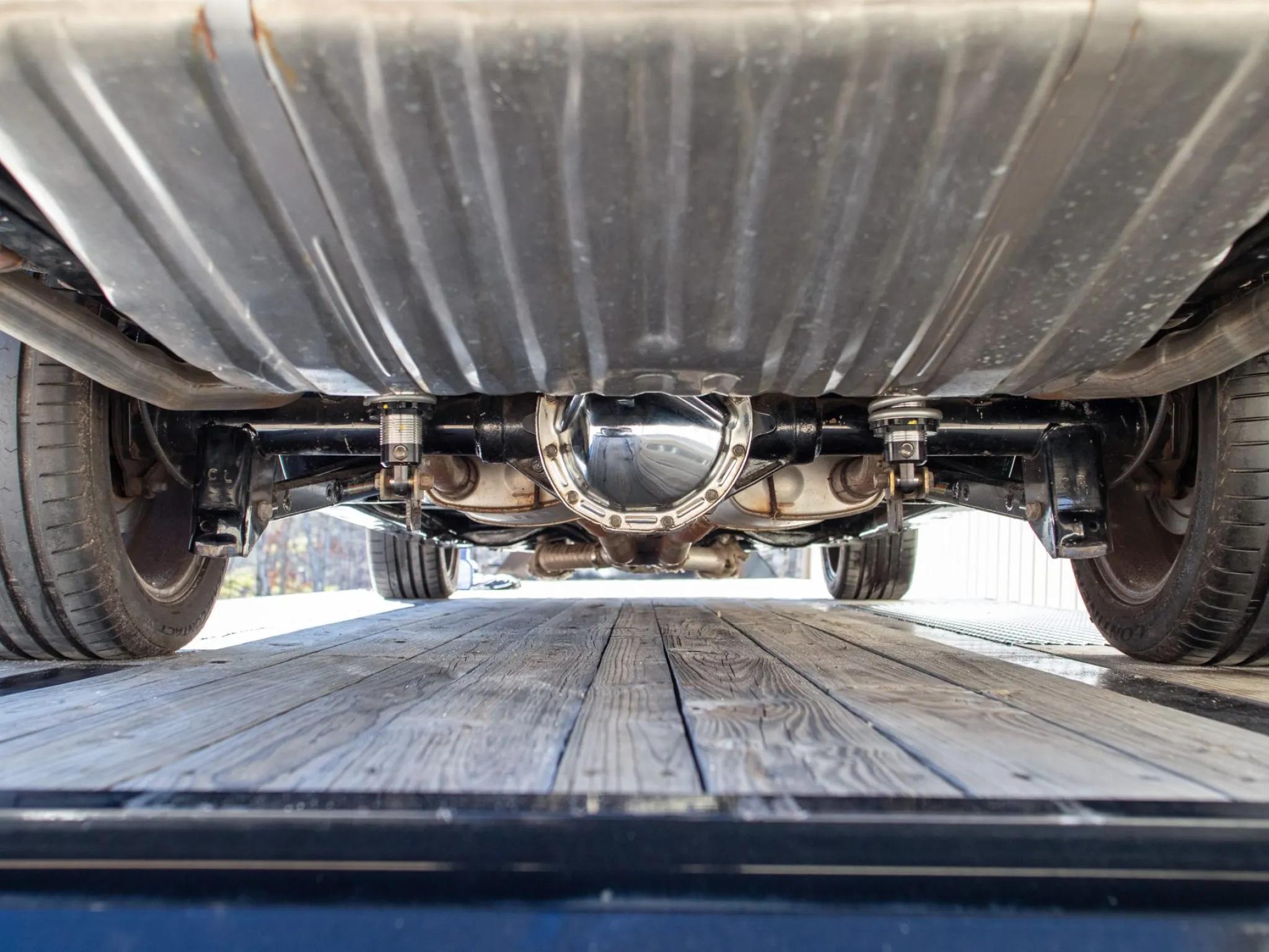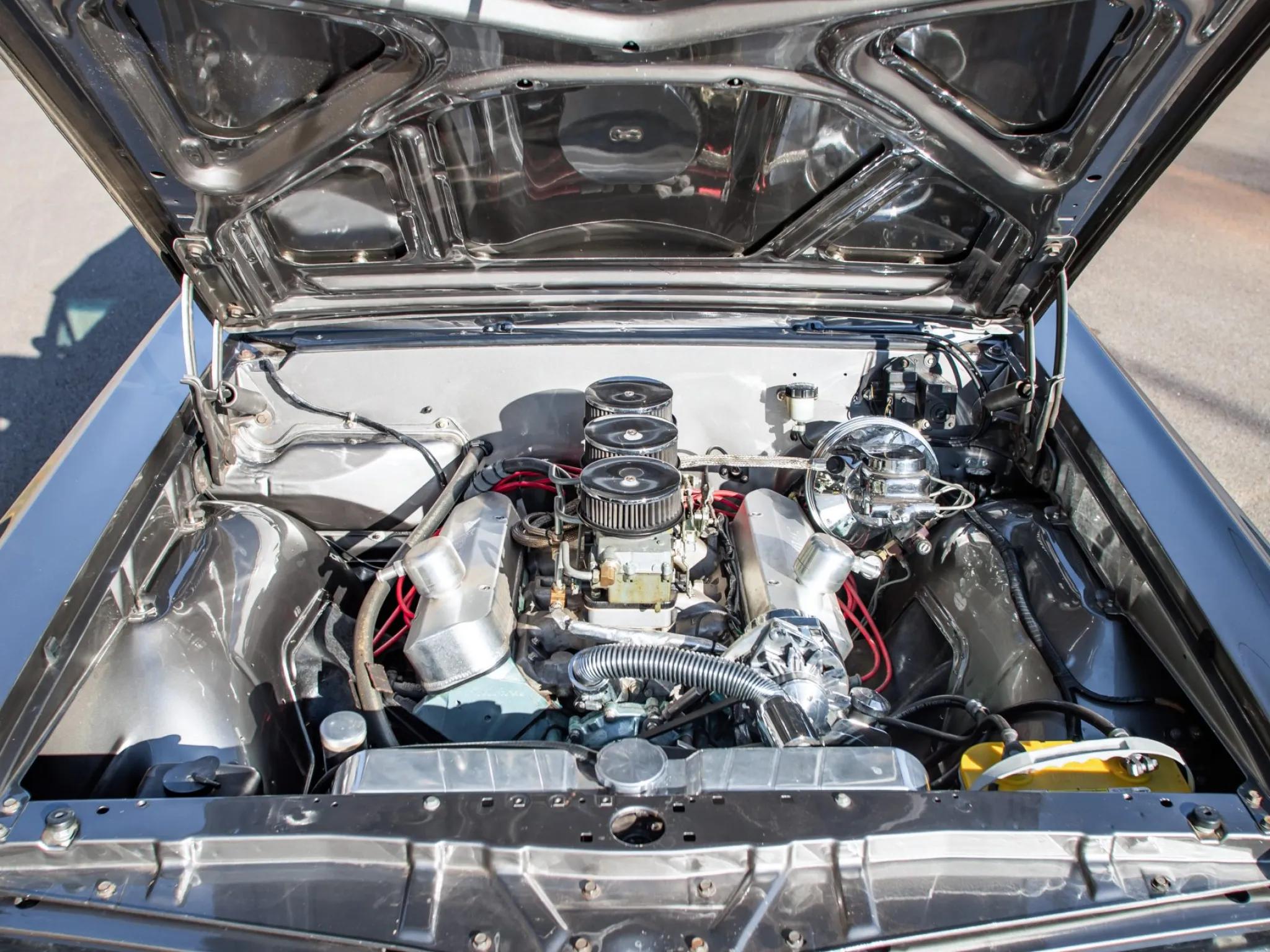Power is provided by a 468ci stroker V8 with forged JE pistons, Eagle H-beam rods, Edelbrock cylinder heads, a roller camshaft, and a Tri-Power induction system with three Rochester two-barrel carburetors. Additional features include a March serpentine drive setup, an aluminum radiator with dual electric fans, and Hedman Husler headers feeding a dual exhaust system. The engine produces over 600 horsepower and is paired with a Tremec five-speed manual transmission and a 12-bolt limited-slip differential with 3.73:1 gears.