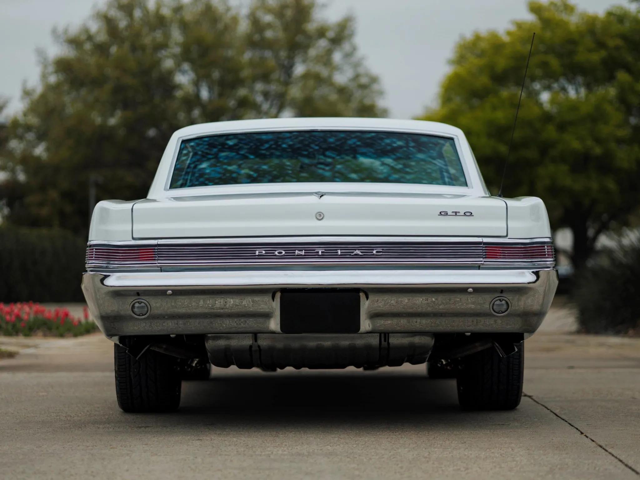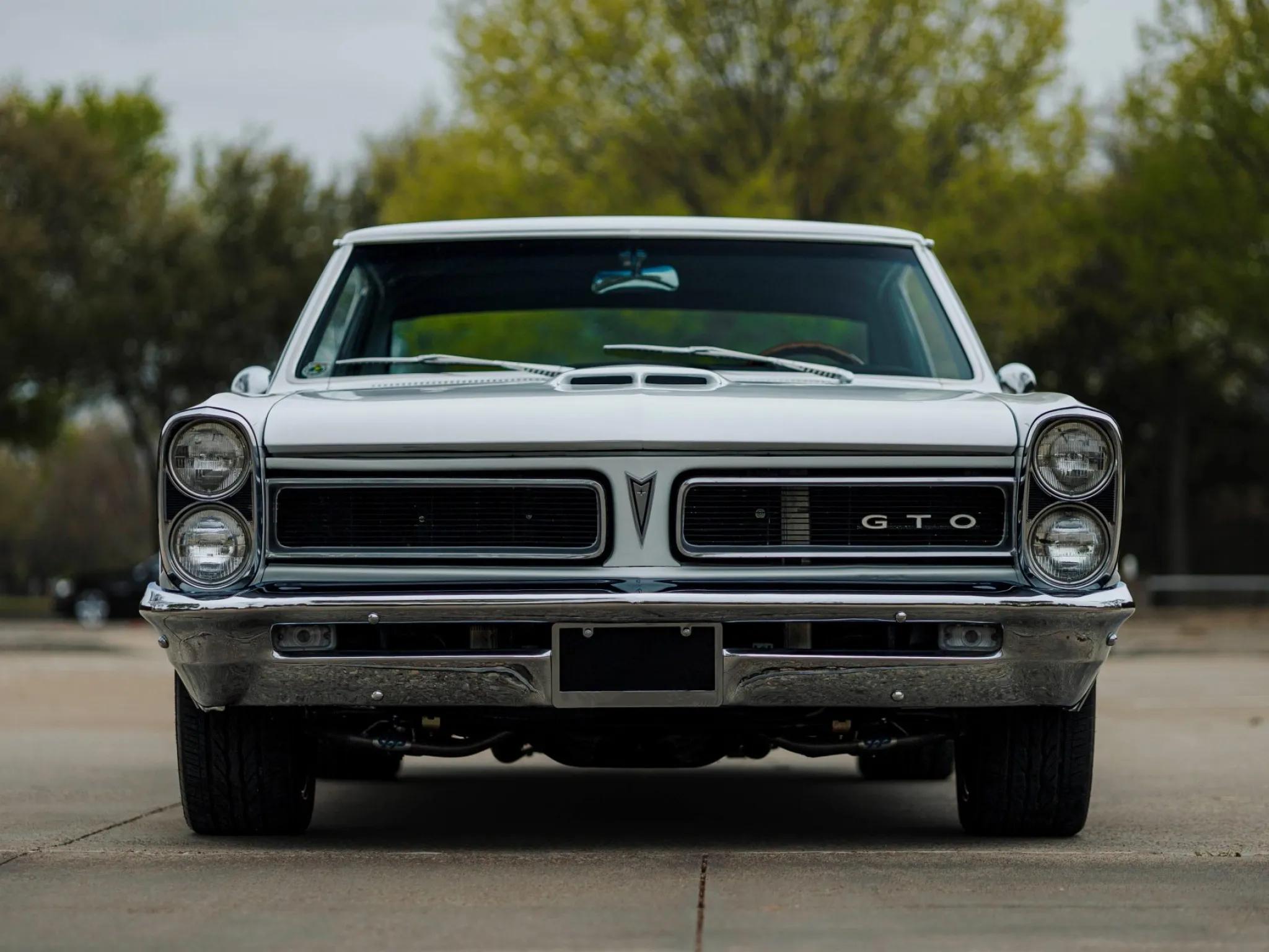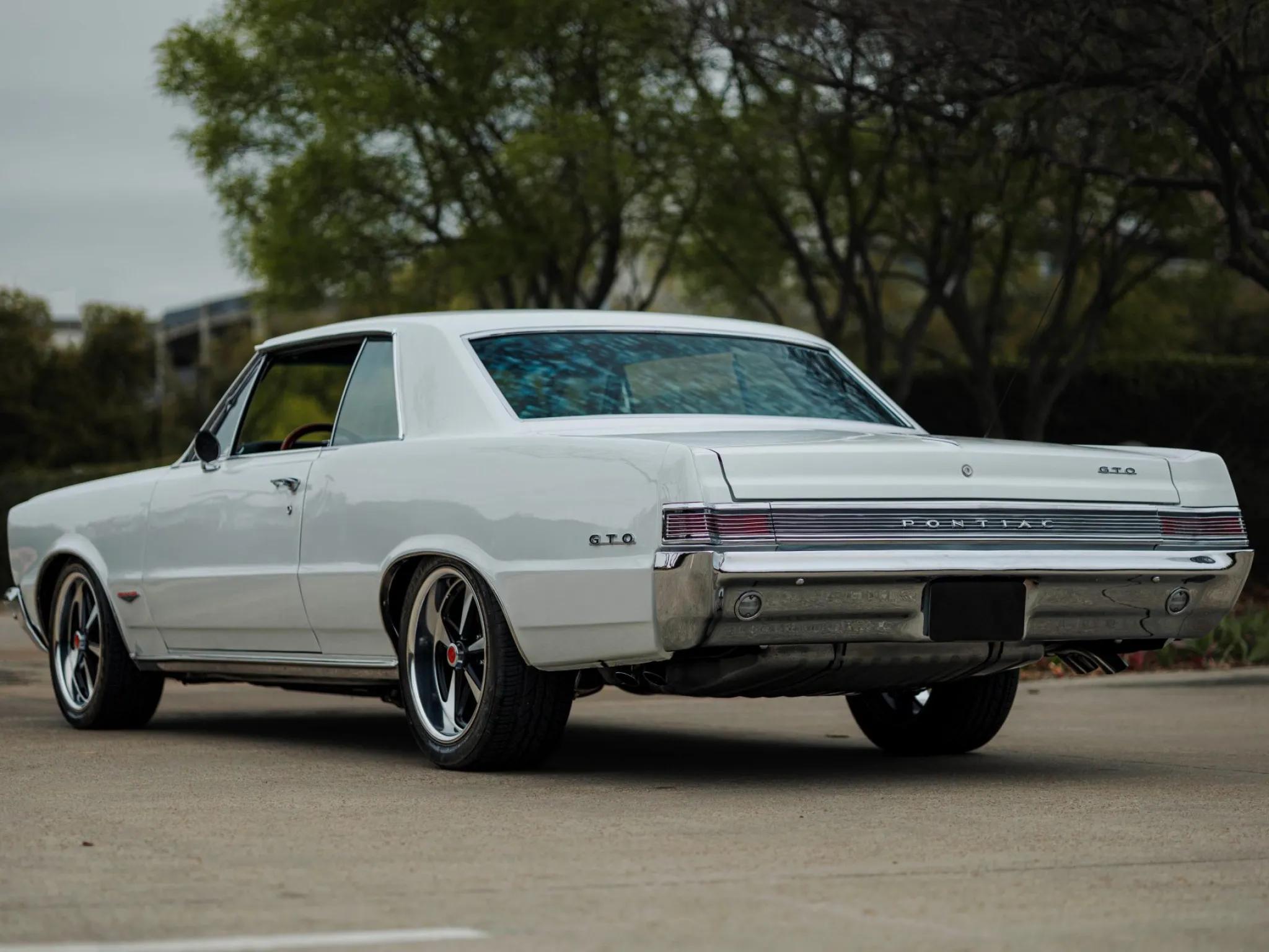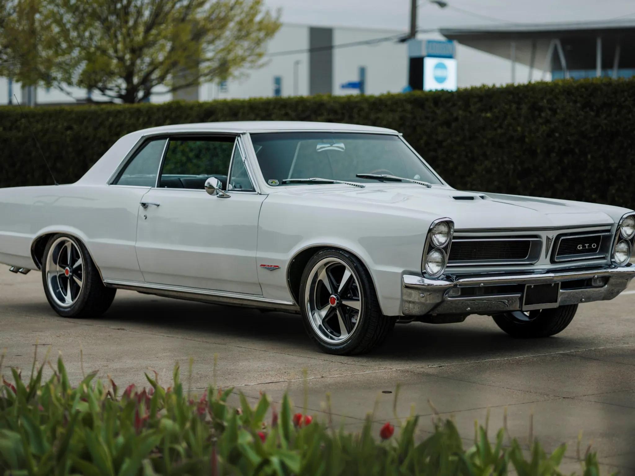 This 1965 Pontiac LeMans hardtop coupe is powered by a 5.7-liter LS1 V8 paired with a 4L60E four-speed automatic transmission and a 10-bolt rear axle. The car is finished in white with black vinyl upholstery and features a hood scoop, GTO badging, stacked headlights, dual mirrors, chrome bumpers, polished rocker moldings, and a dual-exit exhaust system.