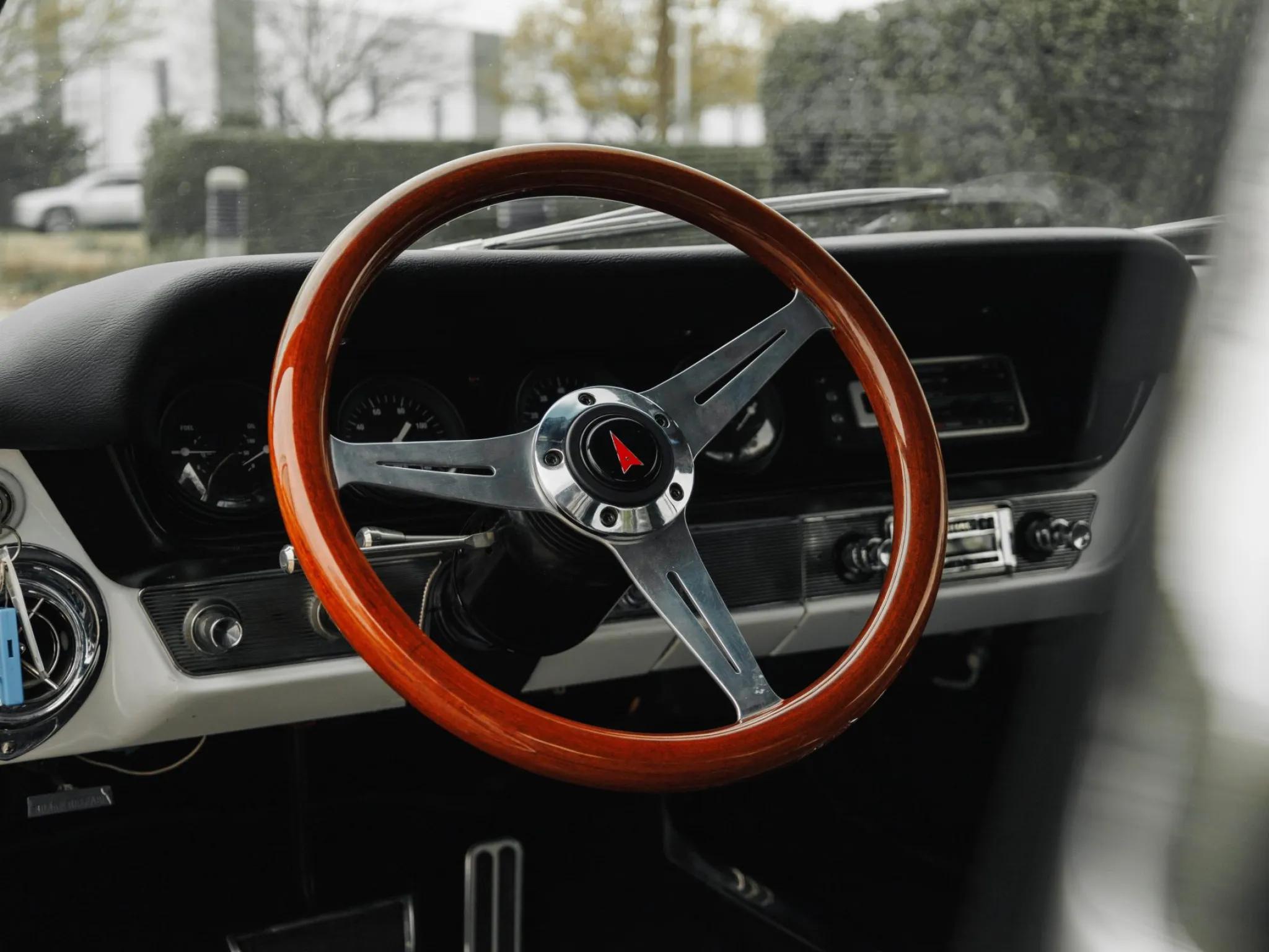 The cabin features front bucket seats and a rear bench trimmed in black vinyl with Pontiac logos. Interior appointments include a center console, Lokar shifter, engine-turned dashboard trim, lap belts, and a retro-style digital stereo with Bluetooth capability. Vintage Air climate control and aftermarket speakers are also installed. The wood-rimmed billet steering wheel fronts a Classic Instruments GPS speedometer, tachometer, and auxiliary gauges for coolant temperature, battery voltage, oil pressure, and fuel level.