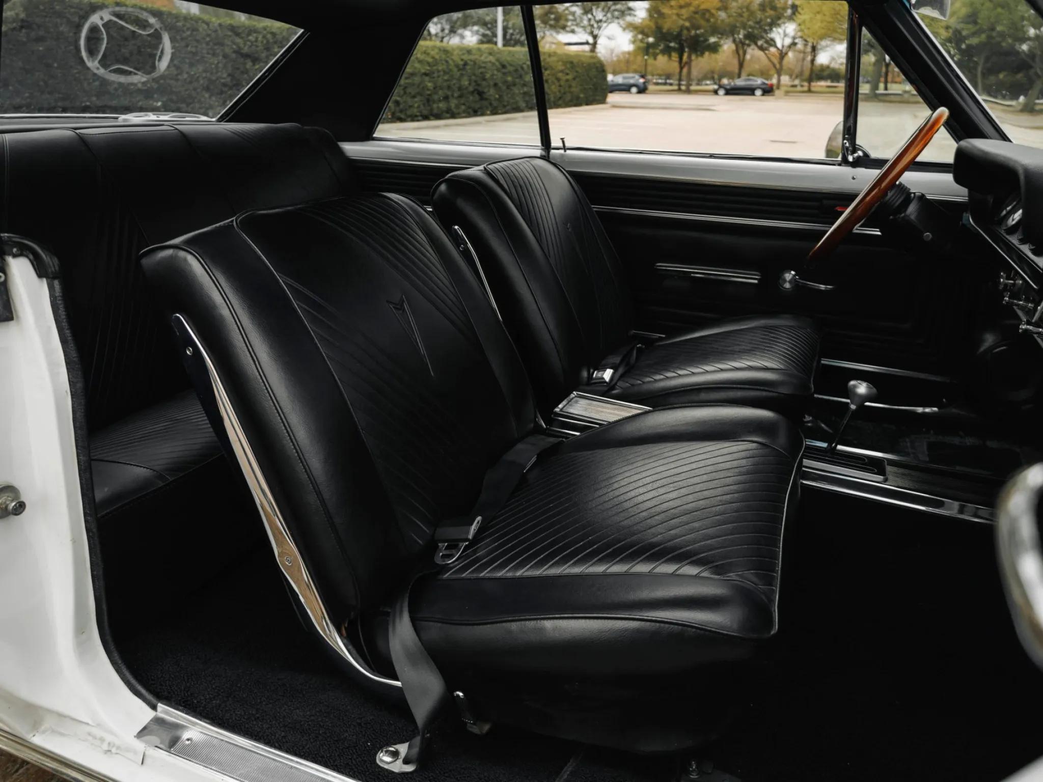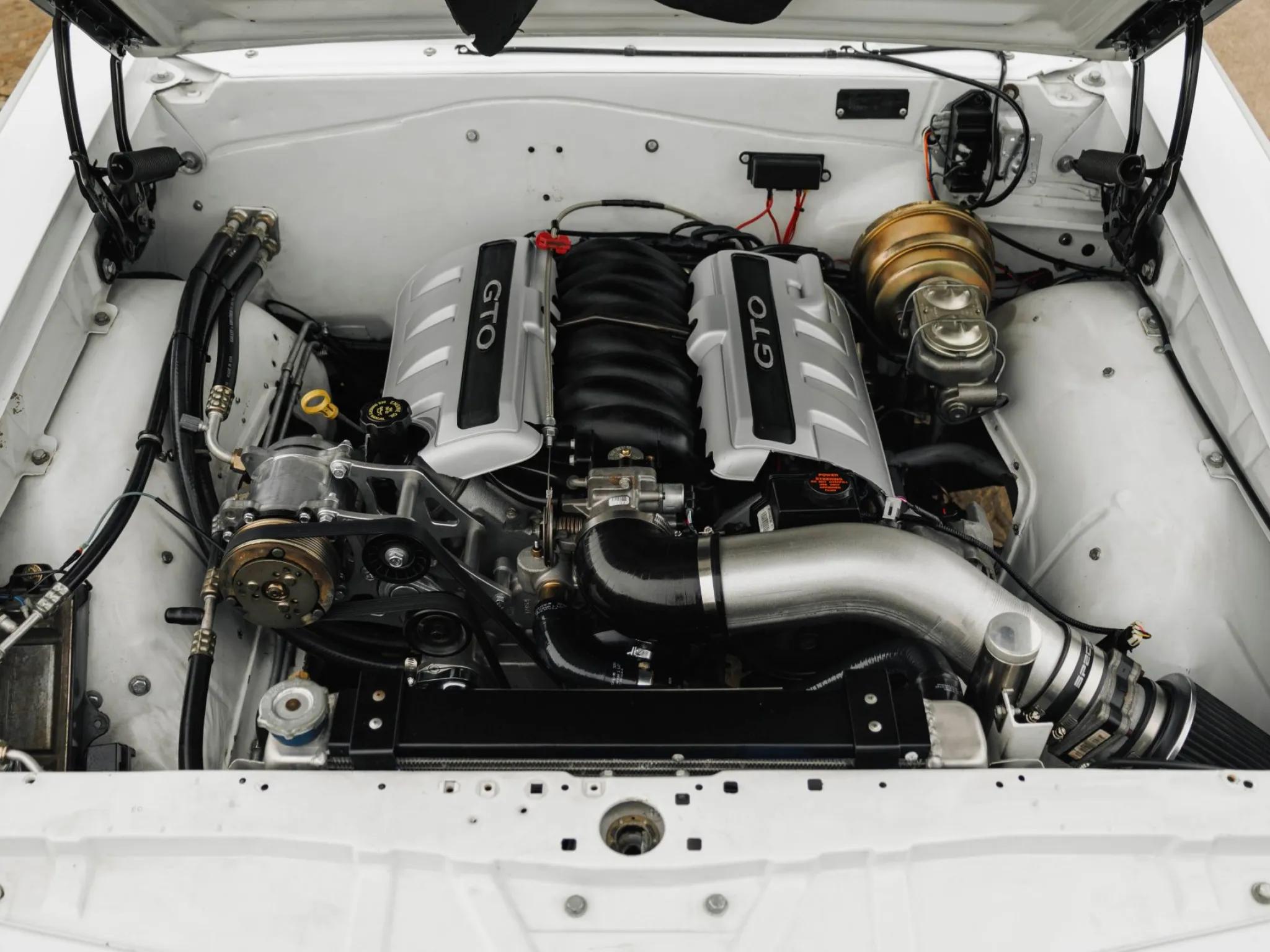 The LS1 V8 features GTO-branded coil covers, Holley ceramic-coated headers, and a custom air intake system with a conical air filter. Cooling is provided by a four-core aluminum radiator with a Derale electric fan. Power is sent to the rear wheels through a 4L60E automatic transmission and a 10-bolt rear axle. The car is also equipped with a dual exhaust system featuring electrically controlled cut-outs.