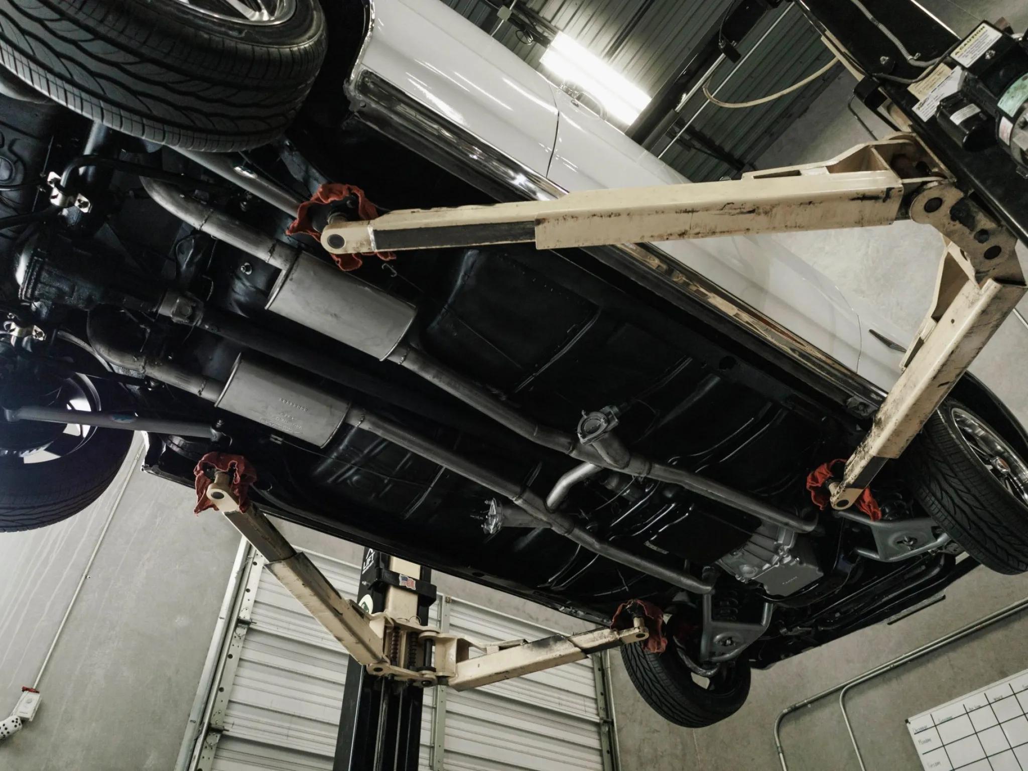 Aluminum 18" Year One Rally-style wheels are fitted with LingLong Crosswind tires measuring 235/45 front and 255/45 rear. The car is equipped with a Classic Performance Products four-link rear suspension, tubular front control arms, adjustable Viking coilovers, and power steering. Braking is provided by power-assisted front drilled and slotted discs and factory-style rear drums.