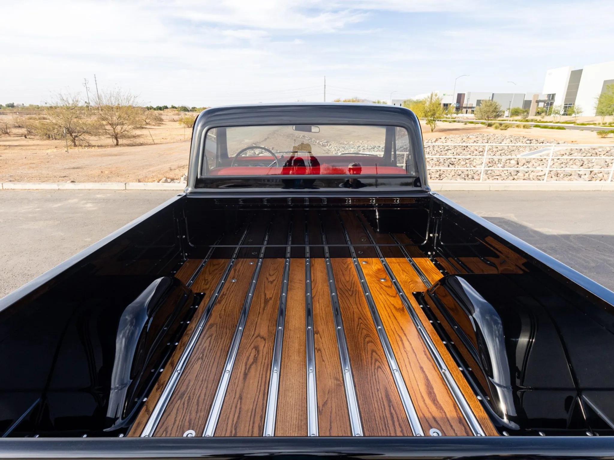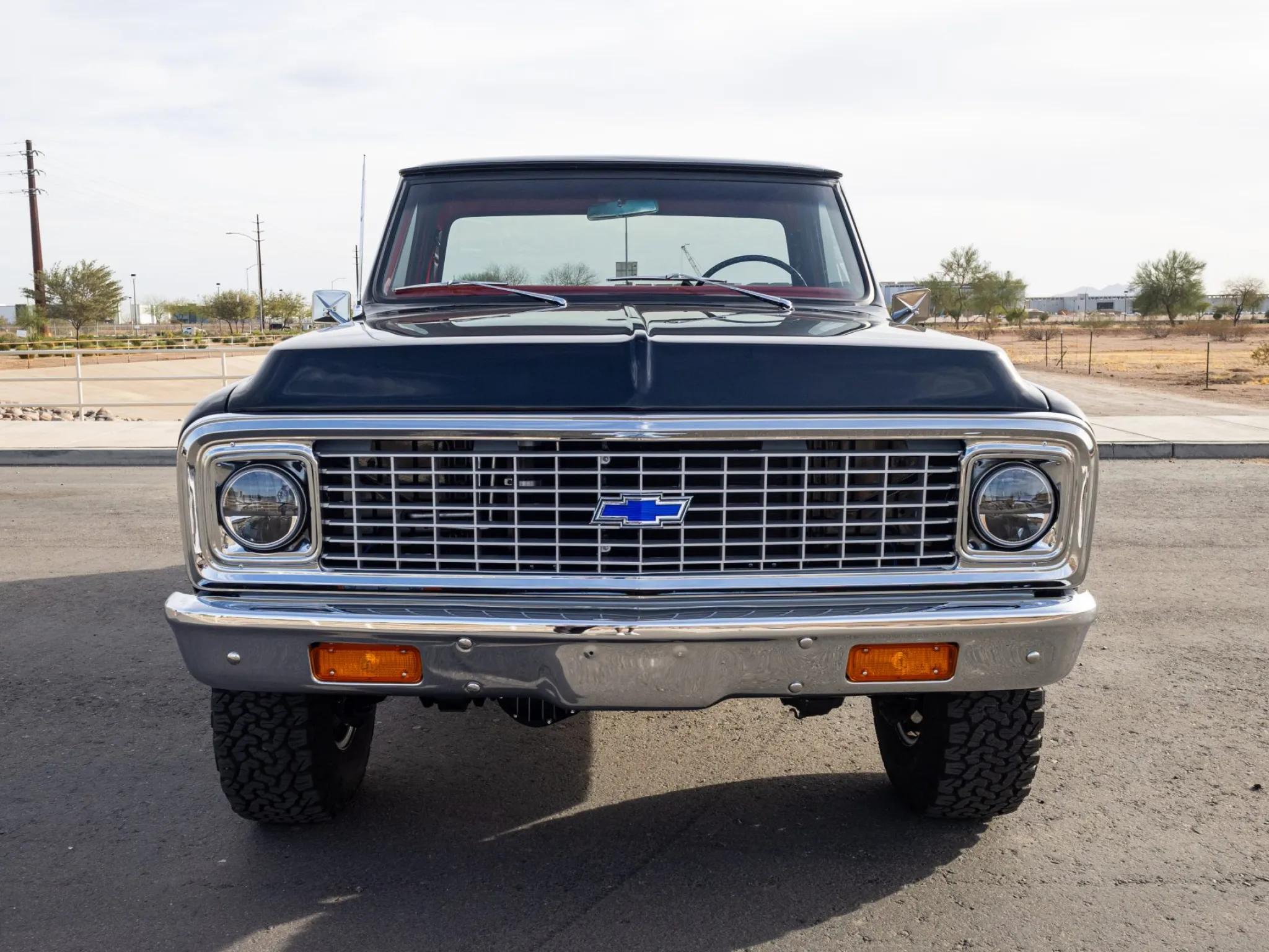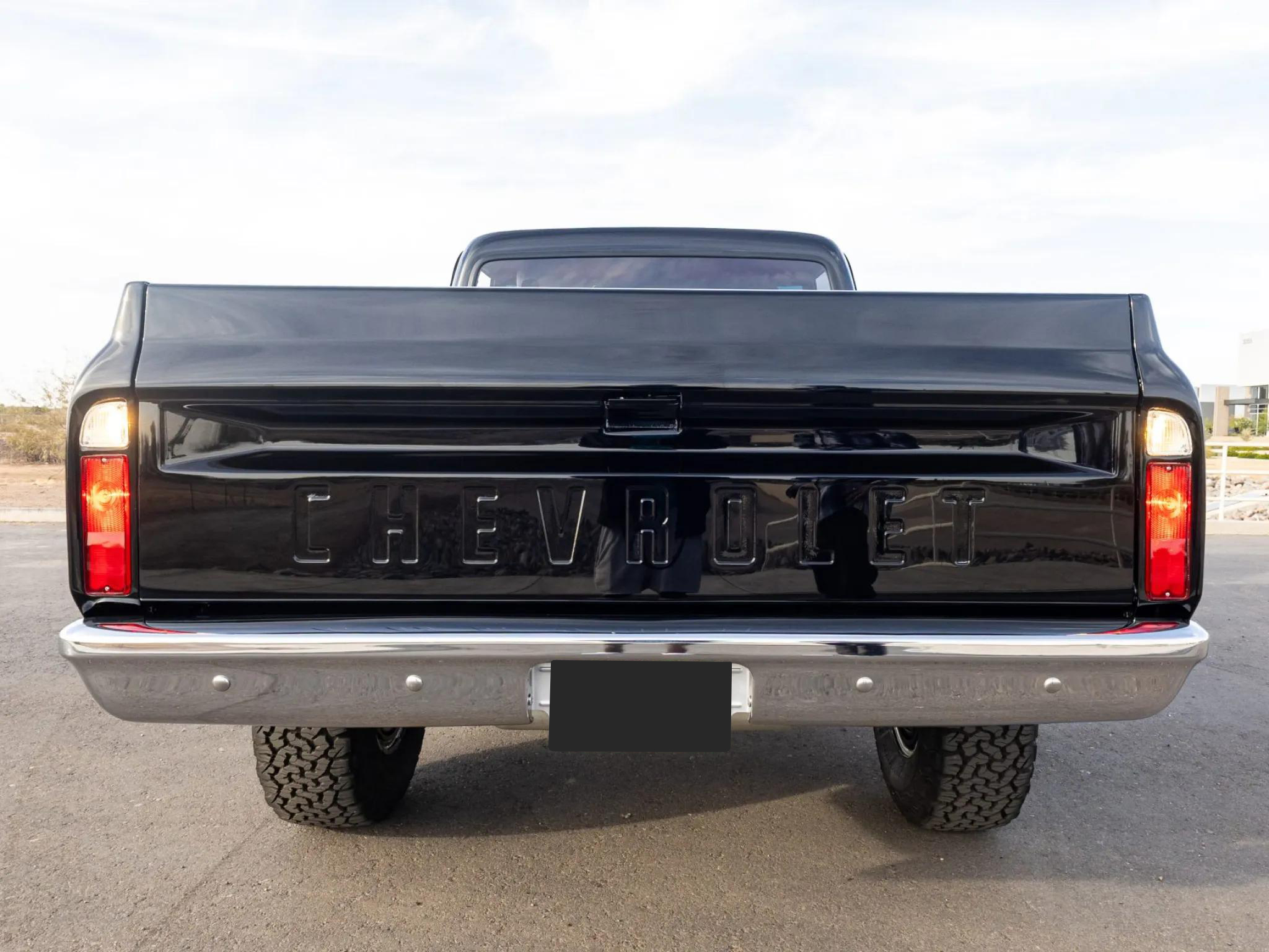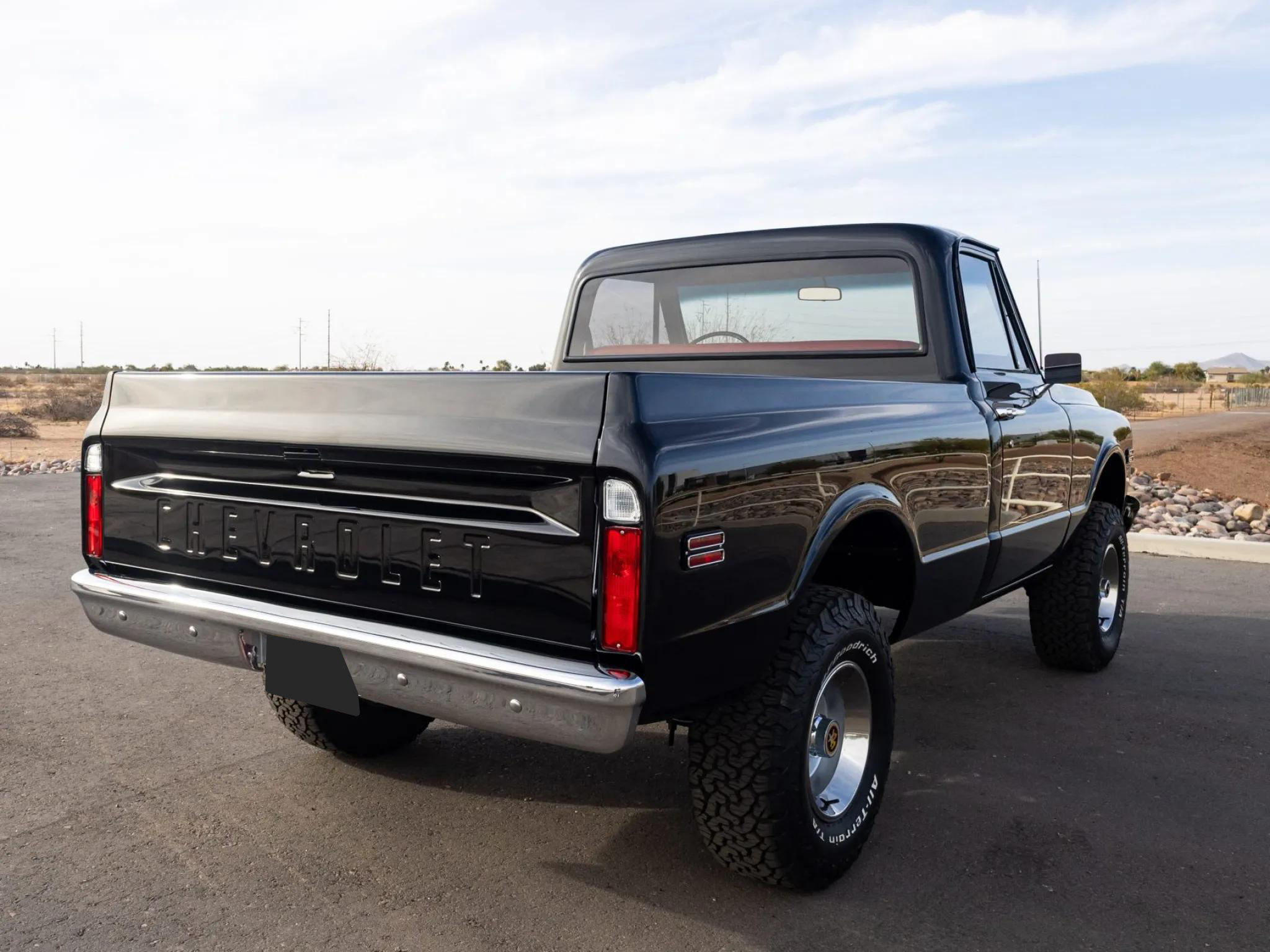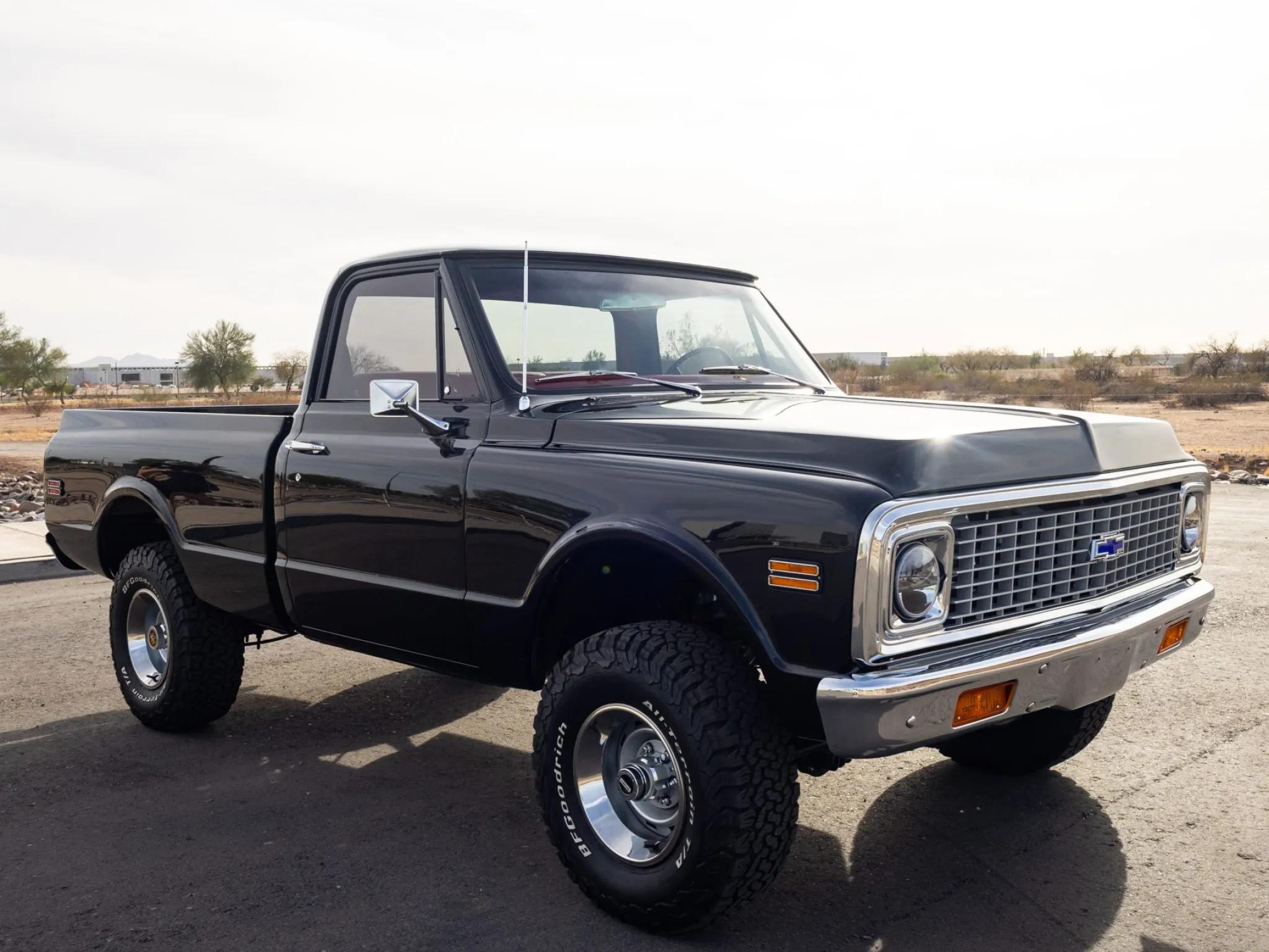 This 1971 Chevrolet K10 4�4 pickup is finished in black with a wood bed floor featuring integrated fuel filler and polished metal runners. The exterior details include a chrome grille and bumpers, dual side mirrors, and LED headlights. Silver-finished 15" Rally wheels are mounted with 32�11.5" BFGoodrich All-Terrain T/A KO2 tires. The truck is equipped with power steering, Warn manually locking front hubs, and power-assisted front disc and rear drum brakes.