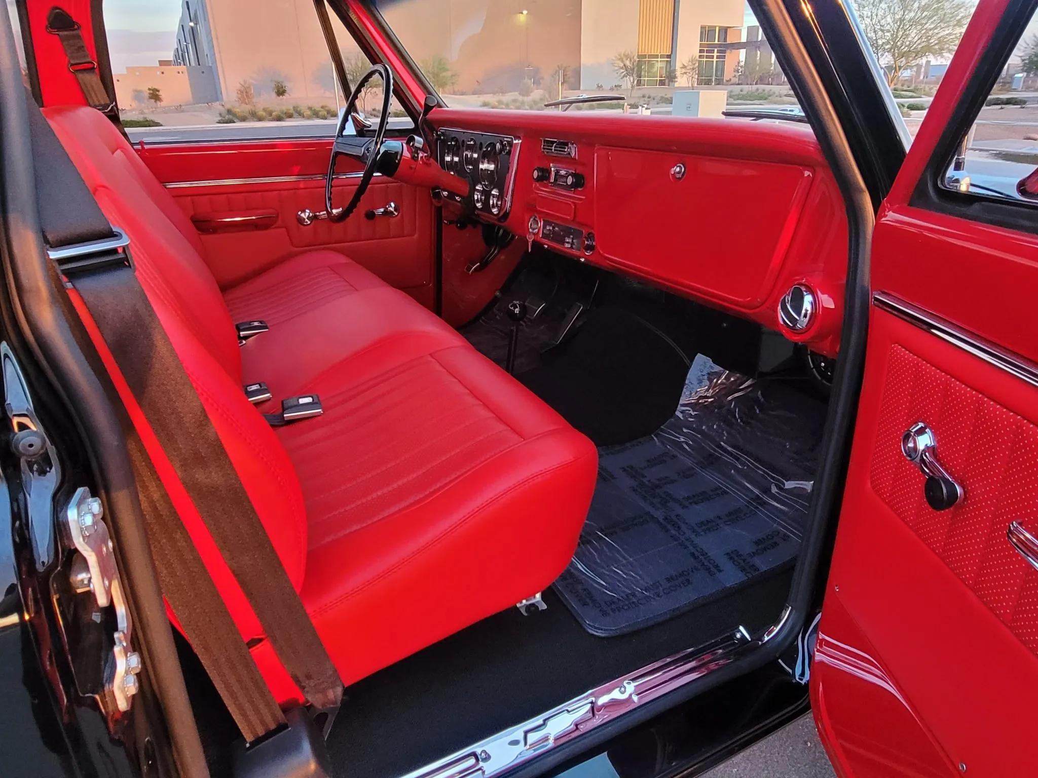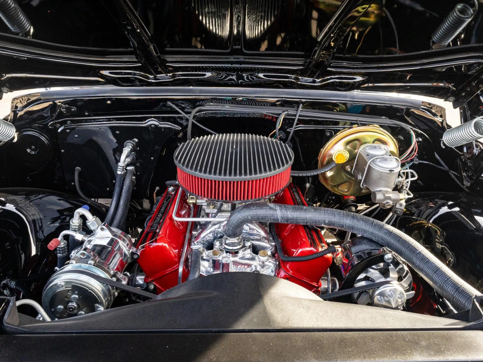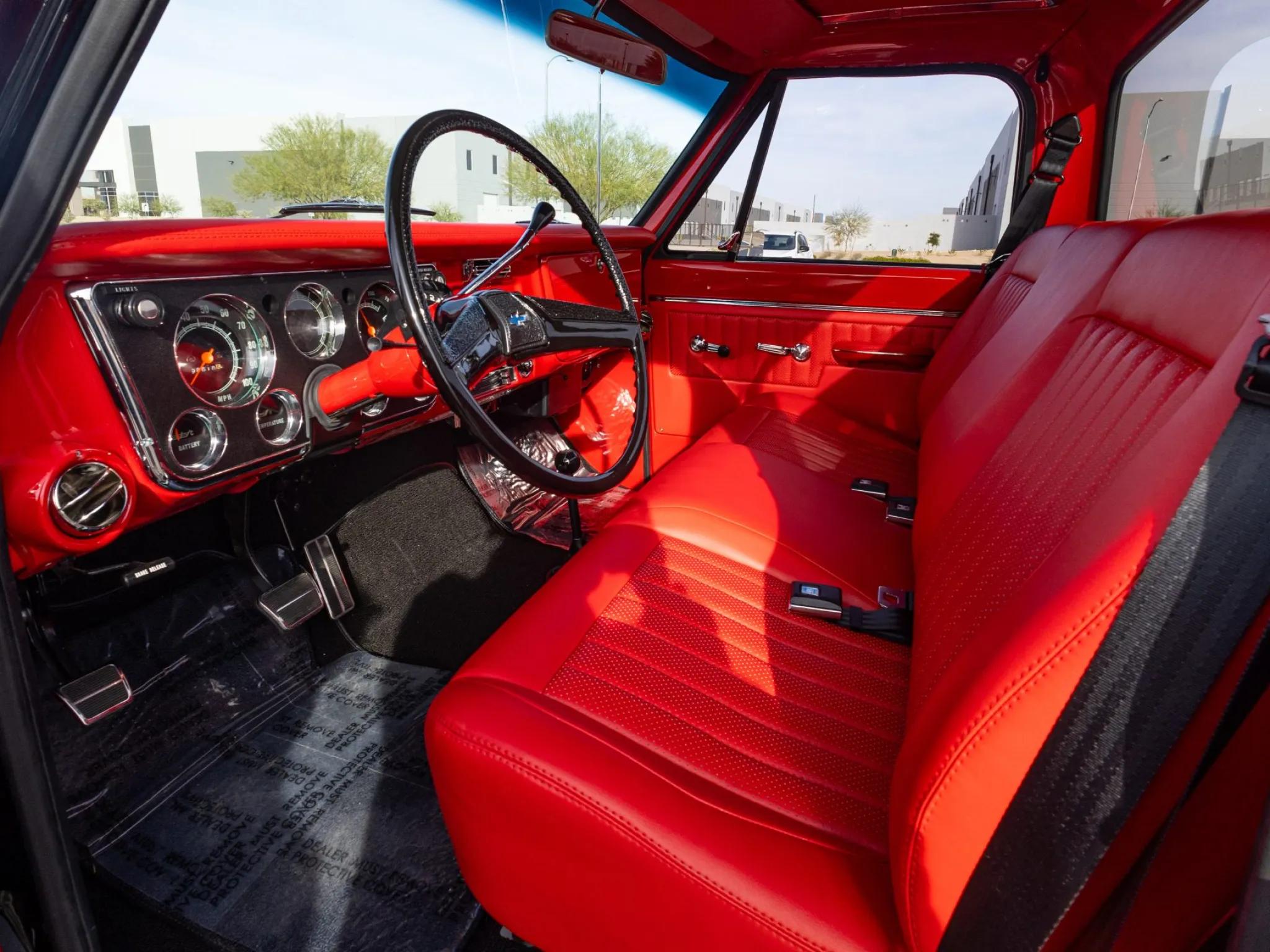 The interior features a bench seat upholstered in Red Torchfire vinyl, with matching dash pad, headliner, sun visors, door panels, and black carpets. Appointments include Vintage Air climate control, a retro-style digital radio, polished door sill plates, and a two-spoke steering wheel framing a 100-mph speedometer and auxiliary gauges for fuel level, battery voltage, coolant temperature, and oil pressure.