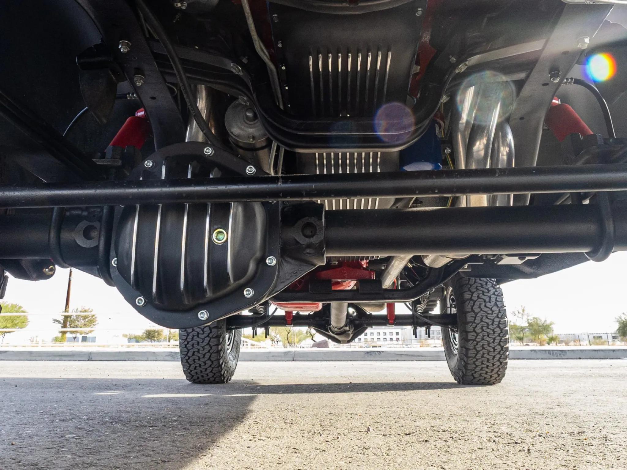 The 350ci V8 was rebuilt and is equipped with four-bolt main bearings, an Edelbrock carburetor and intake manifold, finned air cleaner housing, HEI distributor, chrome alternator, long-tube exhaust headers, Chevrolet-branded valve covers, and MSD ignition wires. Cooling is handled by a replacement radiator core support. Power is sent to the rear or all four wheels through a three-speed Turbo Hydramatic automatic transmission, a dual-range transfer case, a Dana 44 front axle, and a 12-bolt rear axle with 3.73:1 gears. The frame has been sandblasted and powder-coated, and an aftermarket transmission oil pan and differential covers are installed.