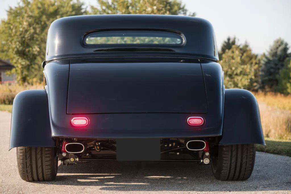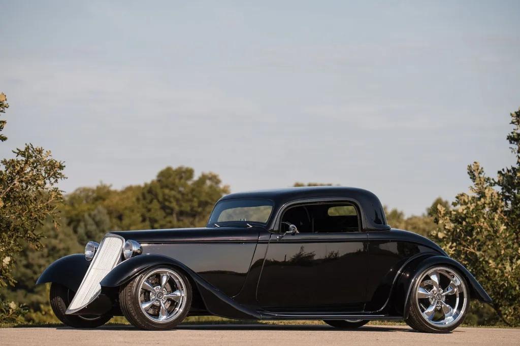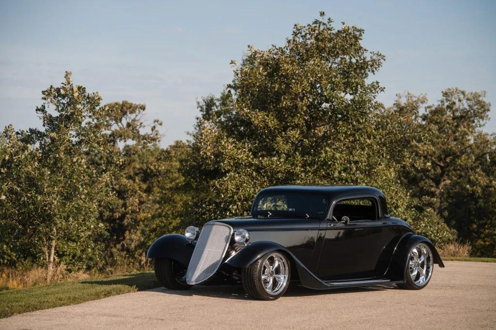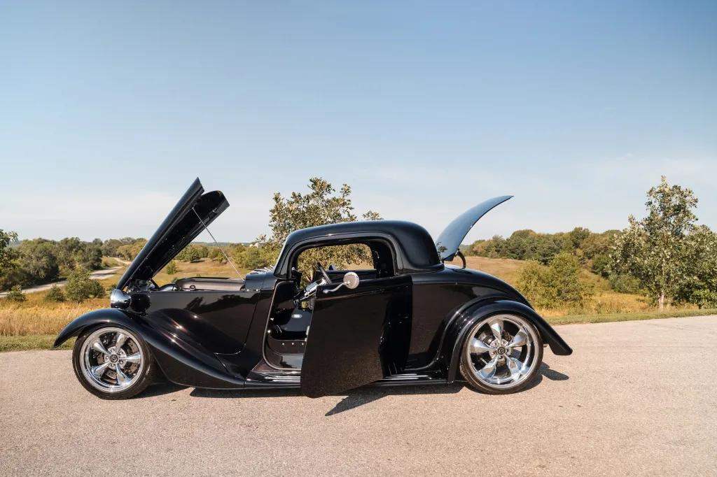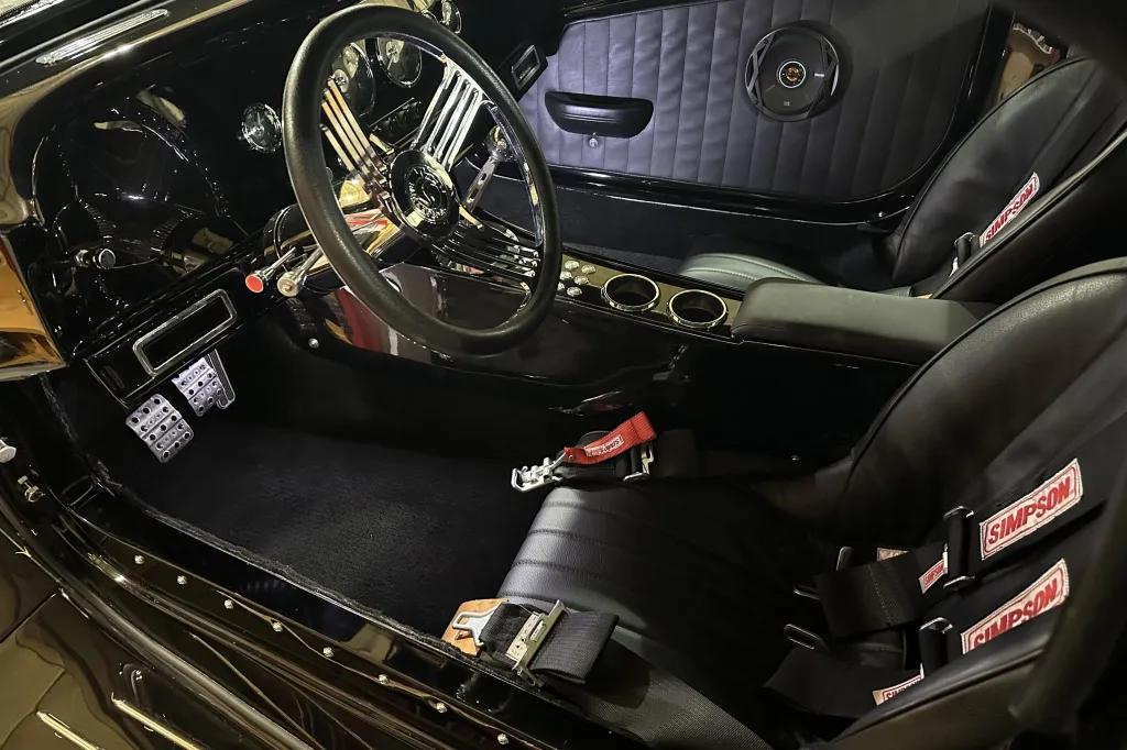 Finished in black with a red pearl effect over black vinyl, this Factory Five Racing 33 Hot Rod is powered by a 5.0-liter Ford Coyote V8 paired with a Tremec TKO 600 five-speed manual transmission. The original 33 Ford steel body is mounted to a steel box-frame chassis and features a removable steel roof, rear-hinged doors, and LED lighting.